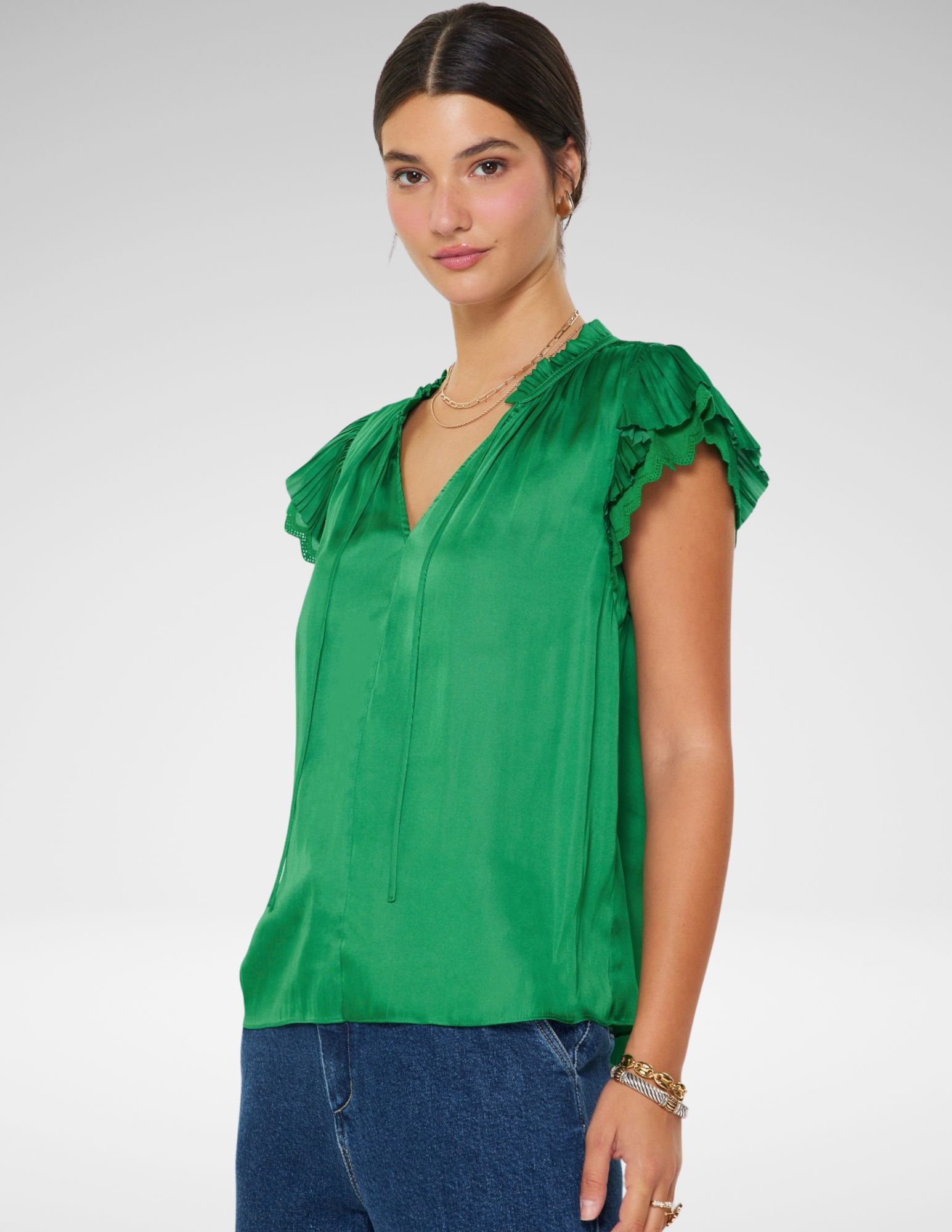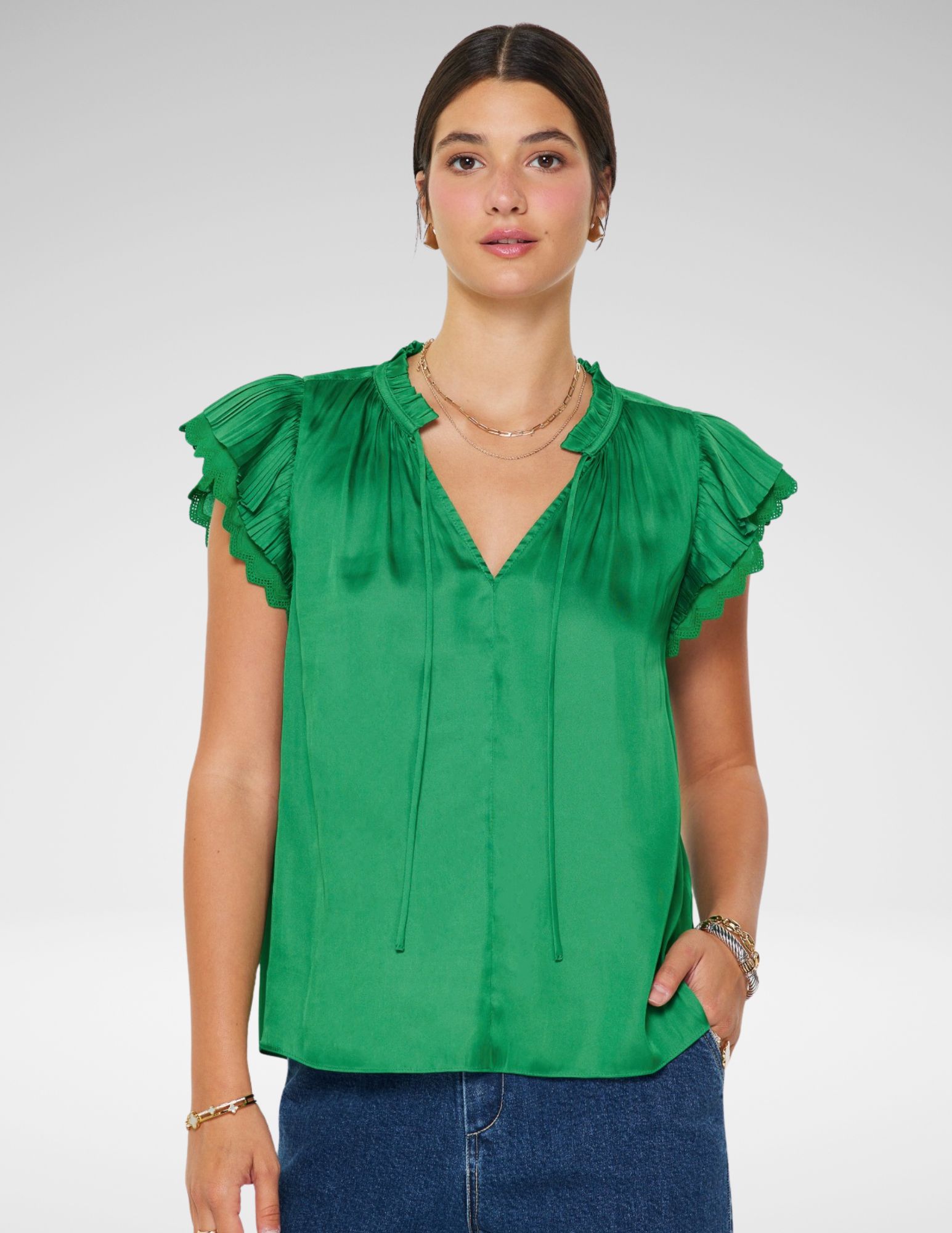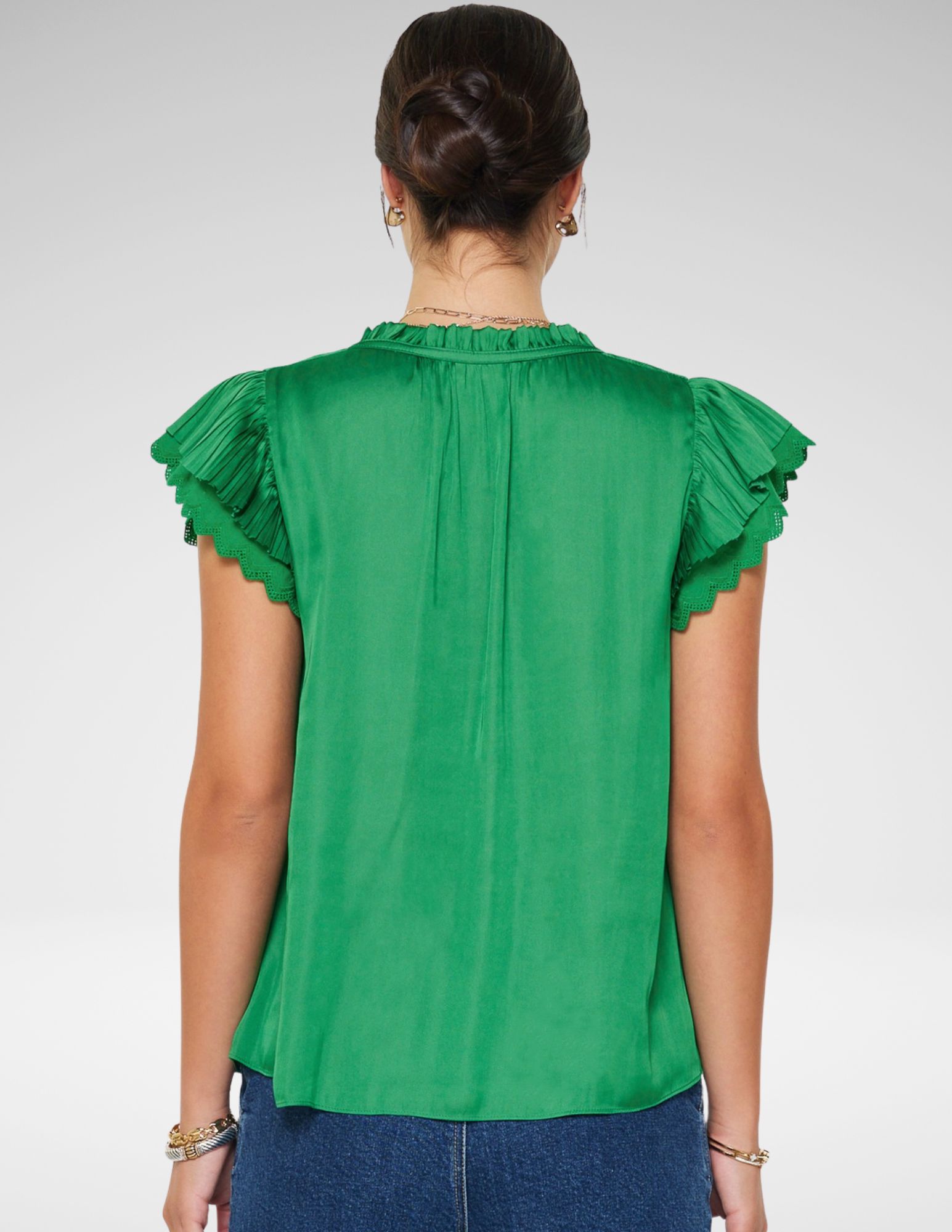 Esta blusa en un tono verde brillante es la combinación perfecta de sofisticación. Confeccionada en un tejido satinado de caída ligera, su diseño destaca por un juego de texturas y volúmenes que elevan cualquier conjunto, desde un look de oficina hasta una salida nocturna.