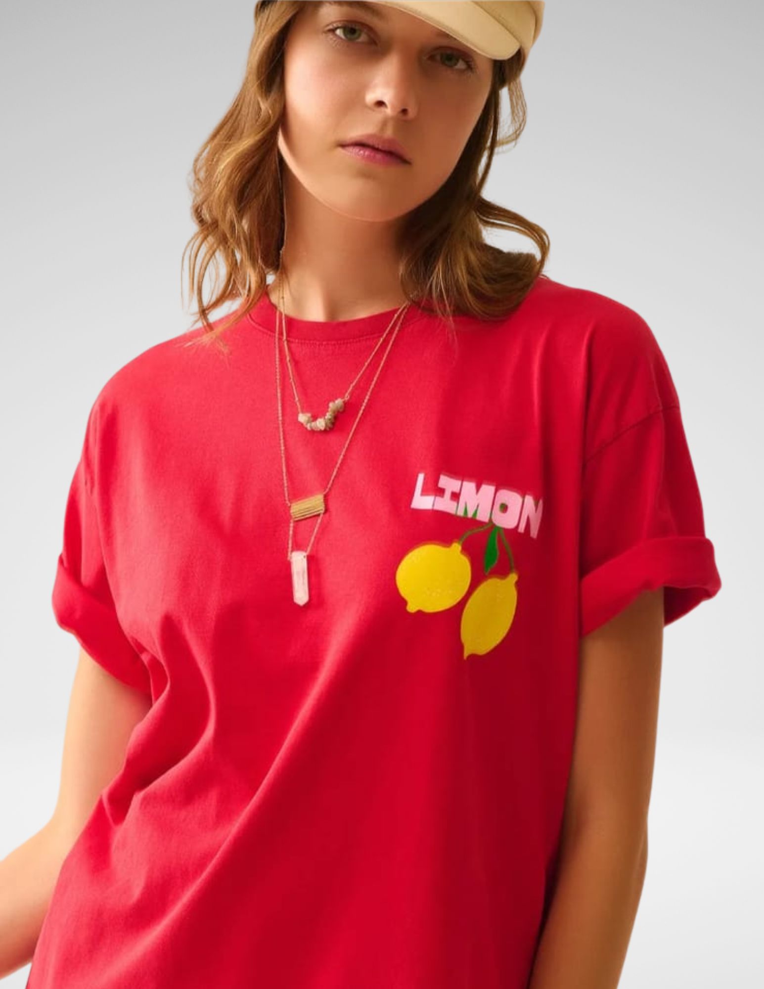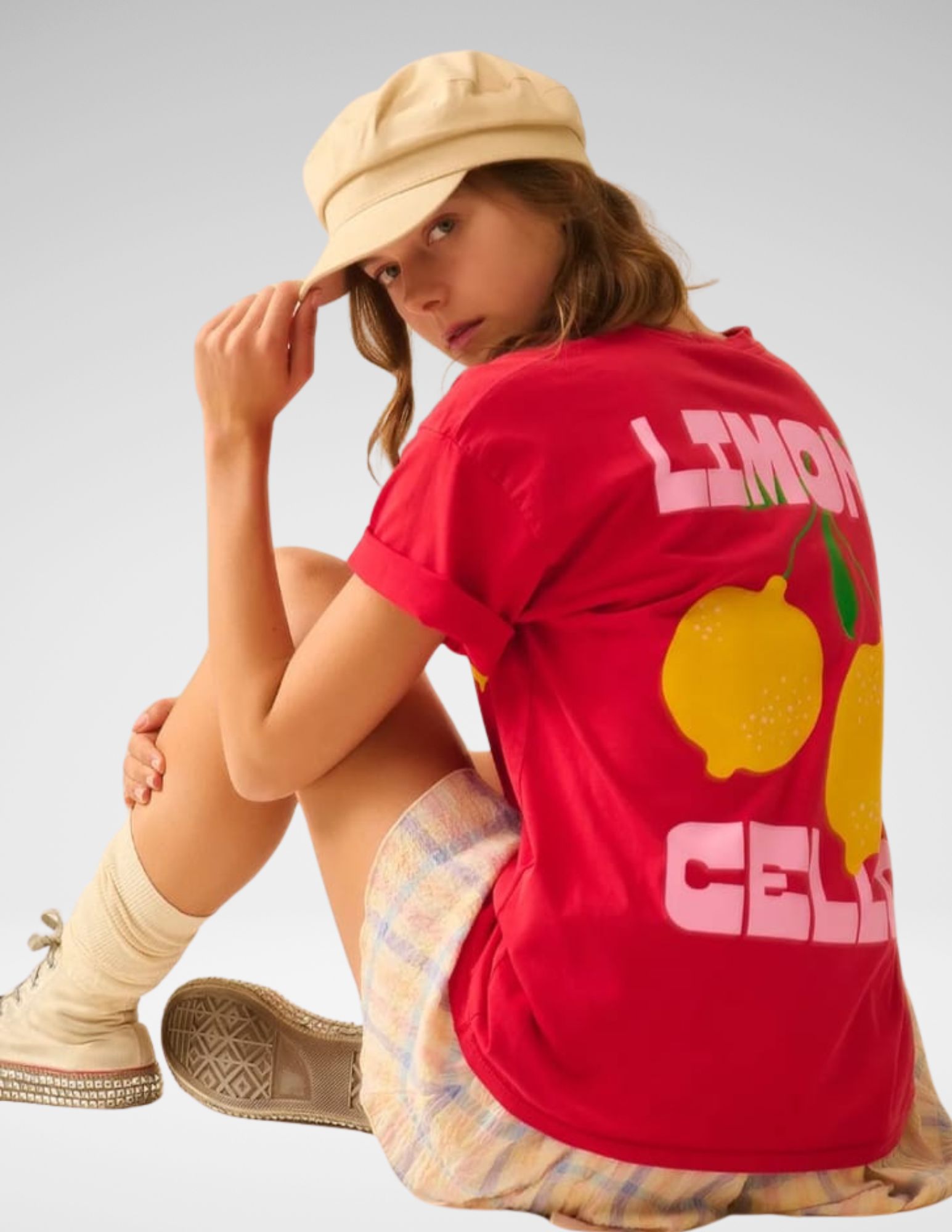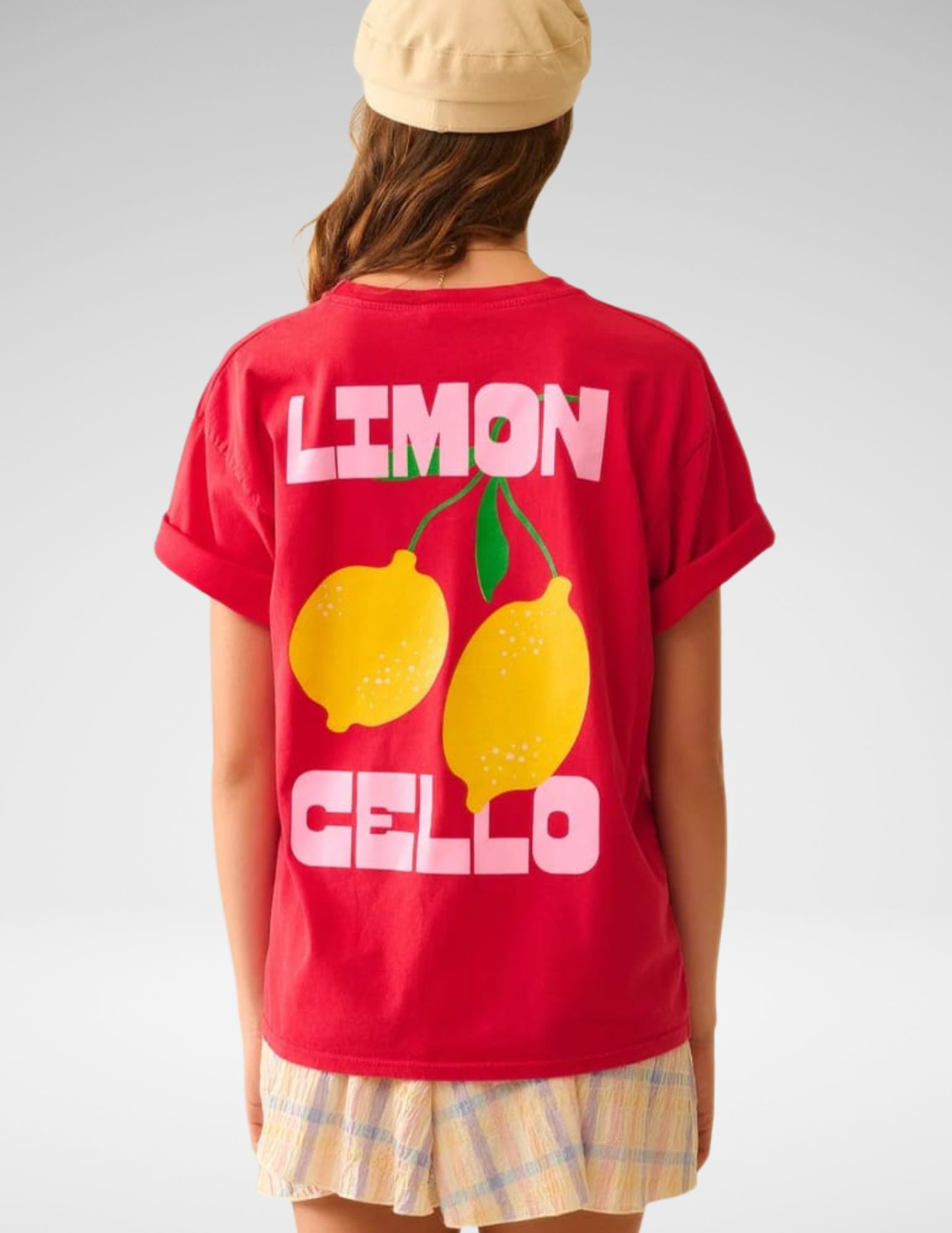 Un diseño divertido y lleno de energía que evoca las tardes de verano. Presenta un estampado trasero de alto impacto con dos limones ilustrados y la palabra “LIMON CELLO” en tipografía rosa pastel, creando un contraste moderno sobre el fondo rojo.