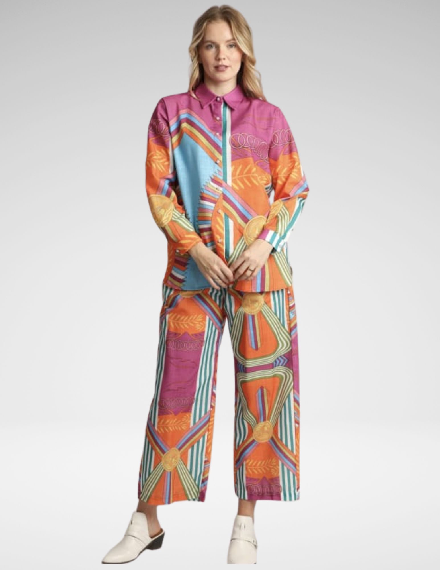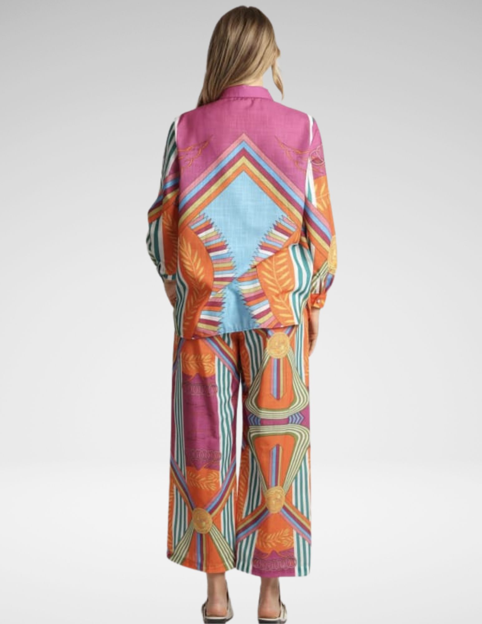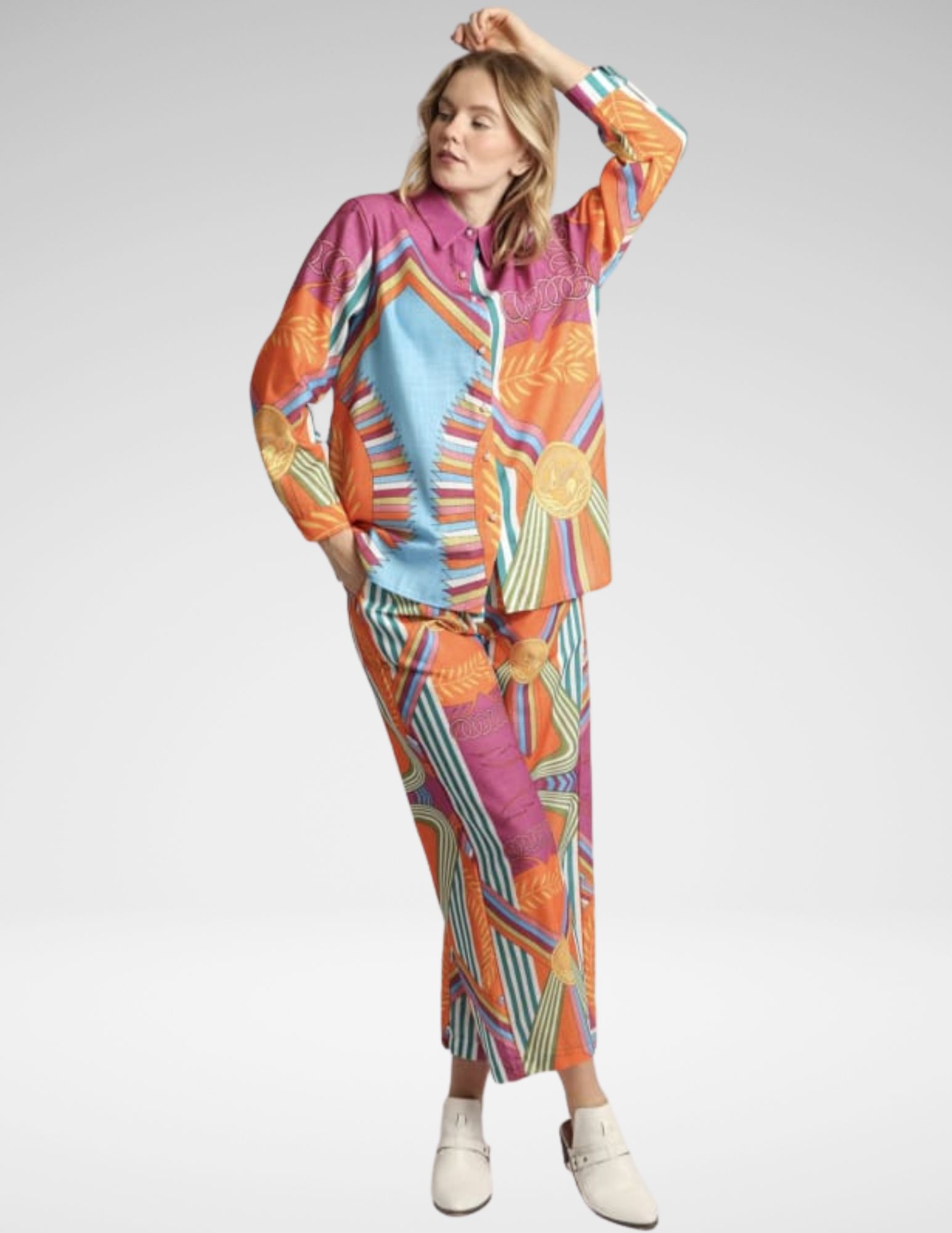 Este set de dos piezas es una declaración de estilo audaz que fusiona la comodidad del corte oversized con una estética visual vibrante y llena de energía. El conjunto destaca por su diseño maximalista, ideal para quienes buscan un look de impacto que no pase desapercibido.