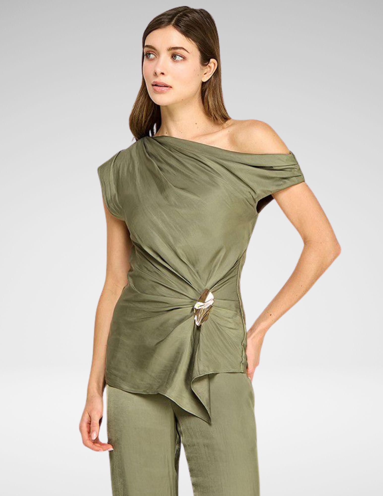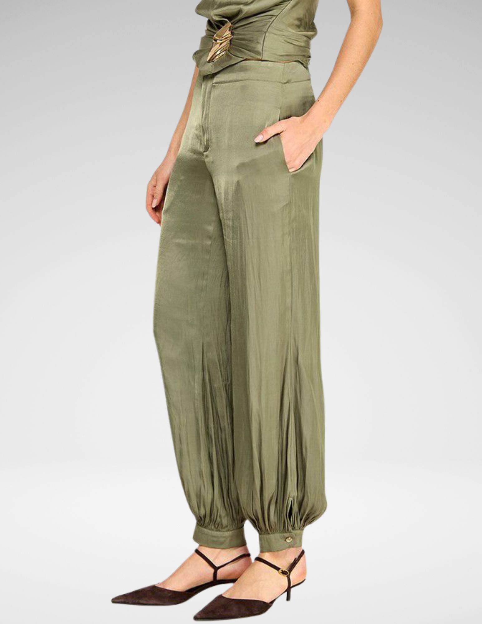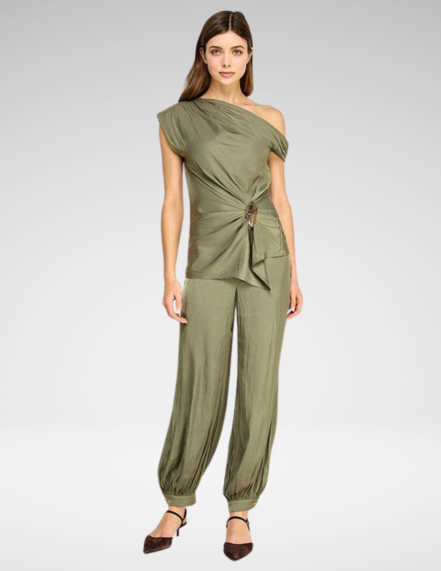 Este two-piece set en color verde oliva es una oda a la fluidez y al diseño arquitectónico suave. Confeccionado en un tejido satinado con un brillo sutil, este conjunto combina la comodidad de una silueta relajada con el impacto visual de los detalles drapeados de alta costura.