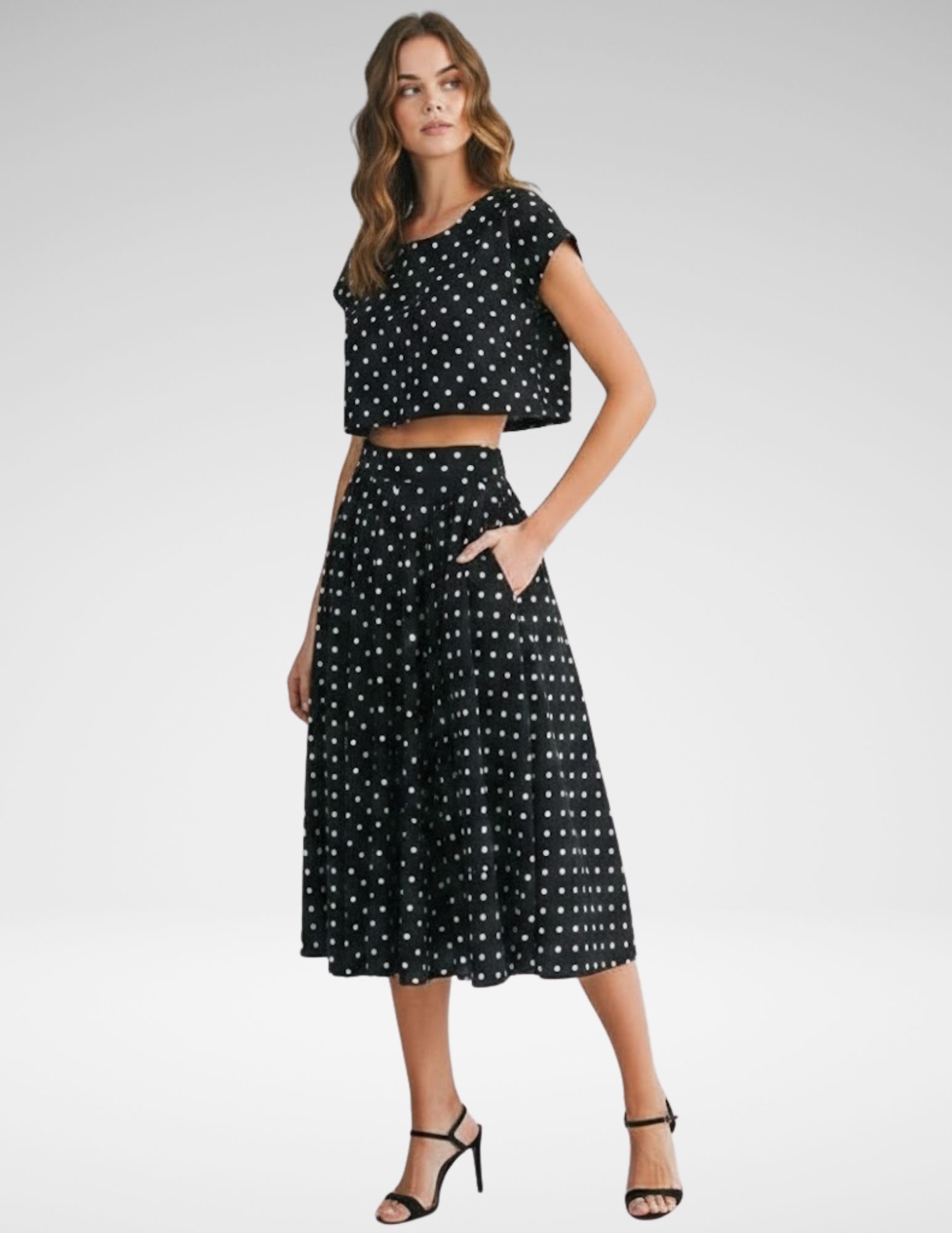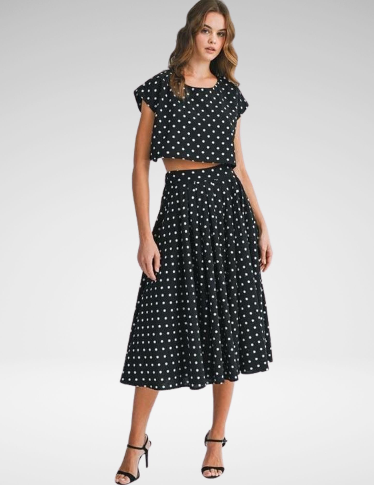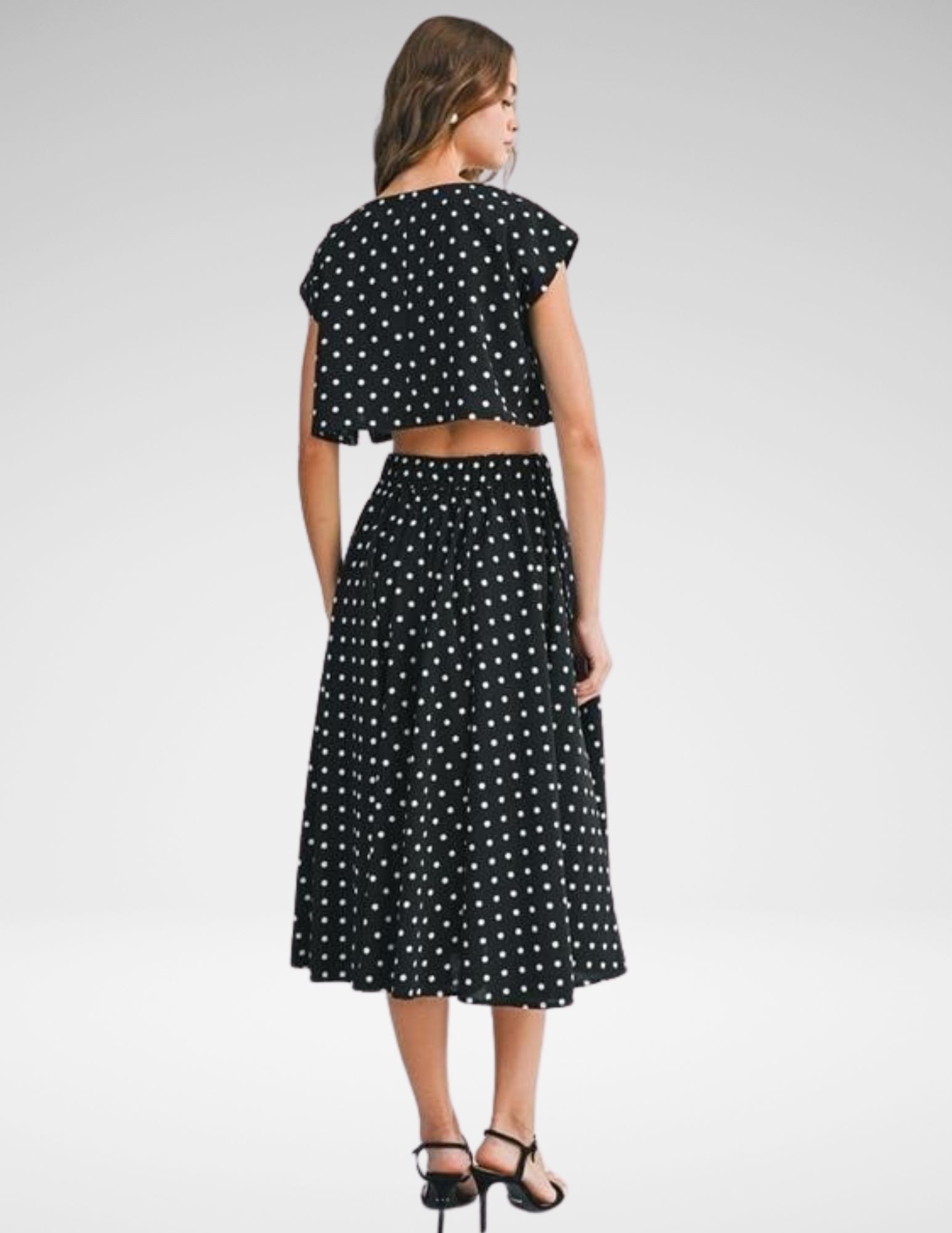 Este conjunto de dos piezas captura la esencia del estilo retro-moderno con un encantador estampado de lunares blancos sobre fondo negro. Diseñado para ofrecer una silueta femenina y equilibrada, es la opción perfecta para quienes buscan un look coordinado que sea a la vez divertido y sofisticado.