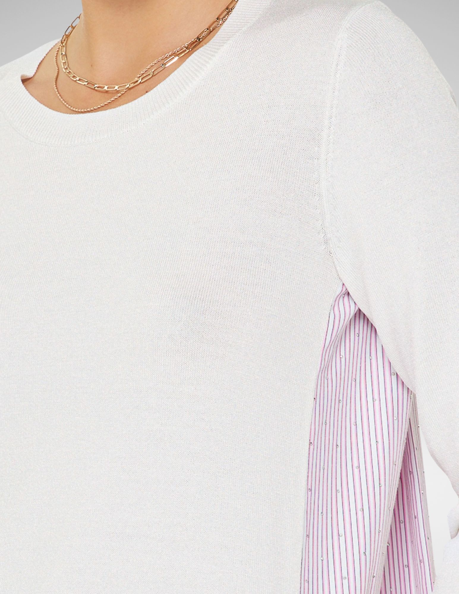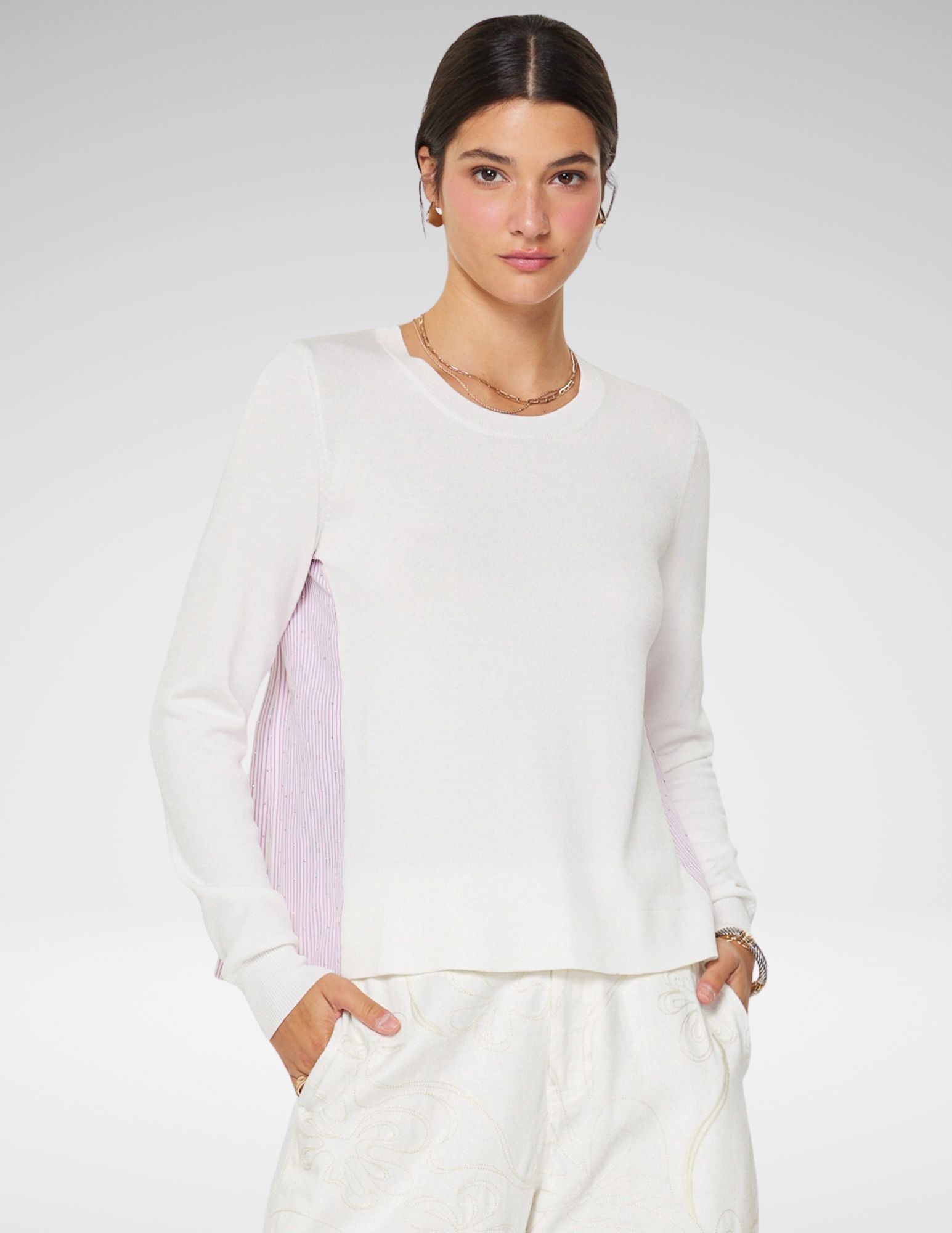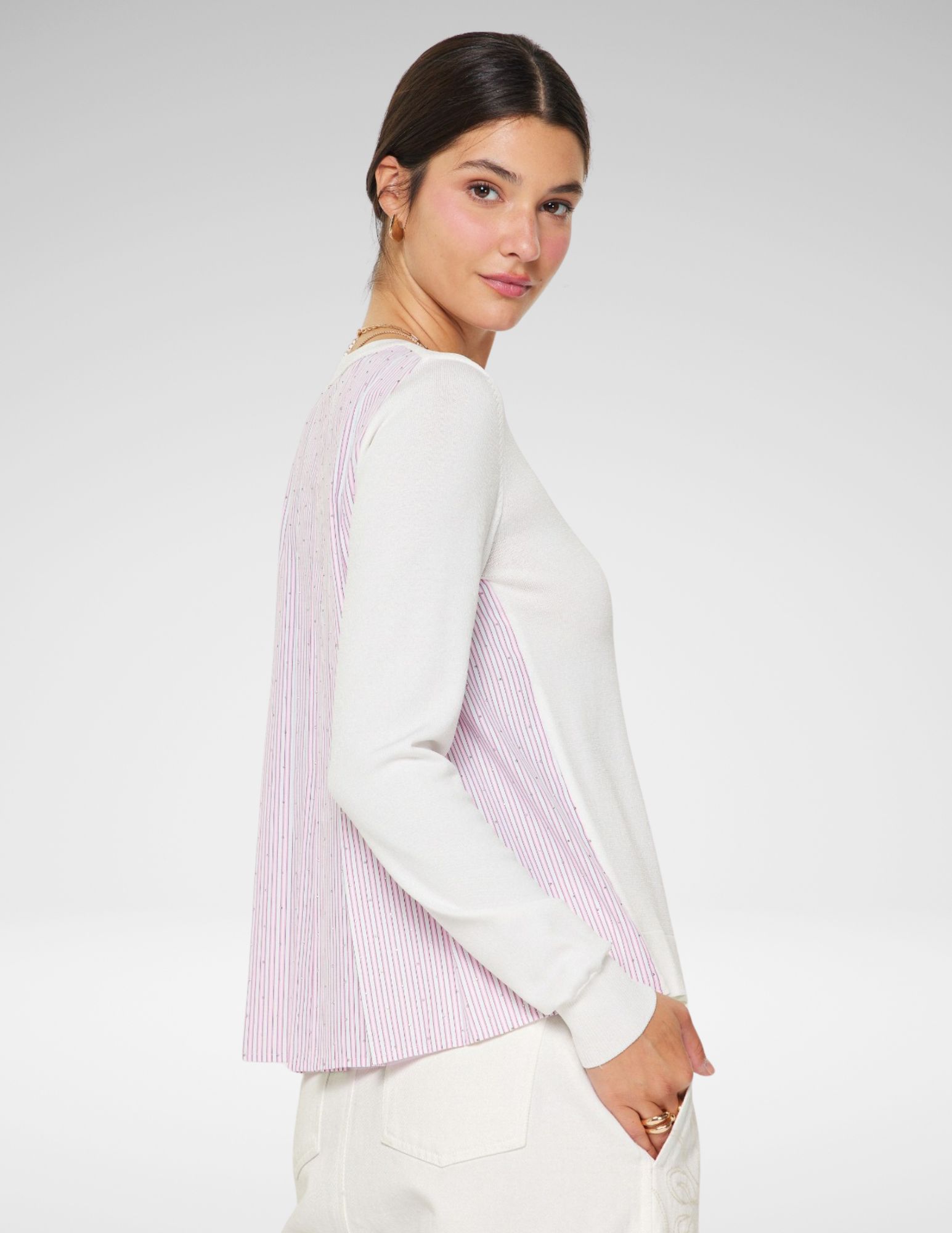 Este suéter de cuello redondo redefine el concepto de básico moderno mediante un diseño de texturas combinadas. Mientras que el frente presenta un tejido de punto fino en color blanco hueso, suave al tacto y de caída impecable, los laterales y la espalda sorprenden con un panel de popelina plisada en un delicado patrón de rayas milrayas (pinstripe).