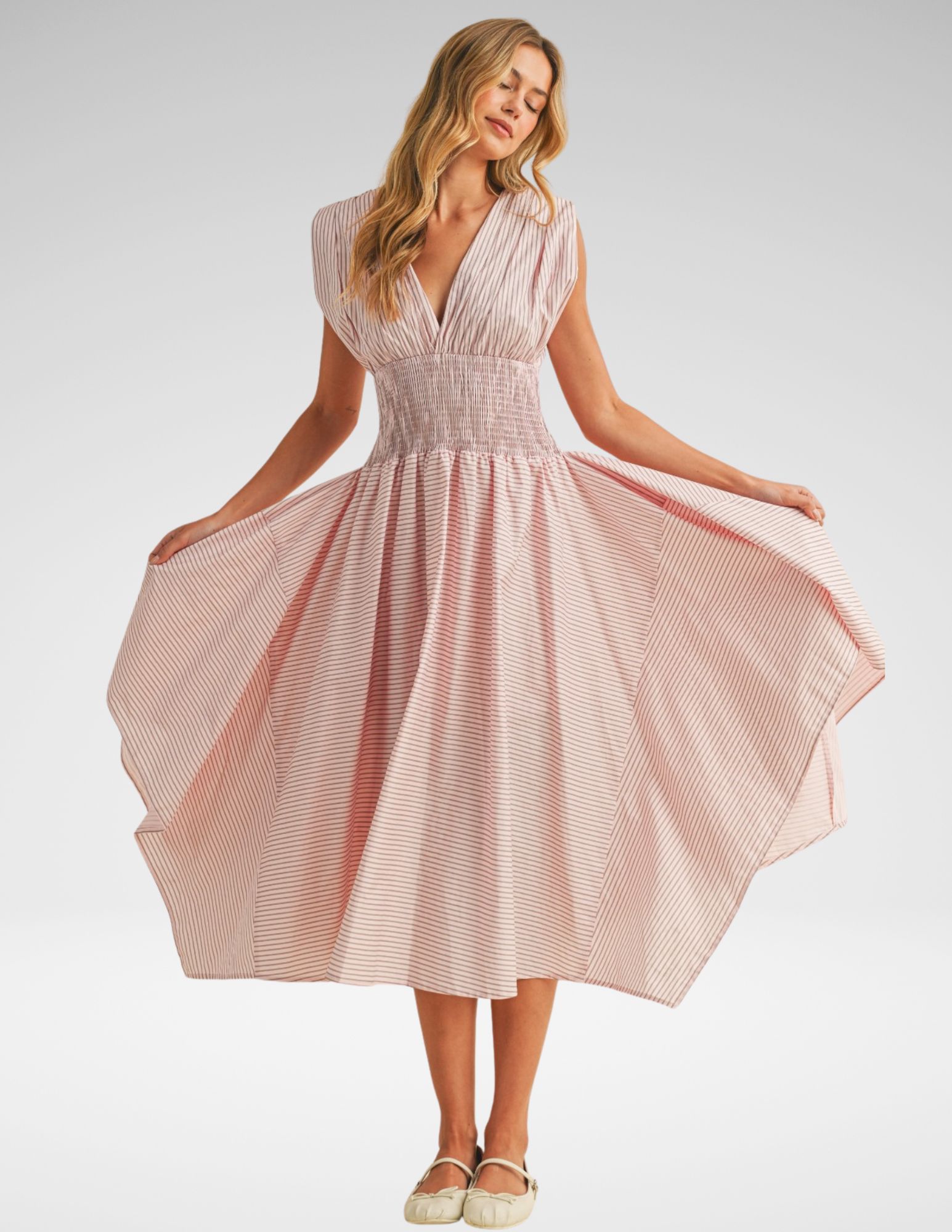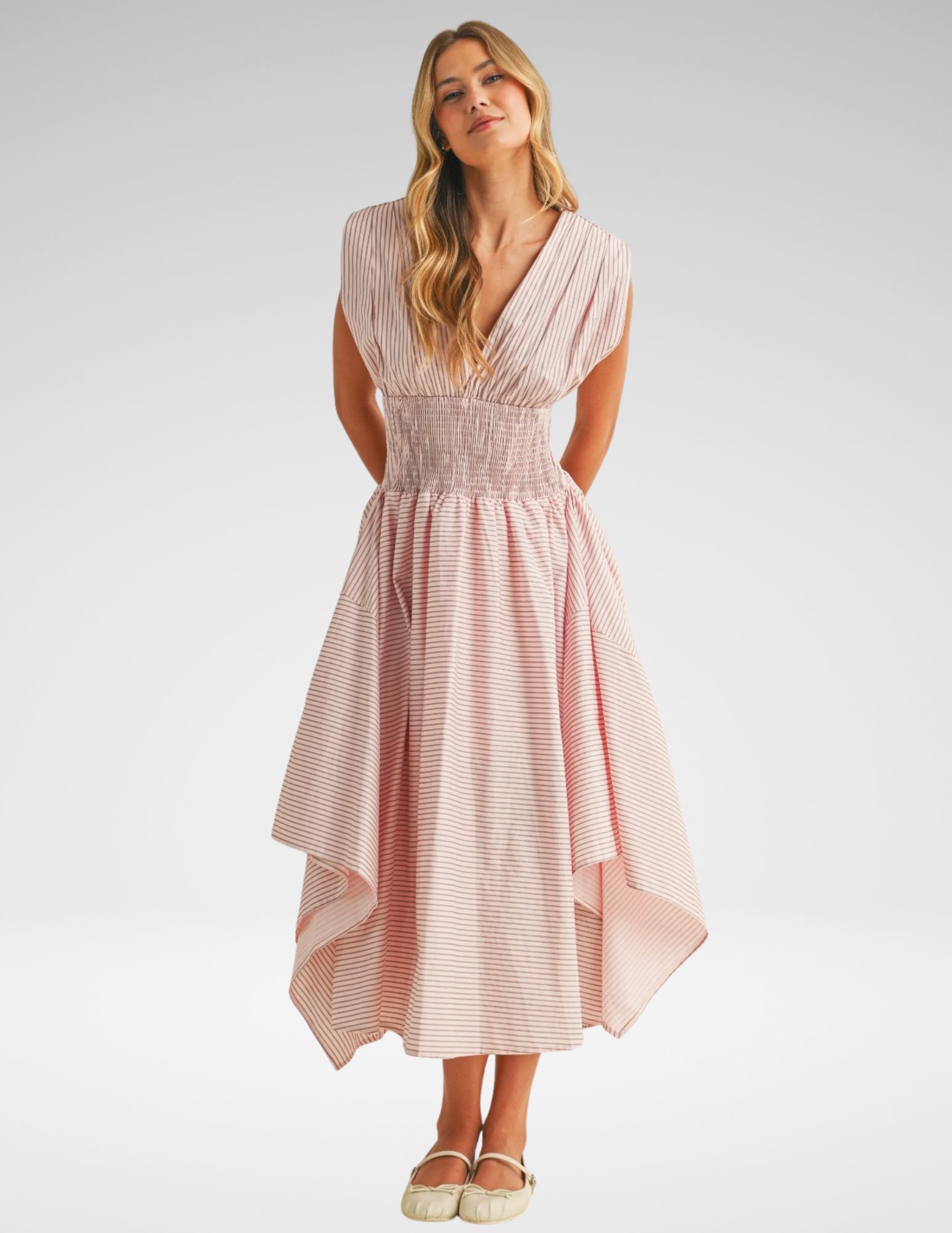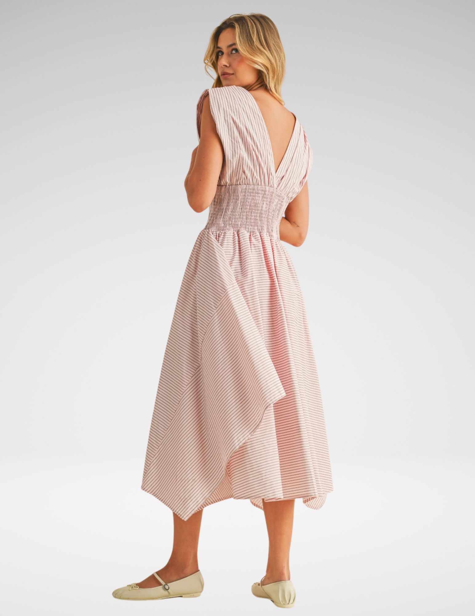 Descubre la fluidez y el encanto etéreo con nuestro vestido midi de diseño arquitectónico. Confeccionado en un tejido ligero con un delicado patrón de rayas horizontales en tonos rosados, esta pieza es la definición de la elegancia sin esfuerzo. Su silueta está diseñada para crear movimiento y resaltar la figura femenina de manera orgánica.