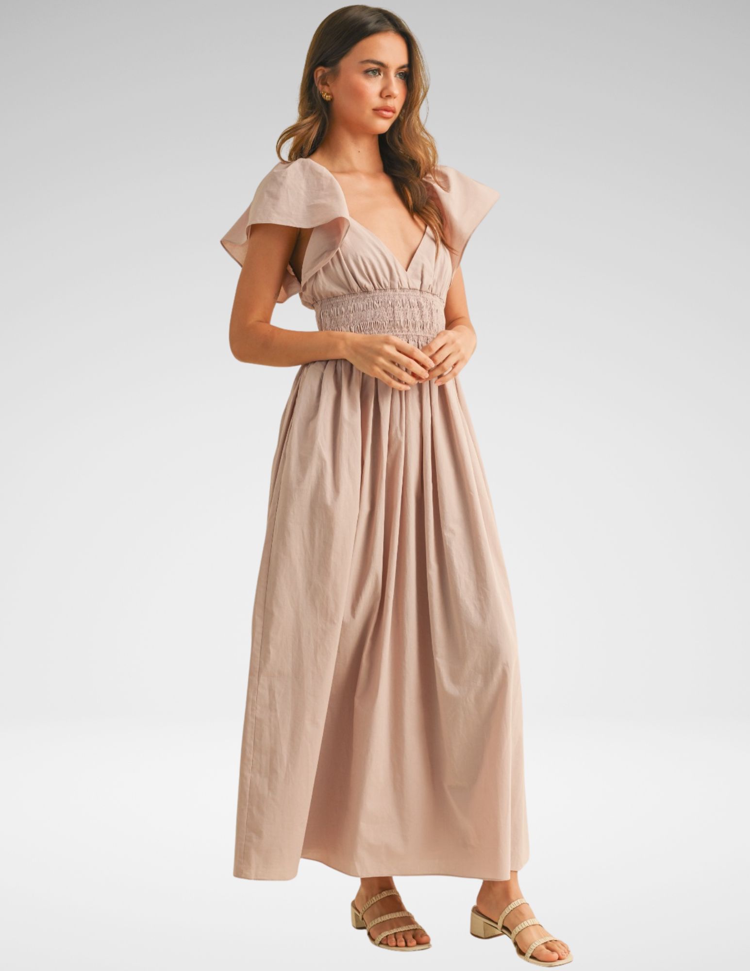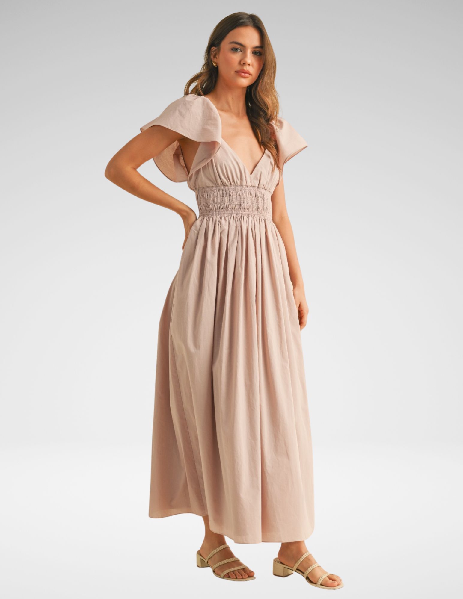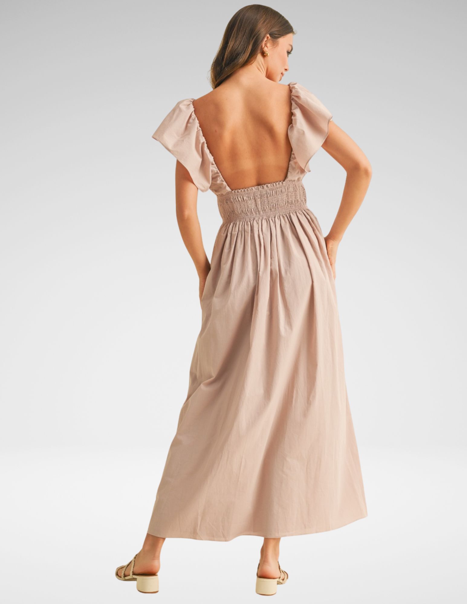 Este maxi vestido es la encarnación de la feminidad moderna y delicada. Confeccionado en un tejido de popelina de algodón ligero, su diseño se centra en el volumen y el movimiento suave. El tono malva sutil lo convierte en una pieza versátil para eventos de jardín, sesiones fotográficas de compromiso o una tarde de verano sofisticada.