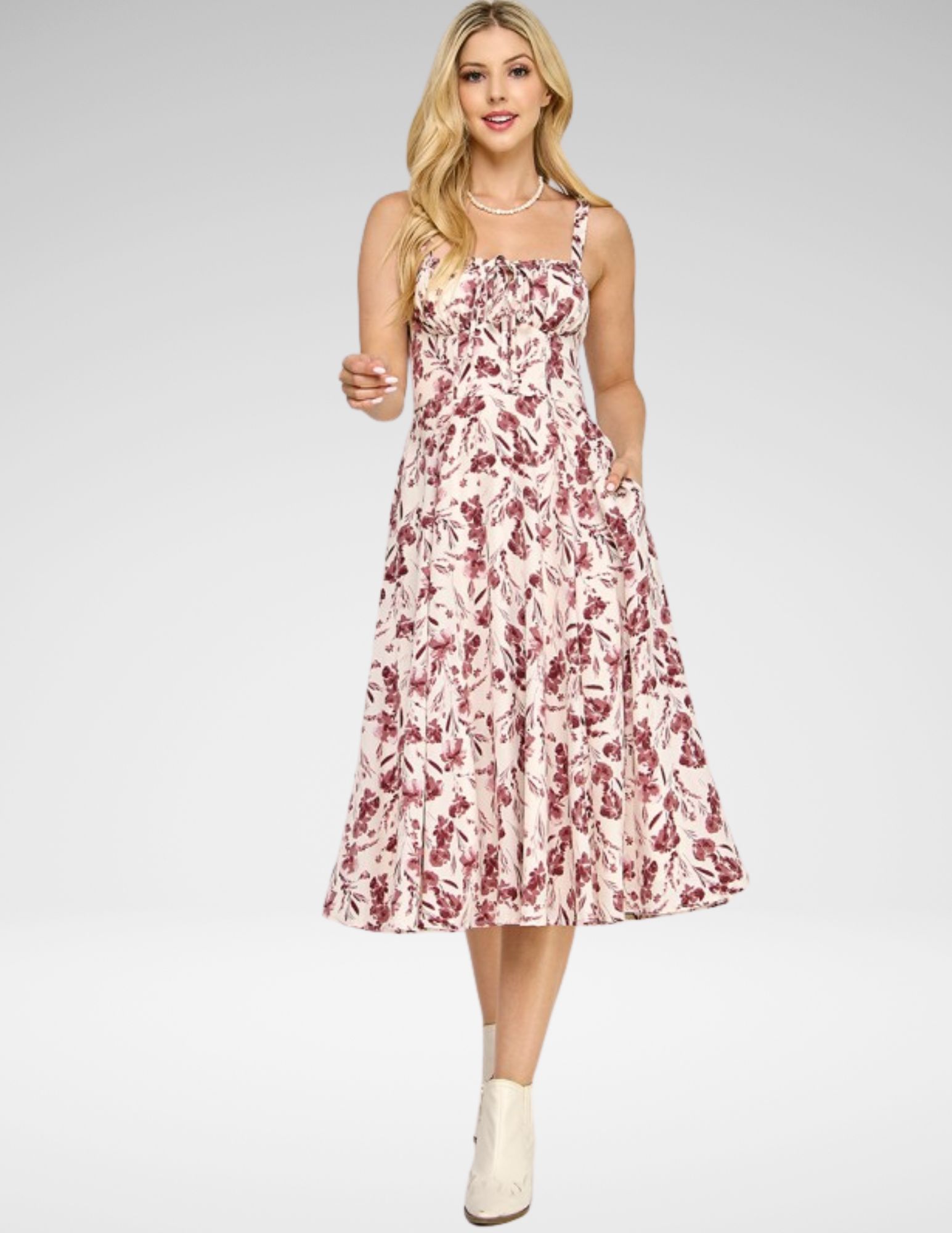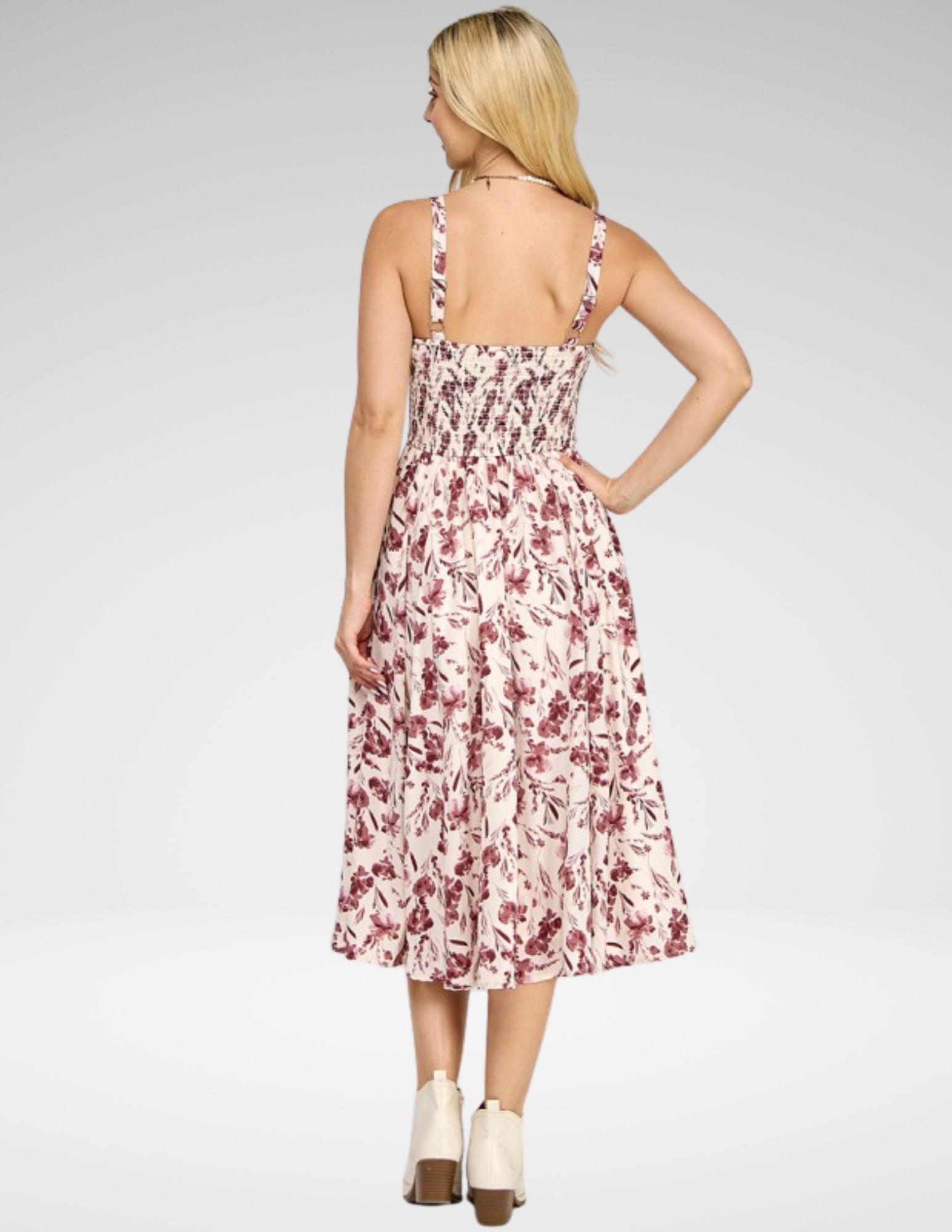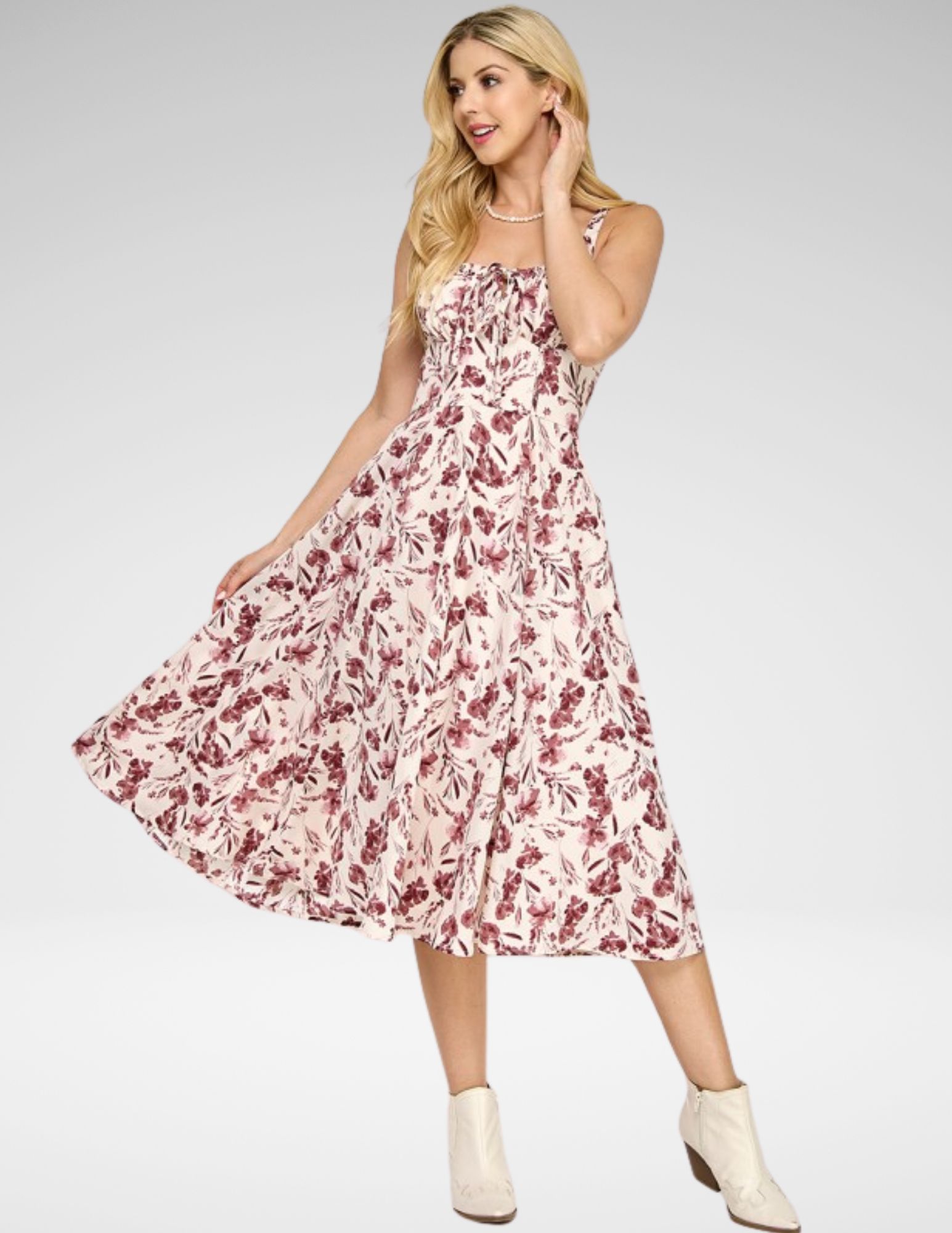 Captura la delicadeza de un jardín en flor con nuestro vestido “Floral Whisper”. Esta pieza de longitud midi está diseñada para resaltar la feminidad a través de un estampado botánico en tonos malva y burdeos sobre un fondo crema suave. Su estructura ligera y detalles románticos lo convierten en la prenda ideal para eventos al aire libre, paseos al atardecer o una sesión fotográfica de estilo campestre sofisticado.