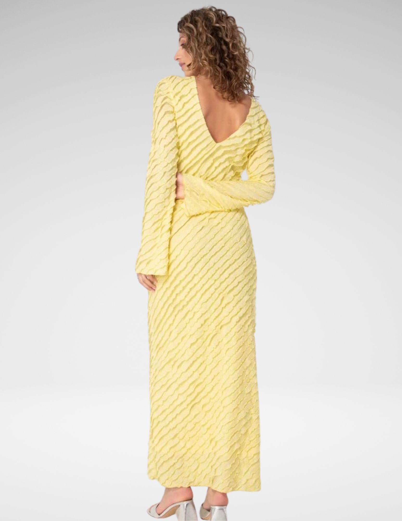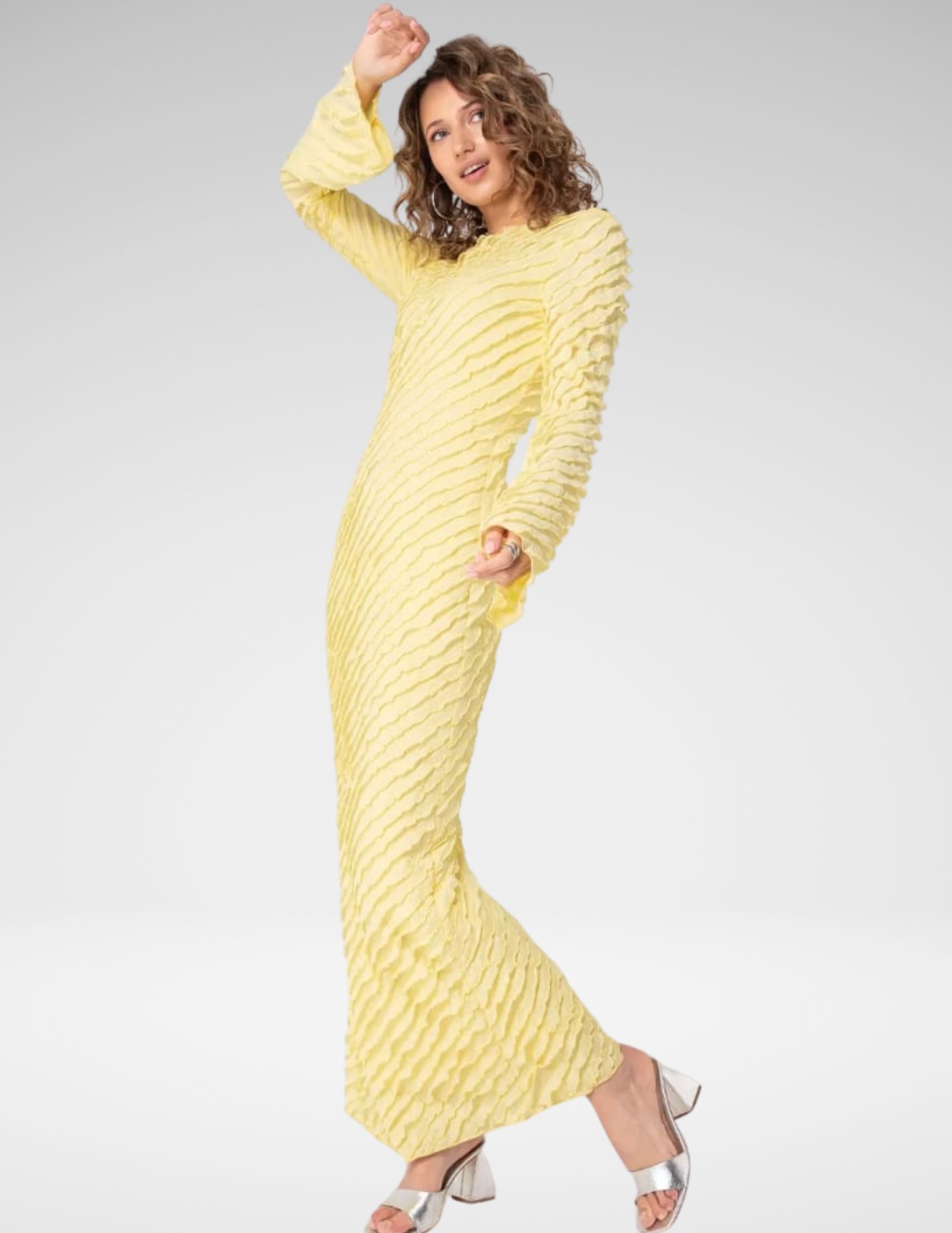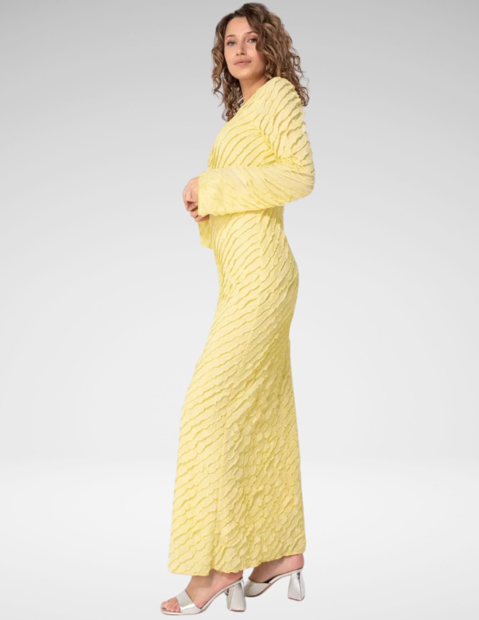 Este vestido maxi es una pieza escultórica que destaca por su increíble juego de volúmenes y texturas. Es una prenda diseñada para capturar la luz y el movimiento, ideal para eventos especiales donde se busca una elegancia moderna y audaz.