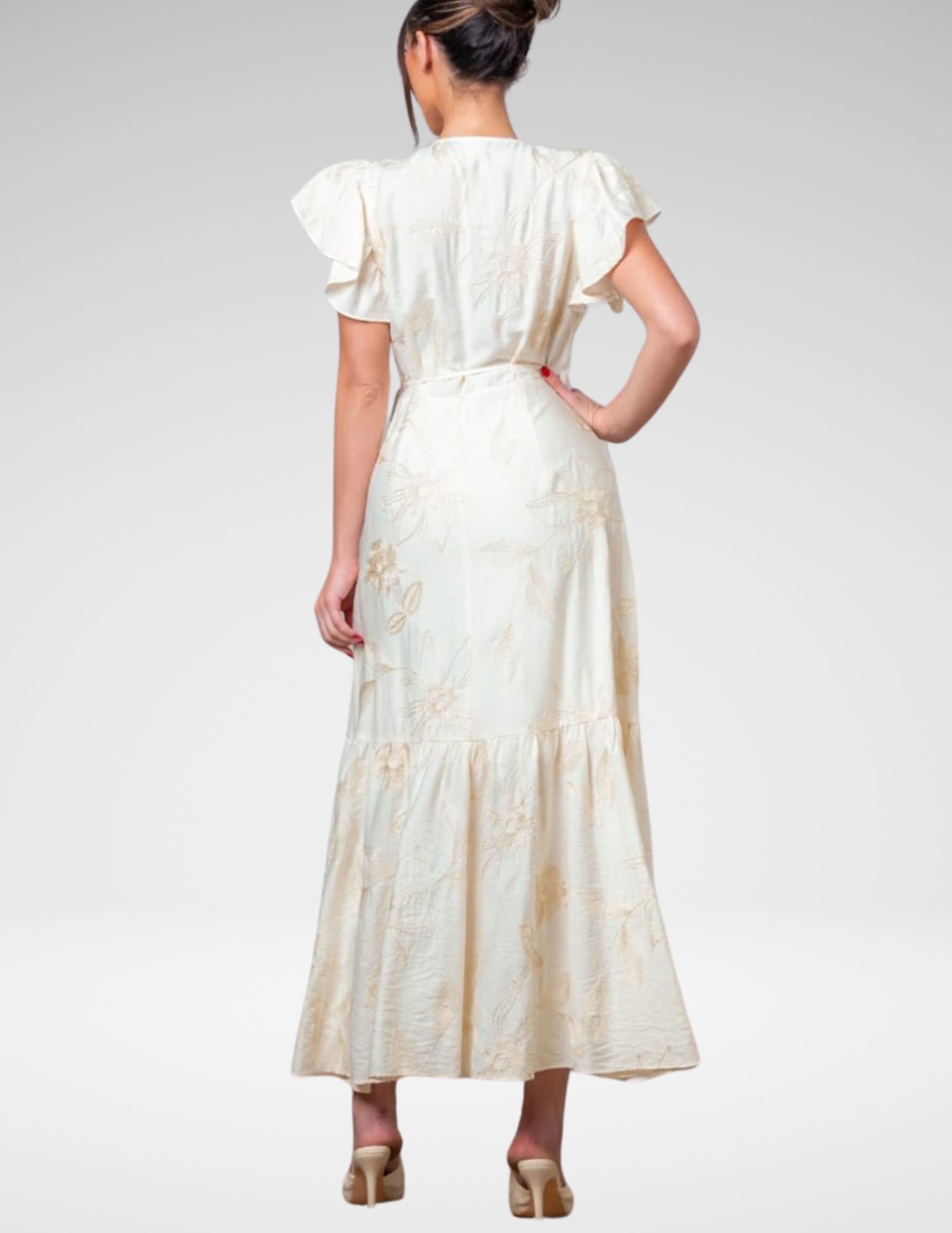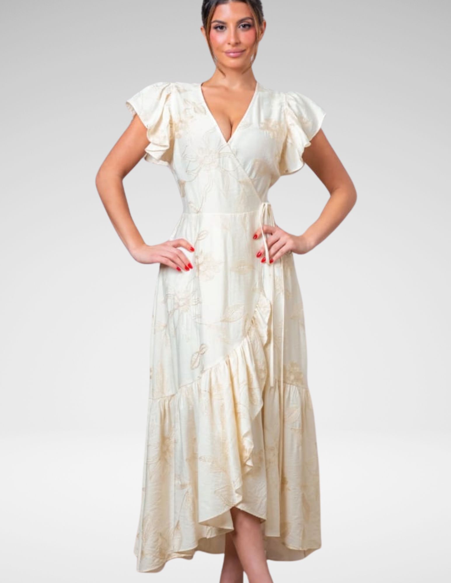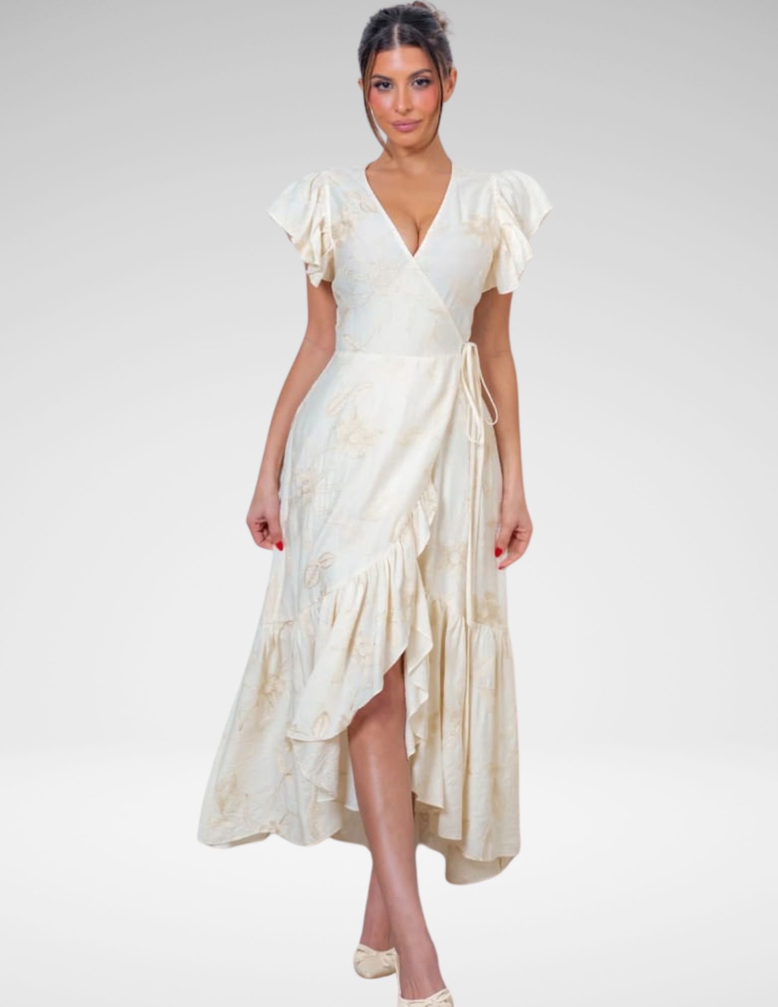 Deslumbra en tu próximo evento con este vestido maxi en tono crema, diseñado para realzar la figura con su corte tipo wrap (cruzado). Destaca por sus delicados bordados florales en relieve y unas mangas con volantes que añaden un toque femenino y sofisticado. La falda asimétrica con terminación en ruffles aporta movimiento y frescura, convirtiéndolo en la opción ideal para bodas de día, bautizos o una cena especial frente al mar.