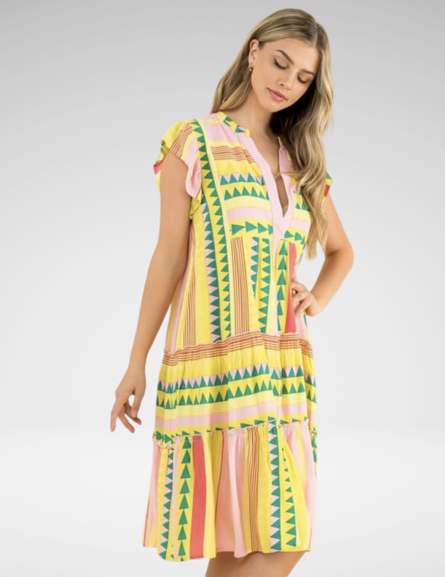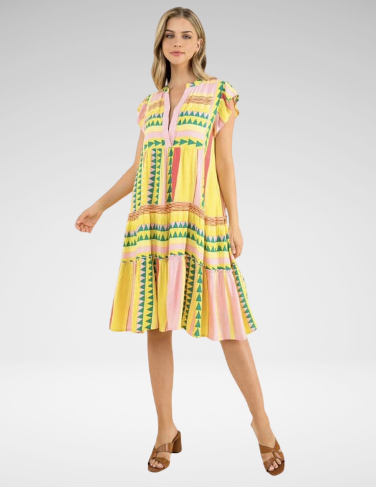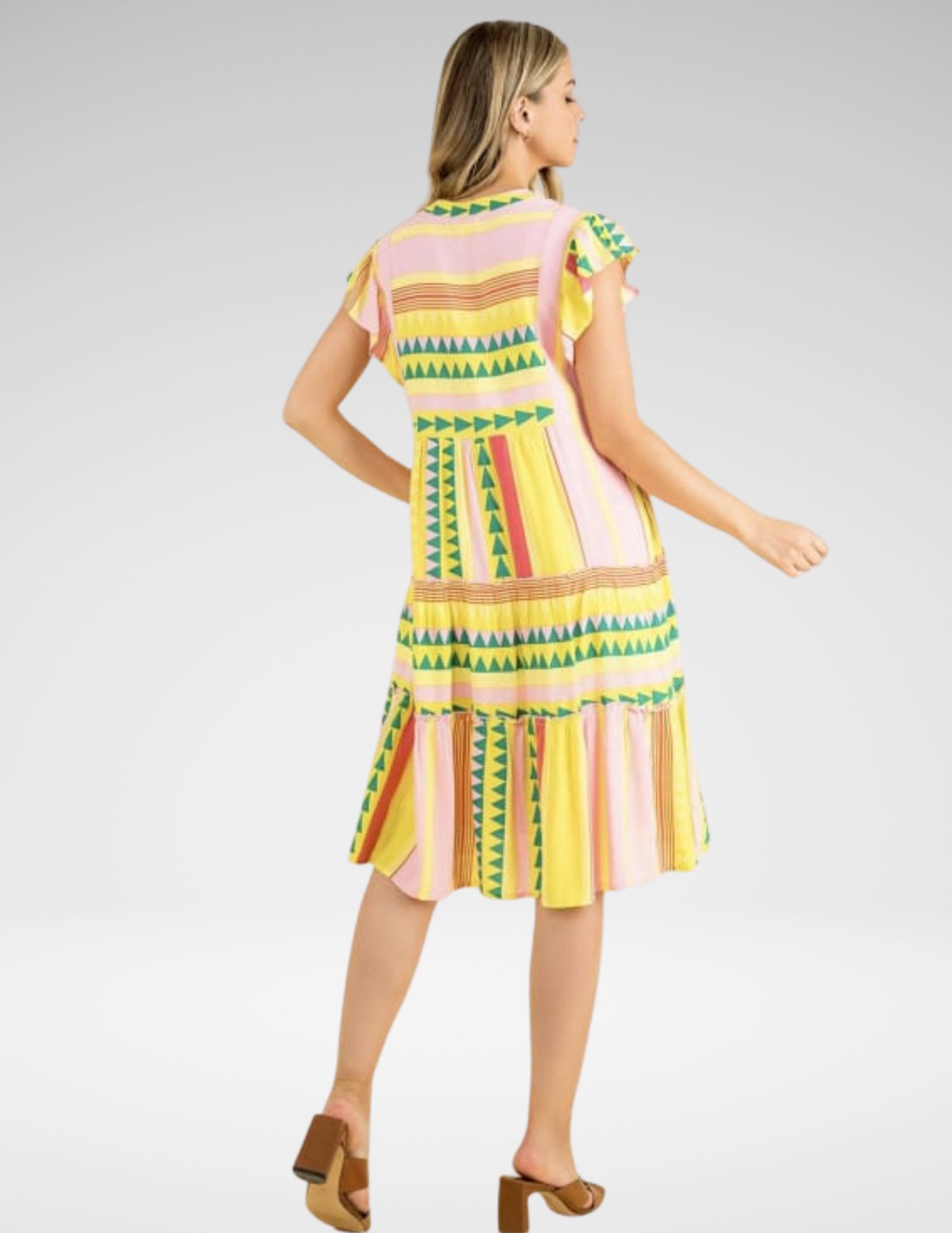 Este vestido midi es una explosión de color y dinamismo, diseñado para quienes buscan una prenda cómoda con una personalidad visual fuerte. Su diseño se basa en una estructura de paneles que favorece la libertad de movimiento y un estilo bohemio contemporáneo.