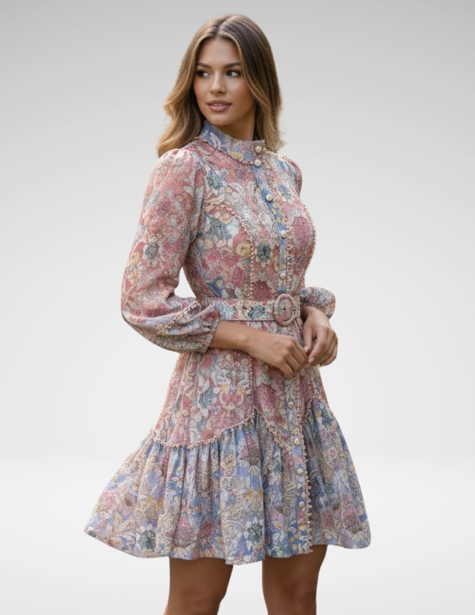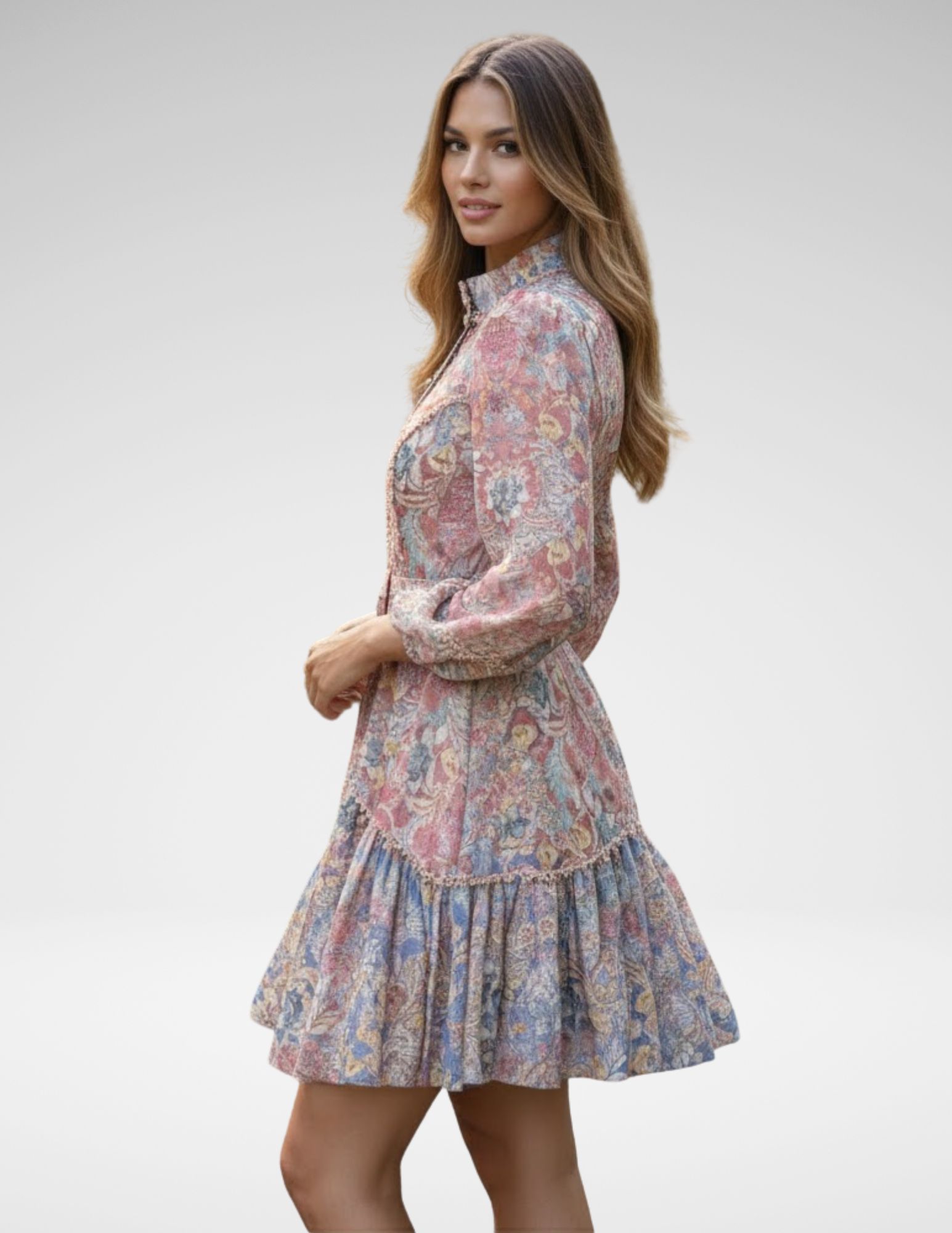 Este vestido corto es una pieza magistral que captura la esencia del estilo bohemio sofisticado. Con un intrincado estampado de cachemira (paisley) en una paleta de tonos empolvados como el terracota, azul lavanda y ocre, su diseño destaca por una construcción detallada que evoca la delicadeza de la moda de inspiración antigua con un corte moderno y favorecedor.