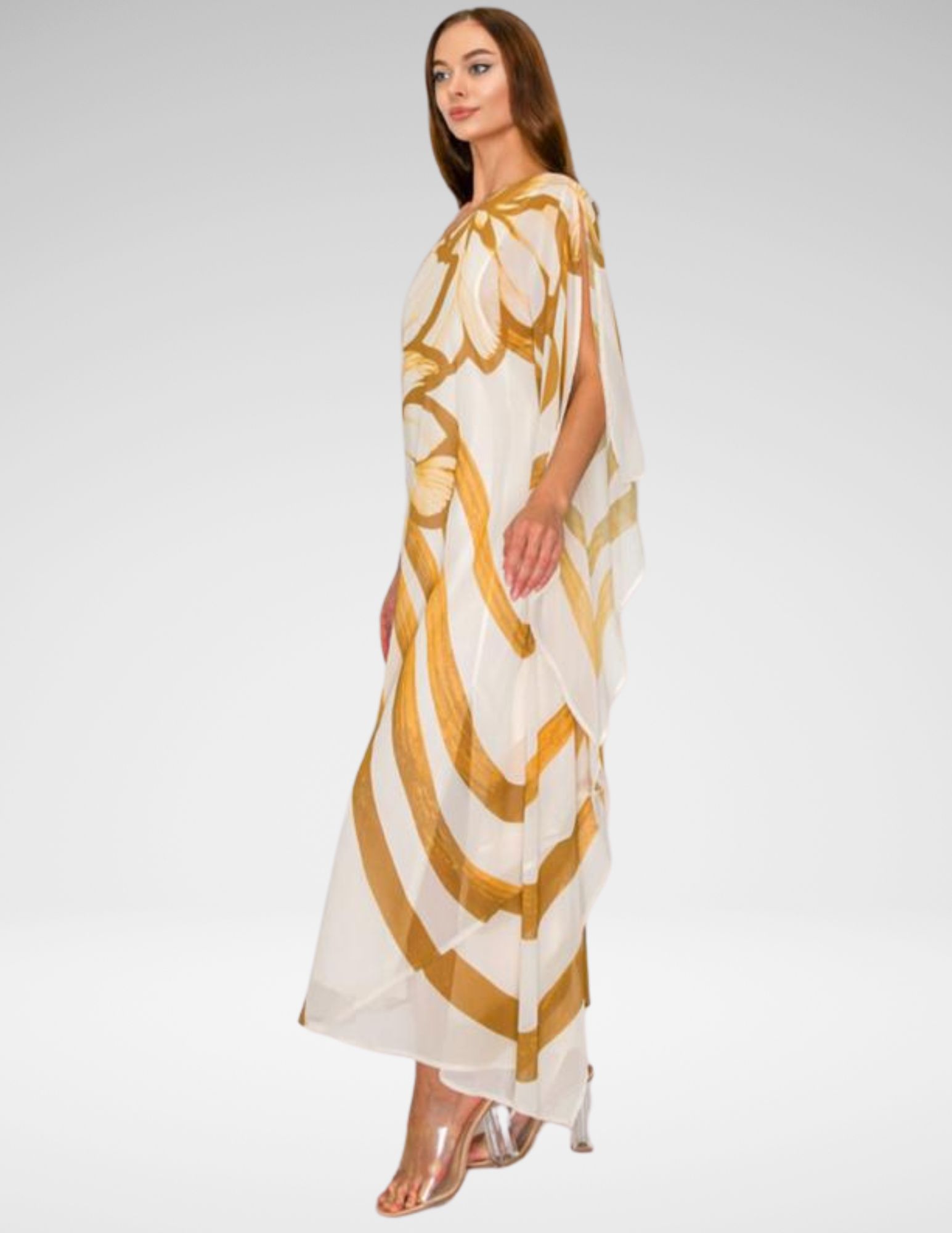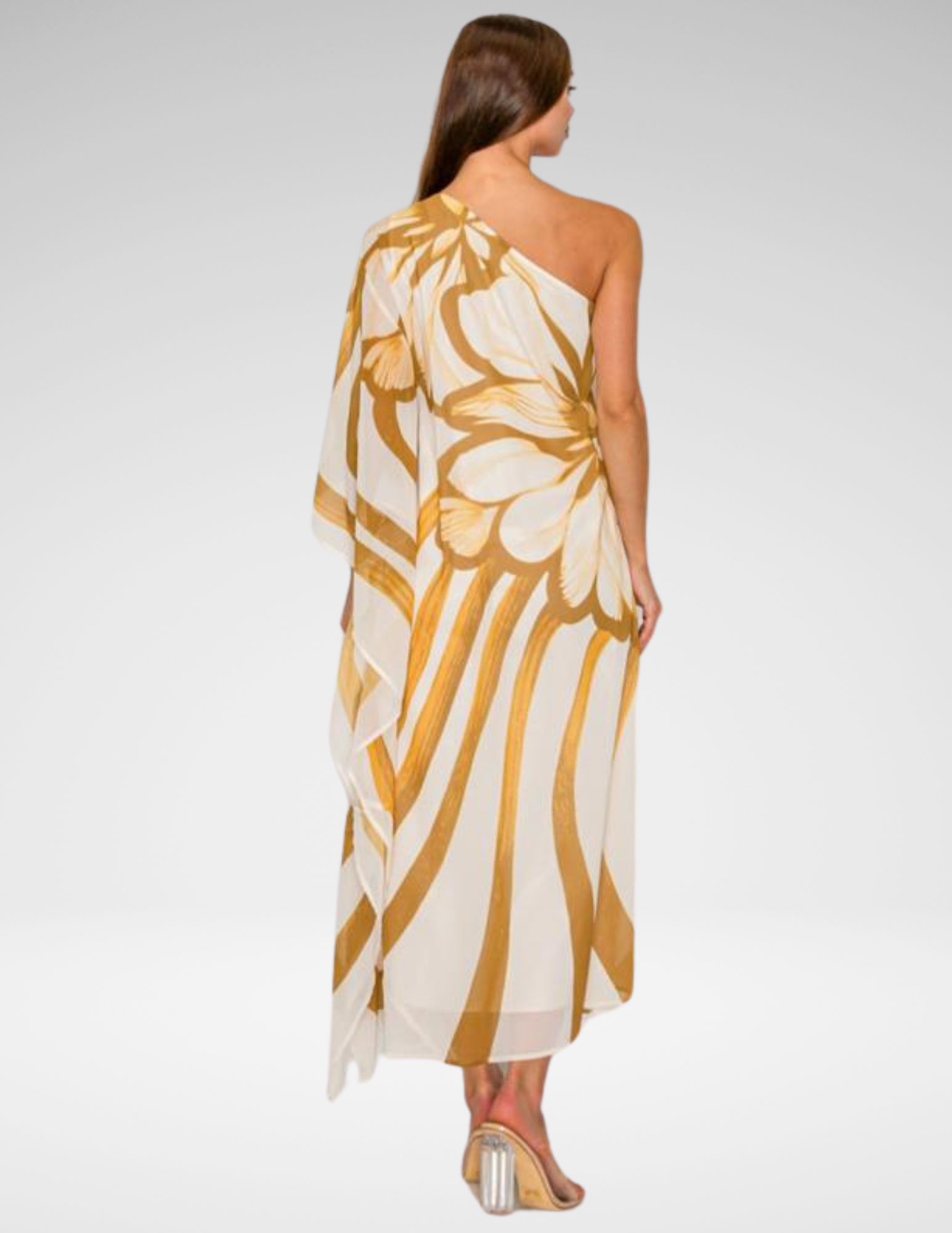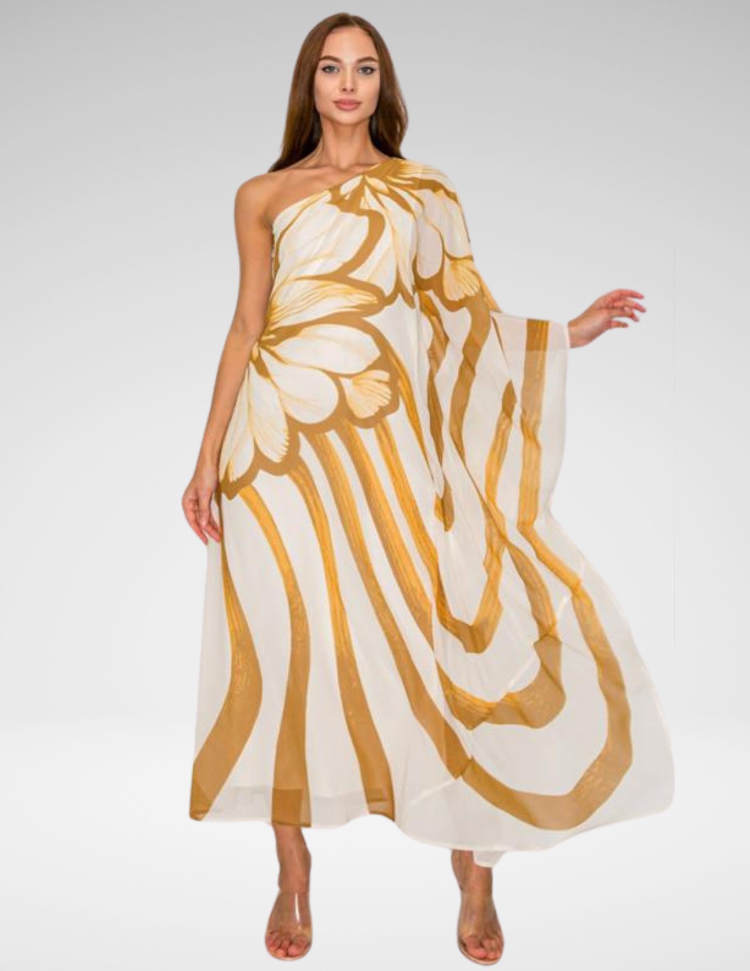 Haz una entrada inolvidable con el vestido “Oasis Abstract”, una pieza que celebra la fluidez y el diseño vanguardista. Este maxi vestido destaca por su silueta de un solo hombro (one-shoulder) y un dramático drapeado lateral que crea un movimiento etéreo al caminar. El estampado botánico abstracto en tonos camel sobre fondo crema evoca una estética orgánica y sofisticada, ideal para eventos de gala en la playa, cócteles al atardecer o sesiones de fotos editoriales.