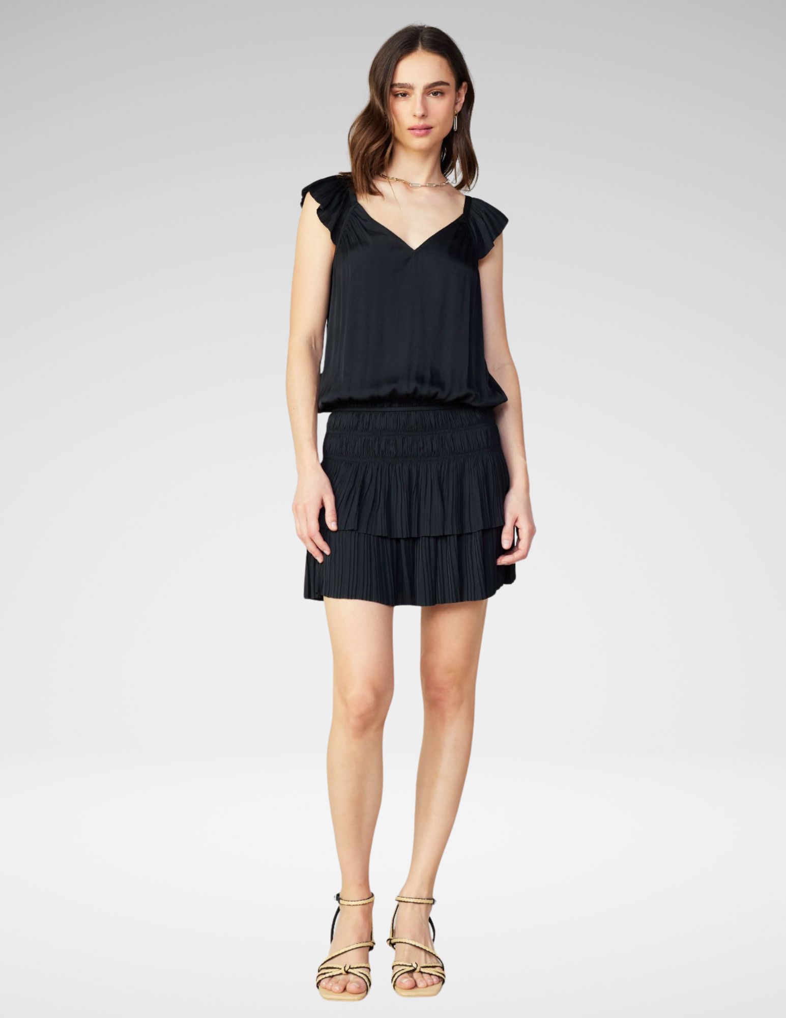 Este vestido mini en color negro es la pieza perfecta para quienes buscan un equilibrio entre elegancia minimalista y dinamismo. Confeccionado en un tejido ligero con textura micro-plisada, su diseño destaca por una caída fluida que se adapta con gracia al movimiento, ideal para eventos de cóctel o cenas sofisticadas.