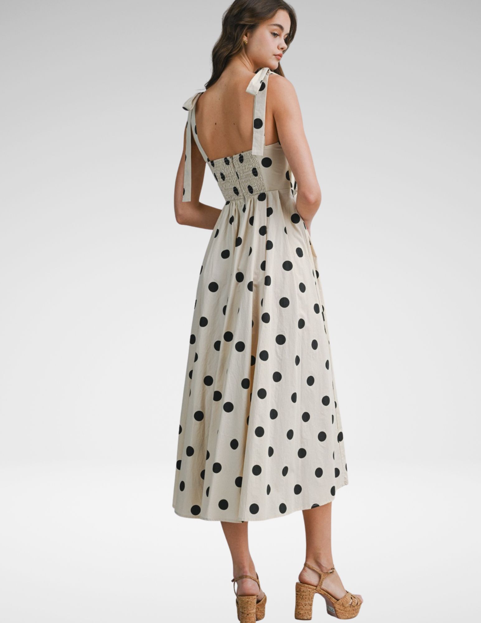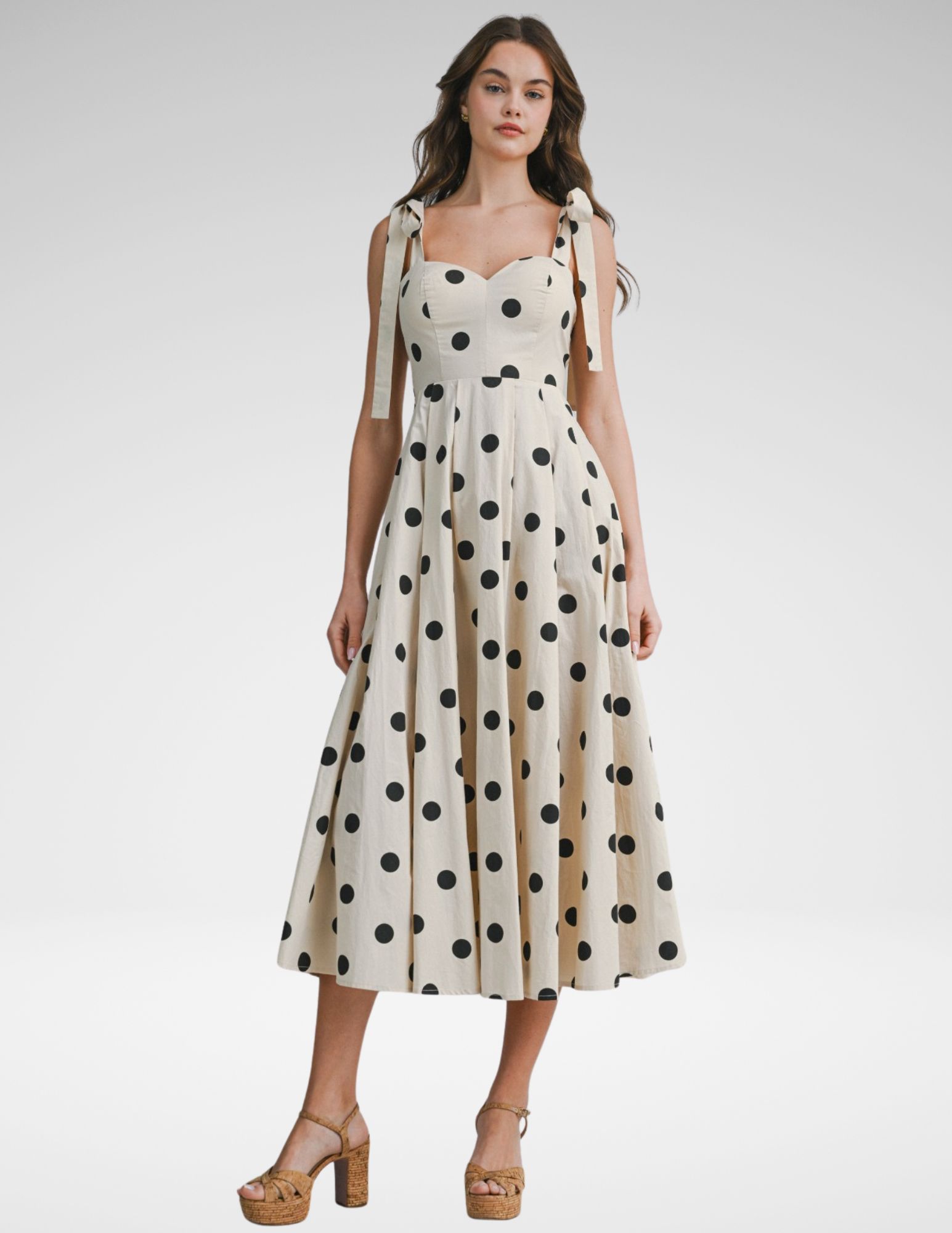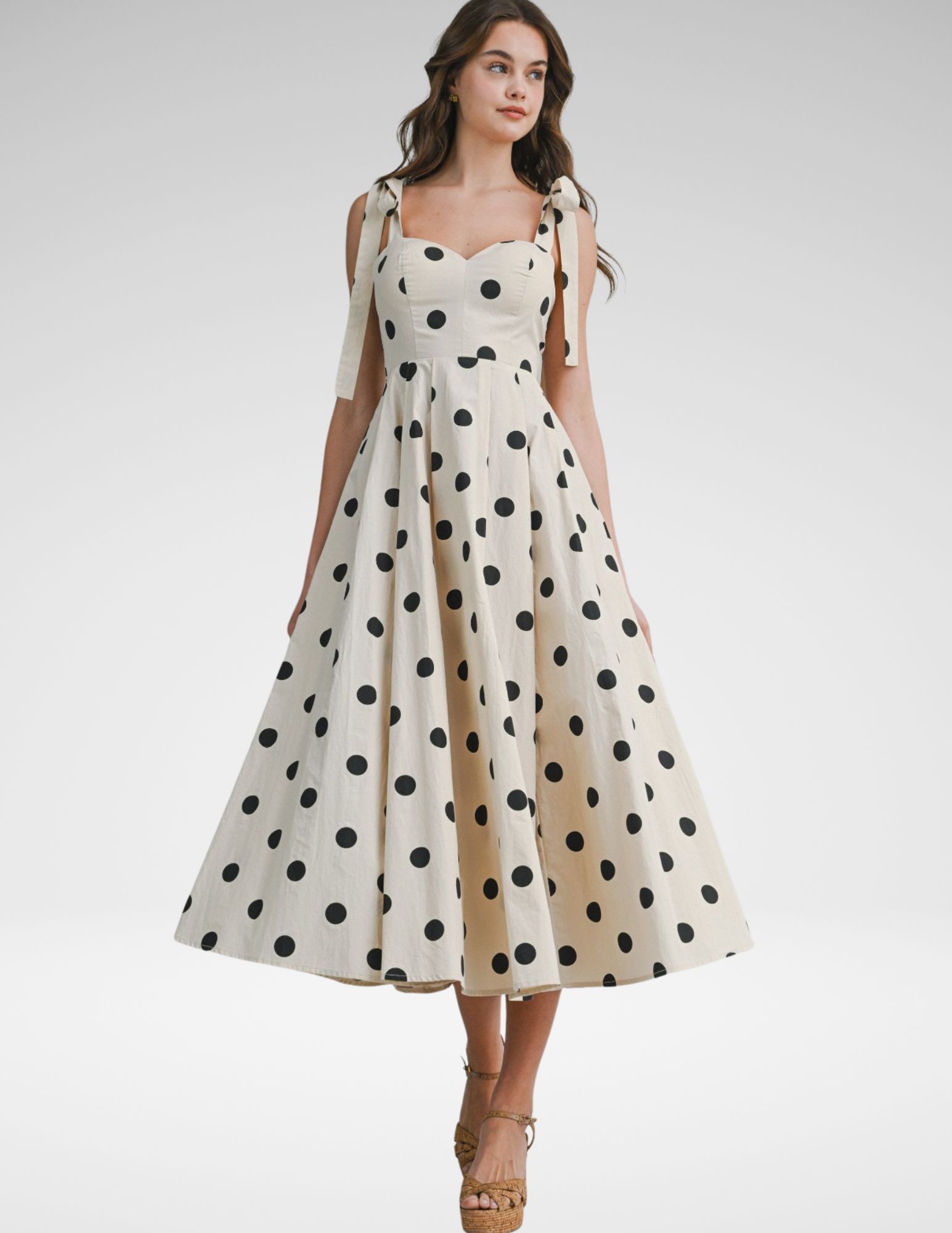 Este vestido midi es una interpretación moderna del estilo pin-up de los años 50, fusionando la sofisticación clásica con detalles contemporáneos. Su diseño destaca por el contraste gráfico y una estructura que celebra la feminidad.