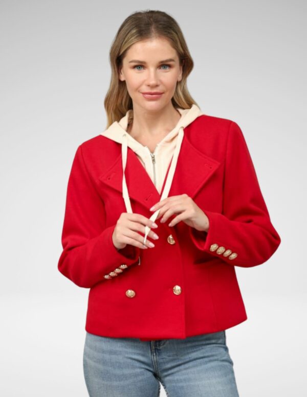 Versatilidad y estilo se unen en este abrigo único. Su diseño con capucha desmontable y detalles en contraste lo convierten en una opción práctica y moderna para cualquier ocasión. Con un corte favorecedor y un vibrante tono rojo, es perfecto para destacar en los días más fríos con un look atrevido y funcional.