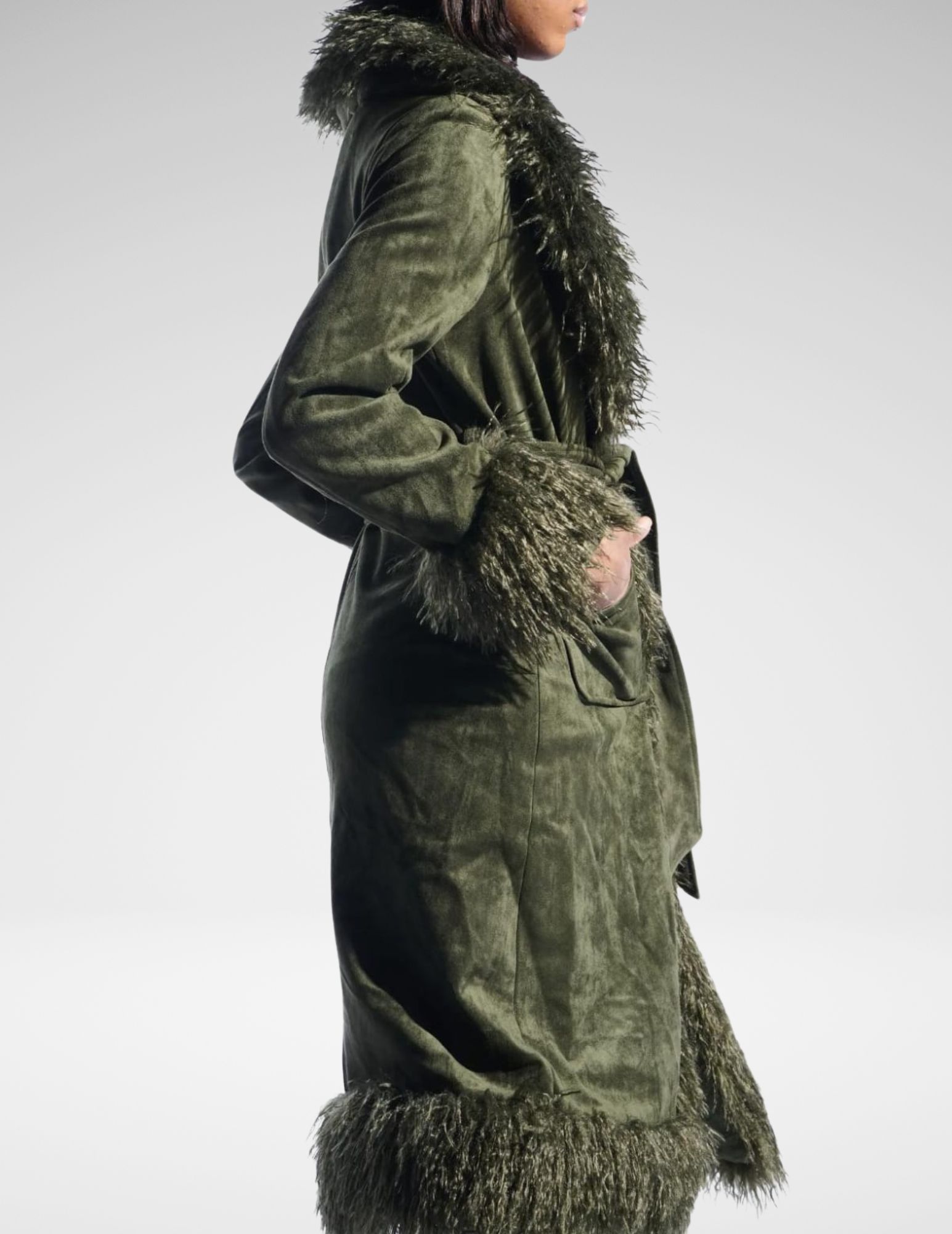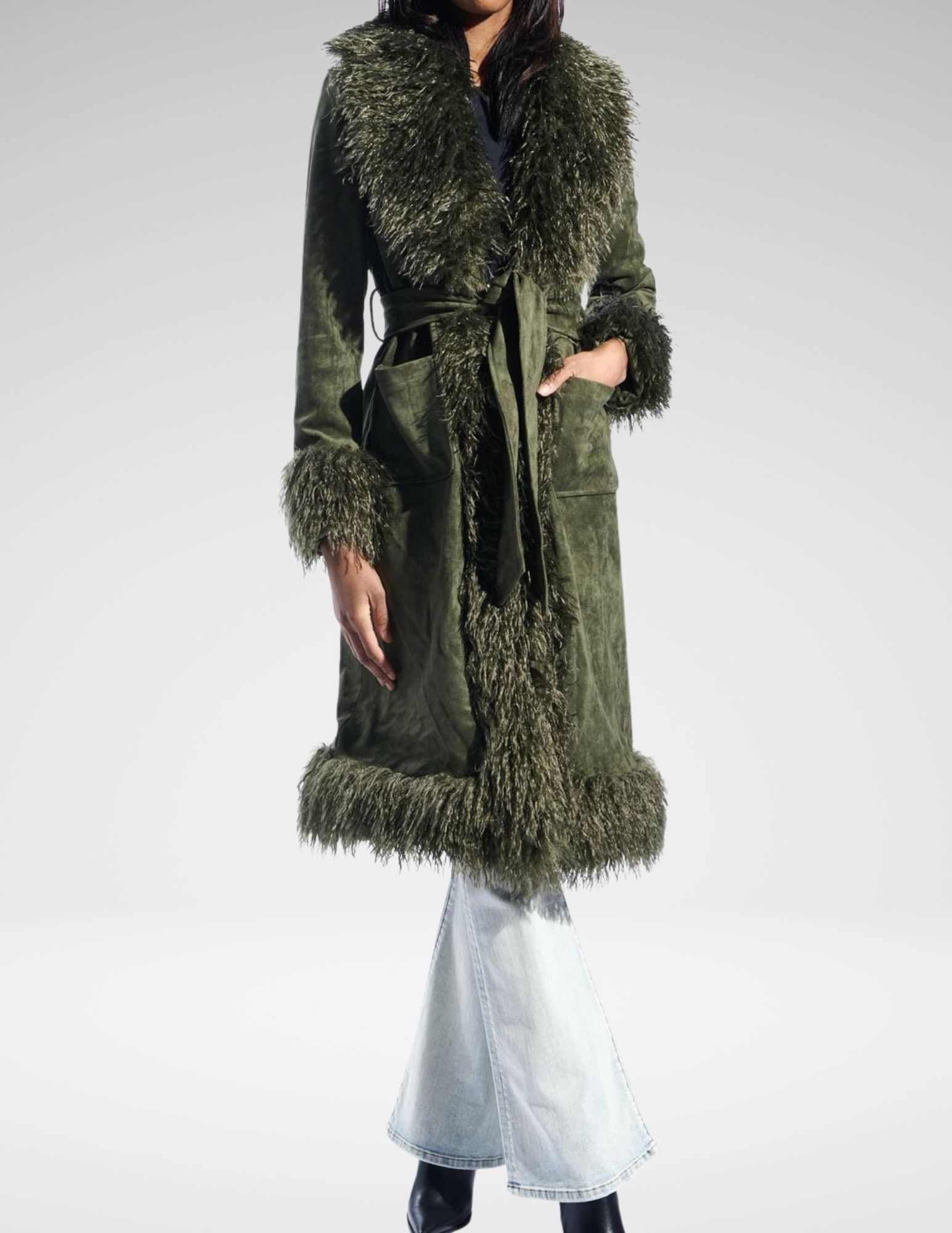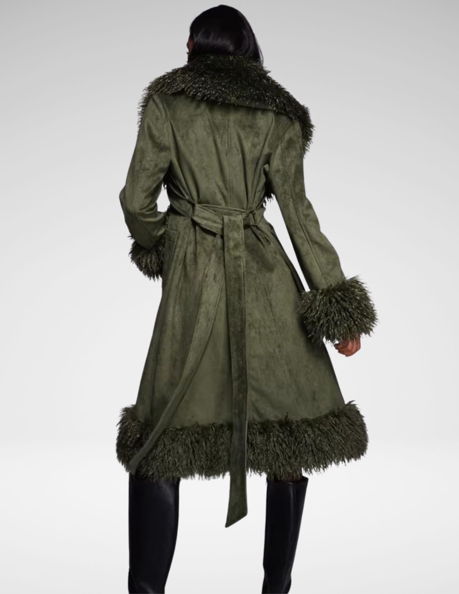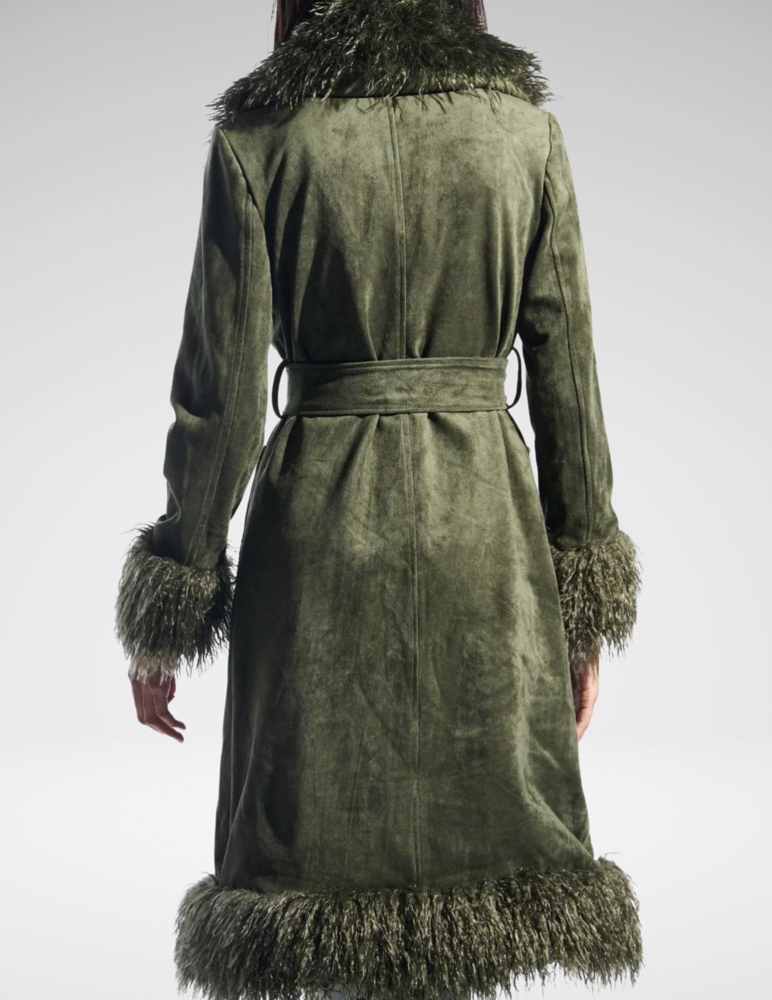 Diseño largo en ante sintético oliva con ribetes de pelo falso en cuello y puños. Cinturón ajustable que define la silueta, ideal para destacar con estilo vintage moderno.