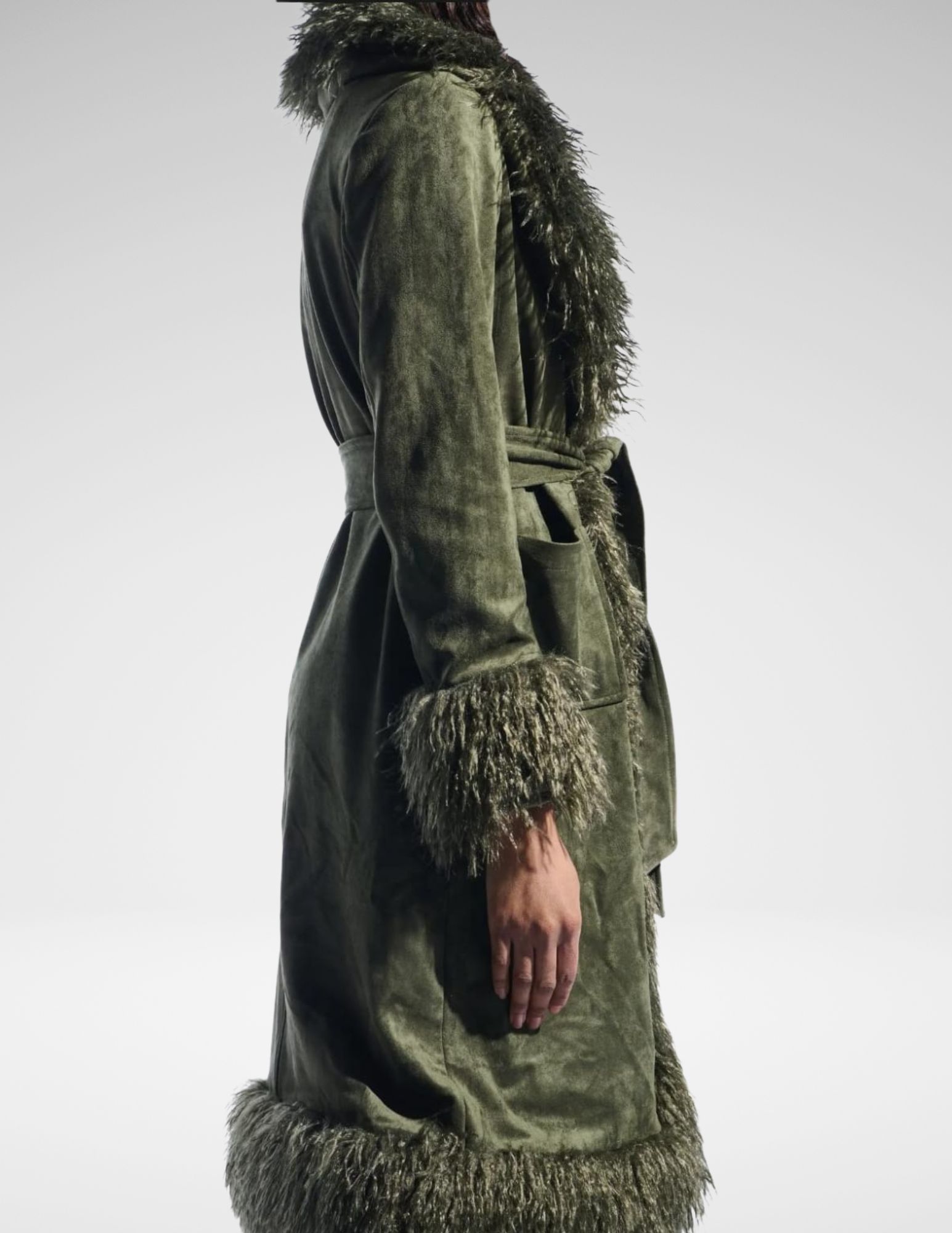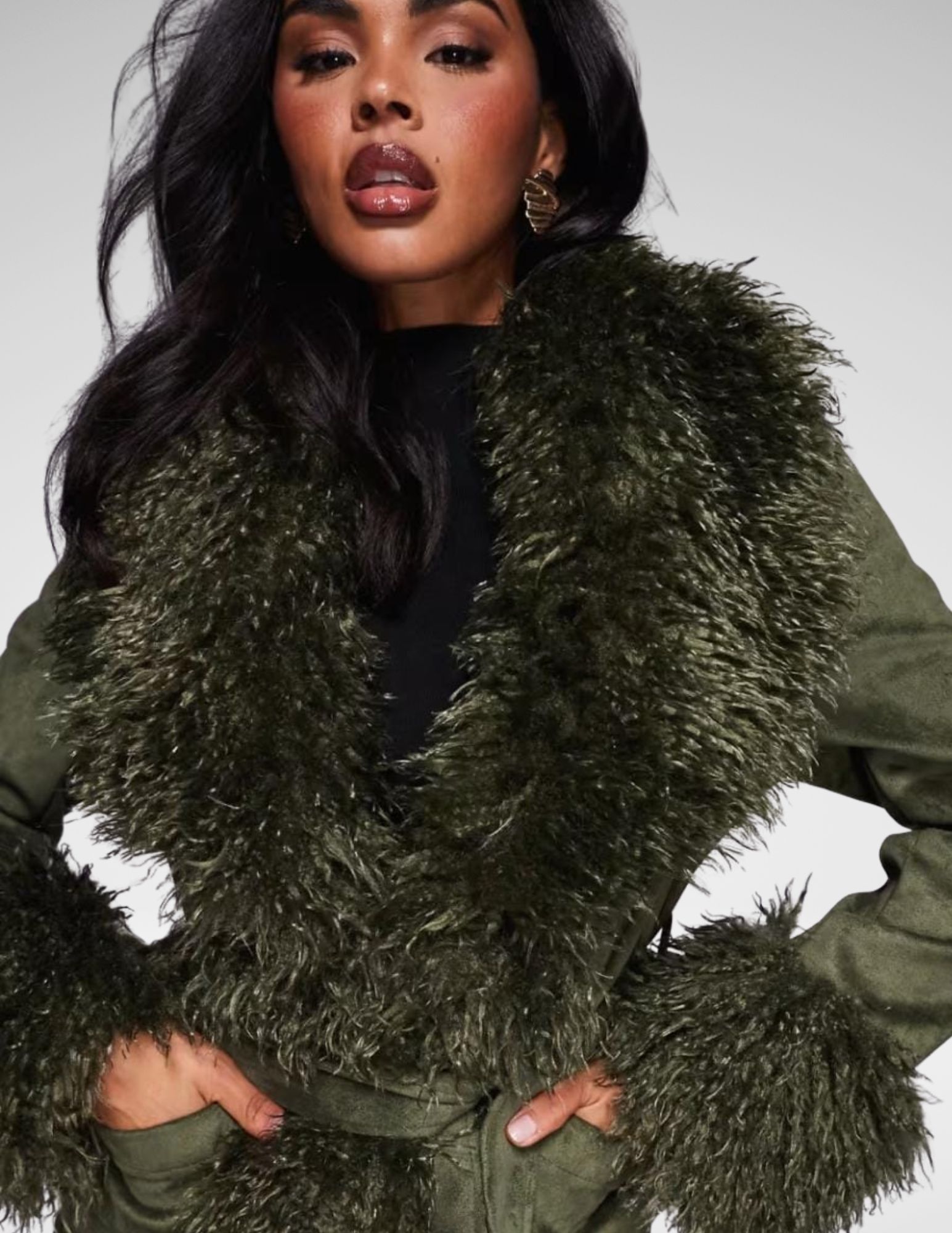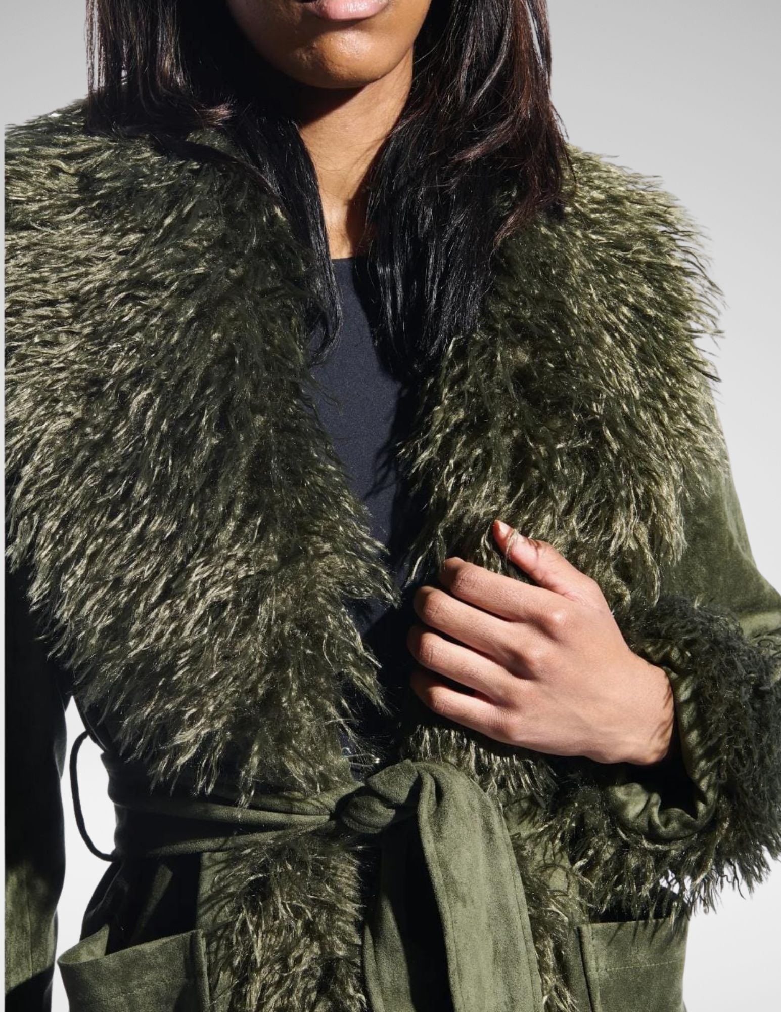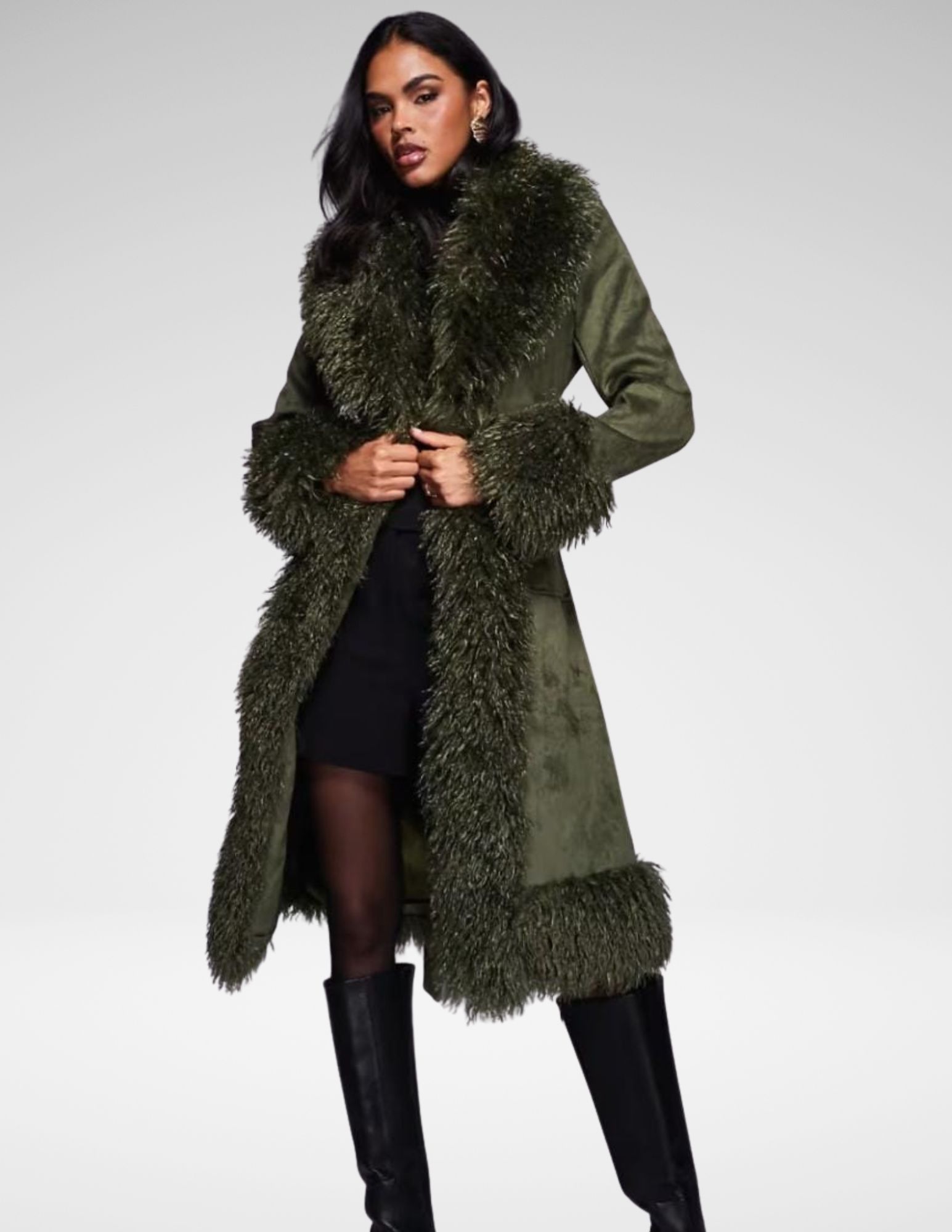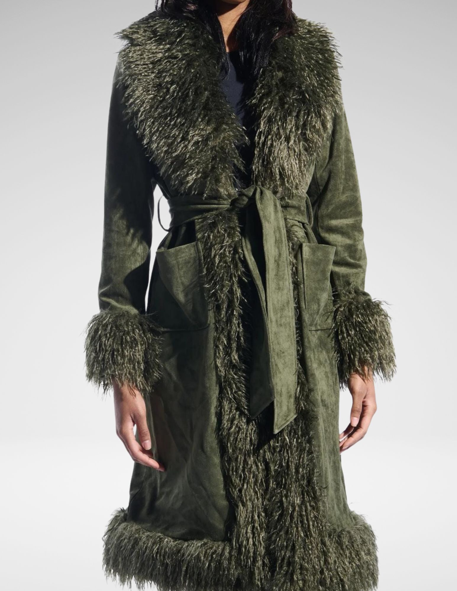 Diseño largo en ante sintético oliva con ribetes de pelo falso en cuello y puños. Cinturón ajustable que define la silueta, ideal para destacar con estilo vintage moderno.