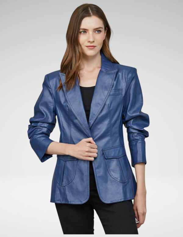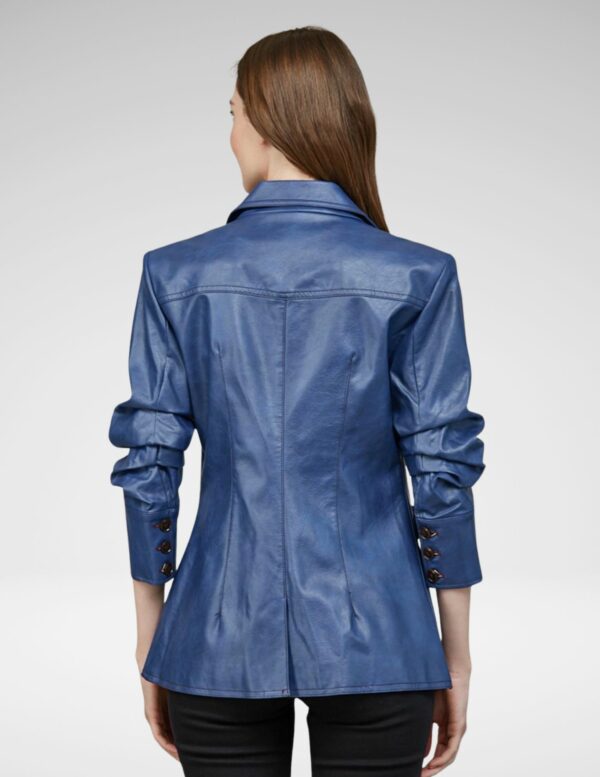 Esta chaqueta de piel sintética en un vibrante tono azul profundo presenta un diseño moderno y audaz. Cuenta con mangas fruncidas que aportan un toque de volumen y estilo, además de bolsillos frontales con solapa para mayor funcionalidad. Ideal para quienes buscan añadir un toque de color y textura a su atuendo, manteniendo una estética elegante y contemporánea.