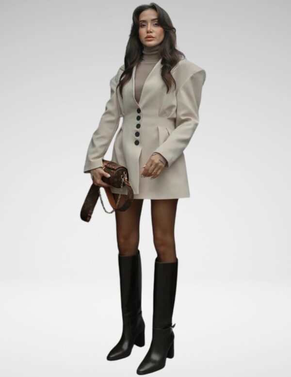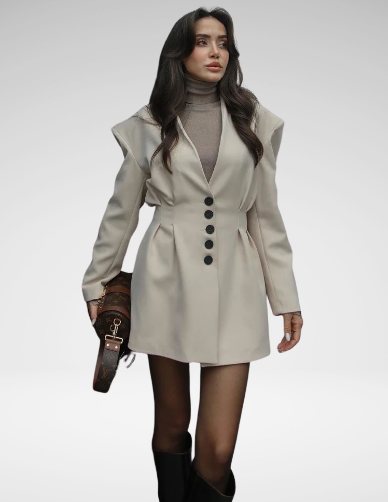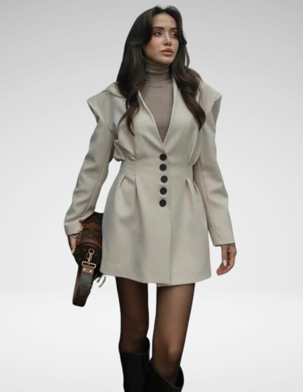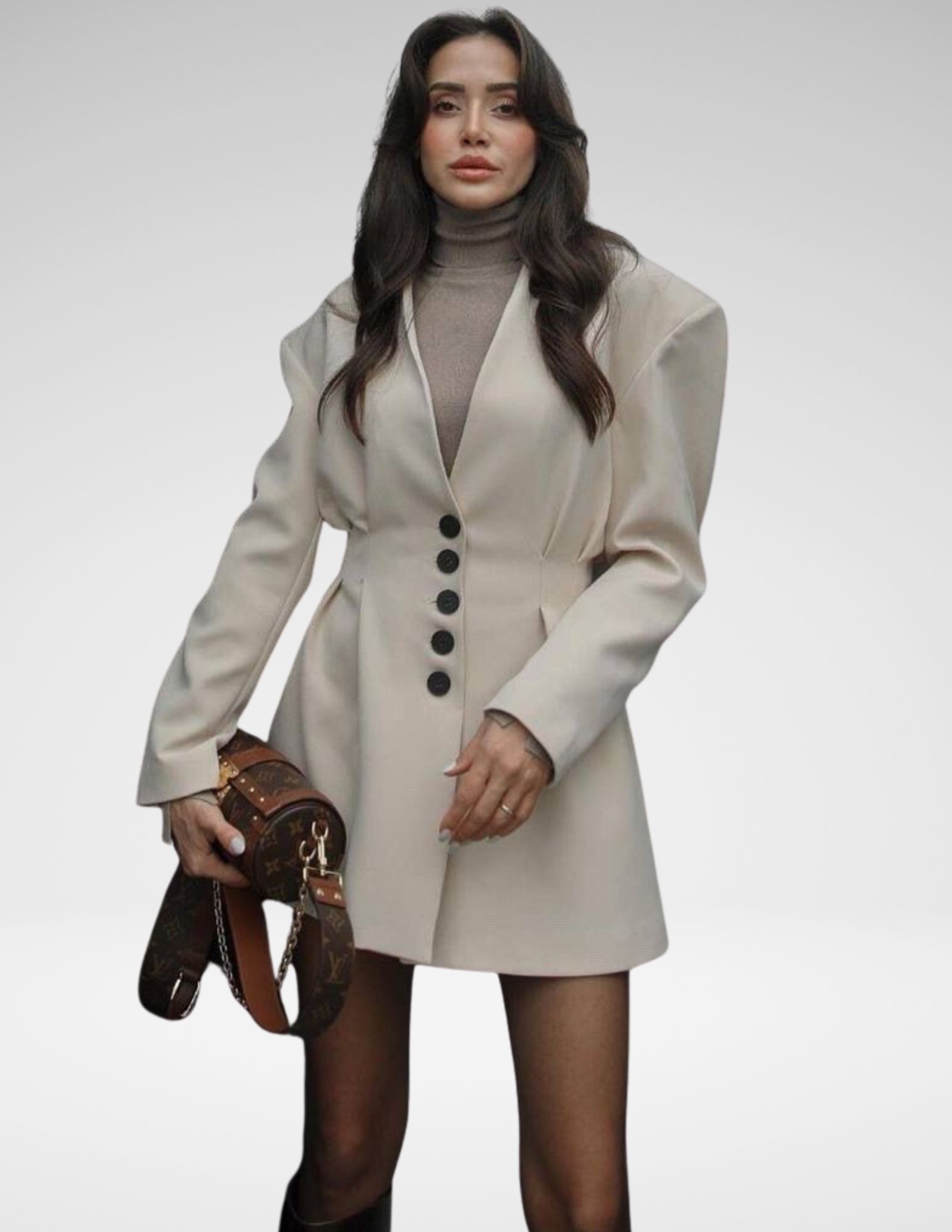 Blazer estructurado en tono beige con pliegues frontales que estilizan la silueta. Con cuello en V y cierre de botones, es una prenda versátil y elegante que combina tanto con faldas como con pantalones para un look sofisticado.