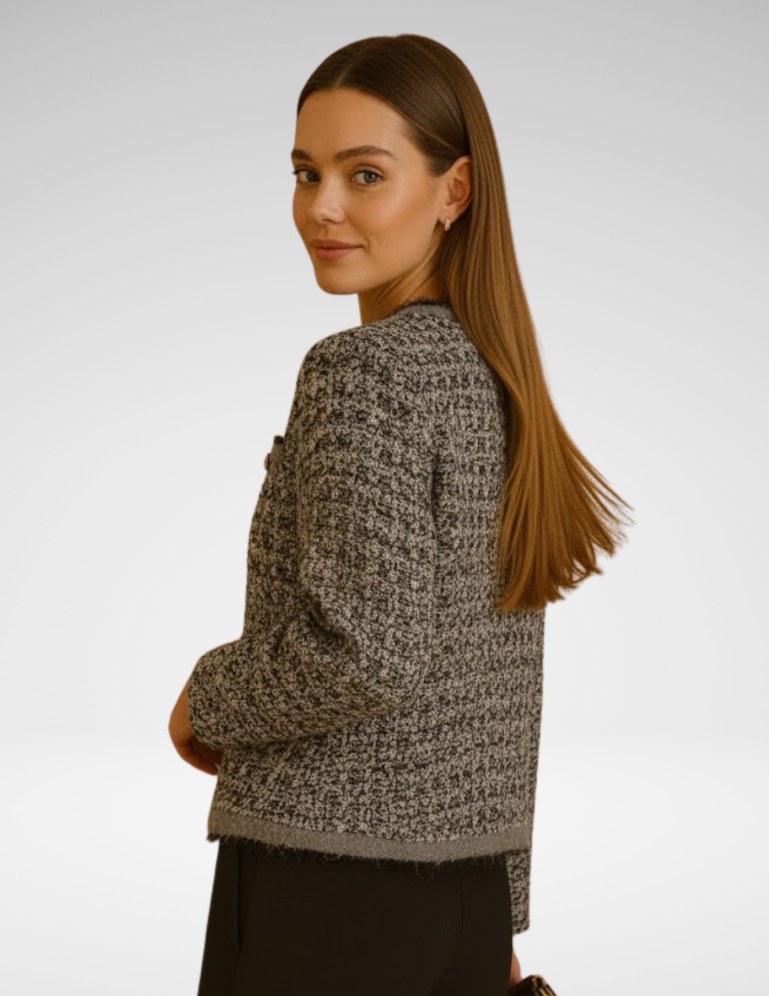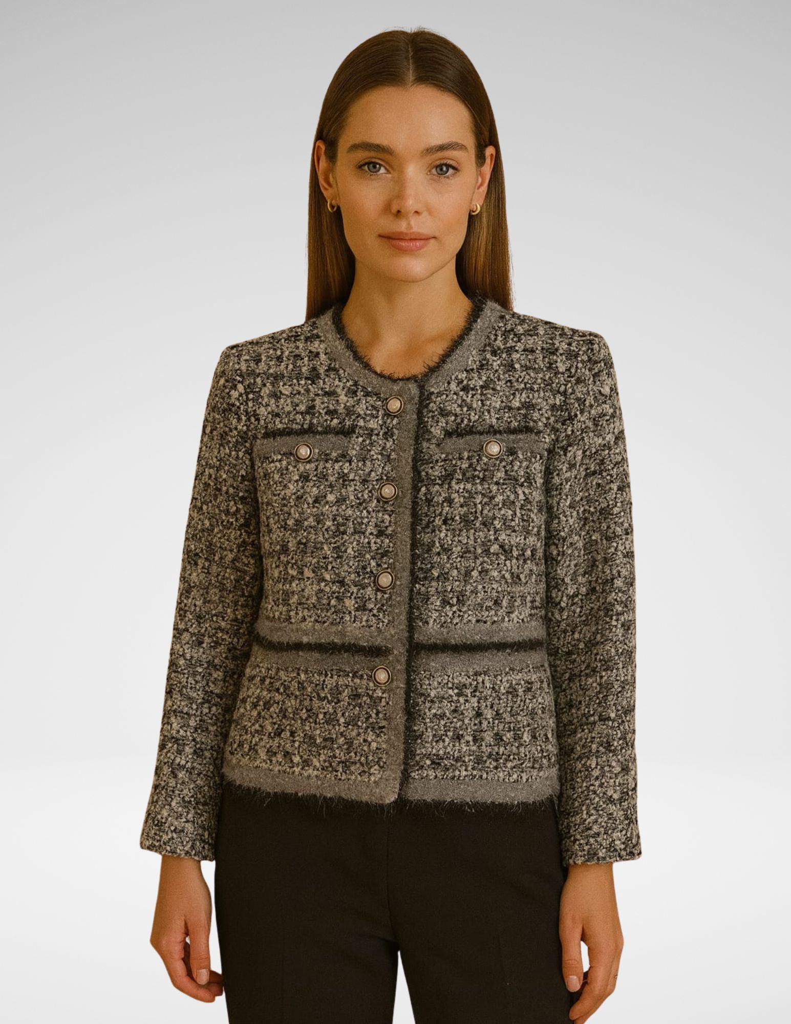 Blazer de tweed con diseño estructurado, cuello redondo y botones de estilo antiguo que aportan carácter. Perfecto para combinar con jeans o pantalón formal y elevar tu look de día o de tarde.