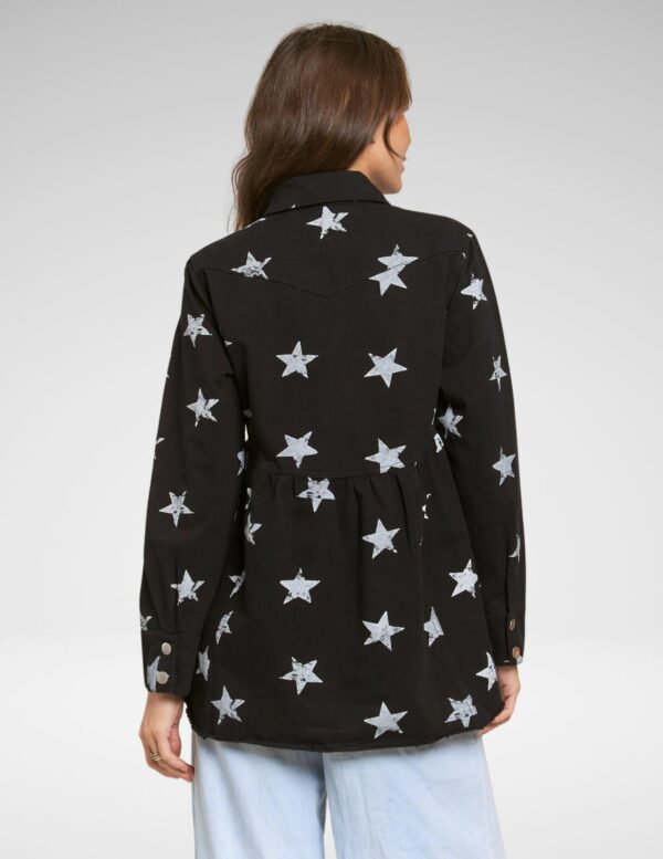 Brilla con esta encantadora camisa-chaqueta decorada con estrellas. Su diseño ligero y fresco es perfecto para el día a día o una salida especial. ¡Luce fabulosa y cómoda en cualquier ocasión!