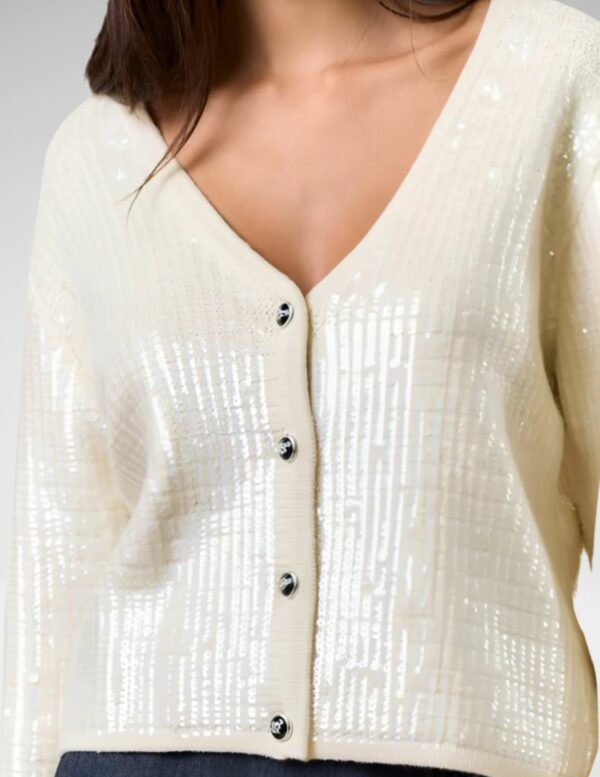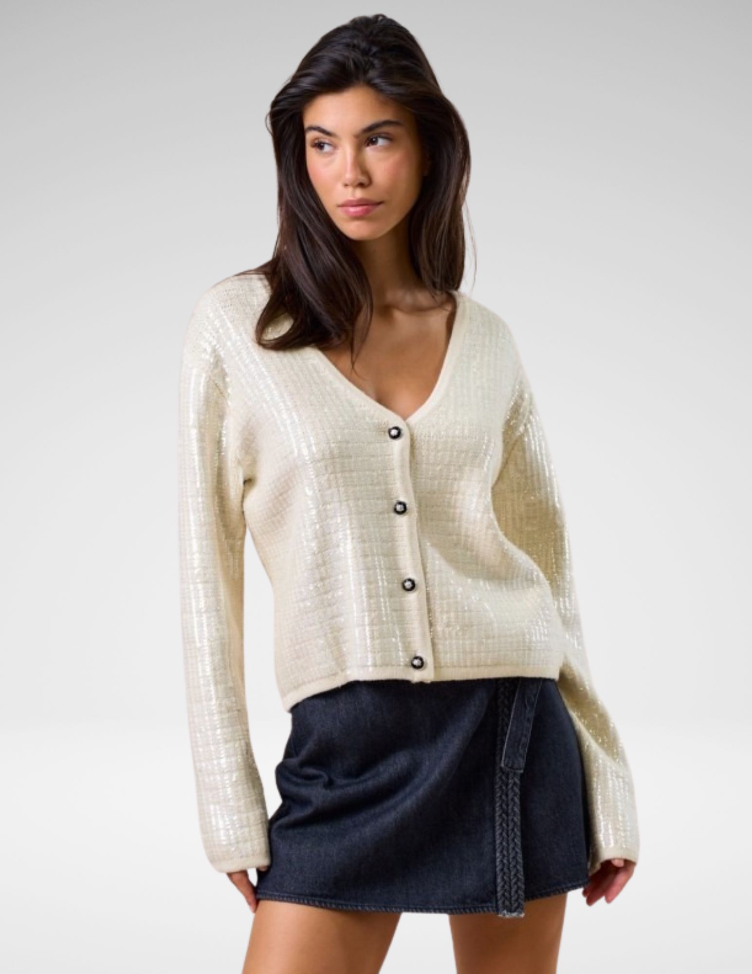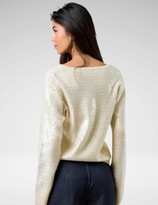 Este suéter combina la suavidad crema con destellos de lentejuela que captan la luz. Corte relajado ideal para layering o ser la pieza estrella de tu look. Perfecto para darle un toque glam a outfits de día o noche.