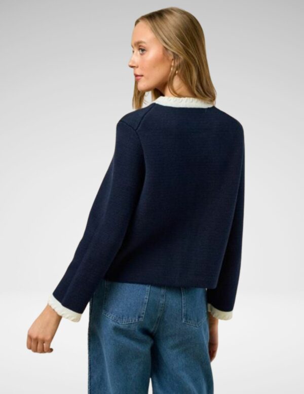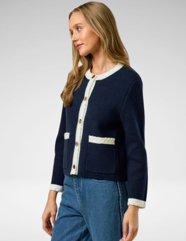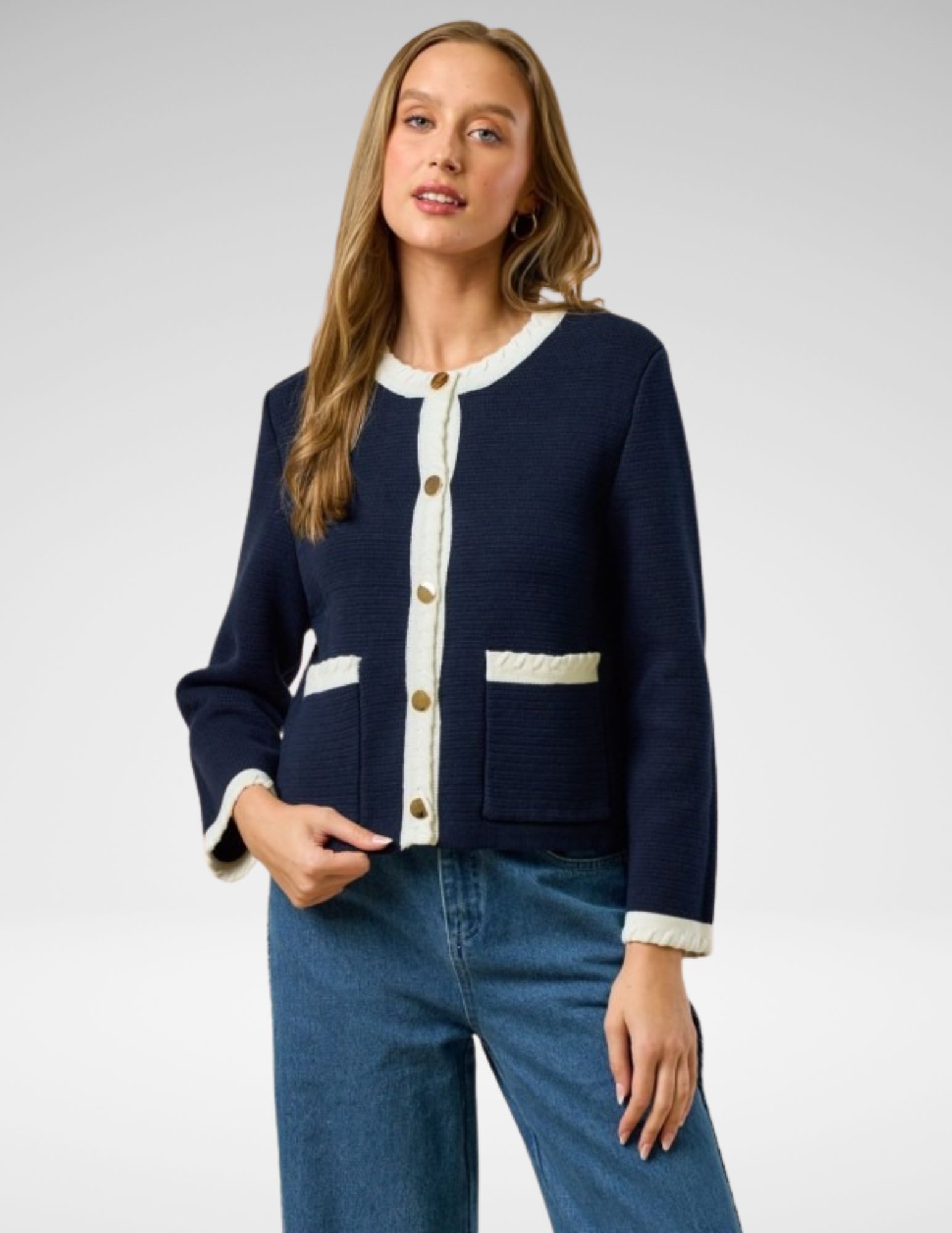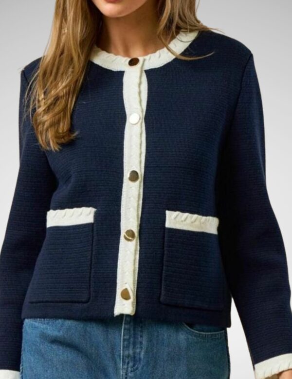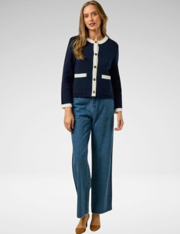 Un cardigan que mezcla lo clásico con lo inesperado: base navy + acentos off-white + detalles de lazo en las mangas que le dan un giro único. Tejido suave, versátil para llevar sobre camisetas o tops delgados, ideal para capas con estilo sin perder comodidad.