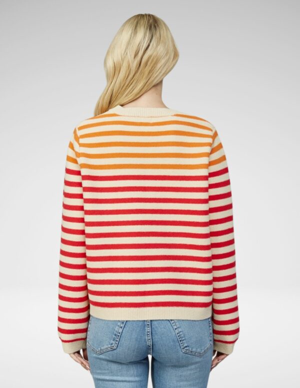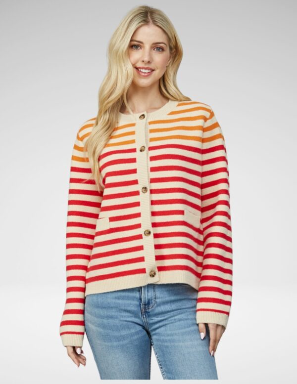 Este cárdigan ofrece un estilo relajado y moderno. Su diseño incluye un cuello alto que aporta calidez, mangas largas que añaden un toque de elegancia y un patrón de rayas multicolores que aportan dinamismo al conjunto. Ideal para combinar con leggings o jeans ajustados, brindando comodidad y estilo en una sola prenda.