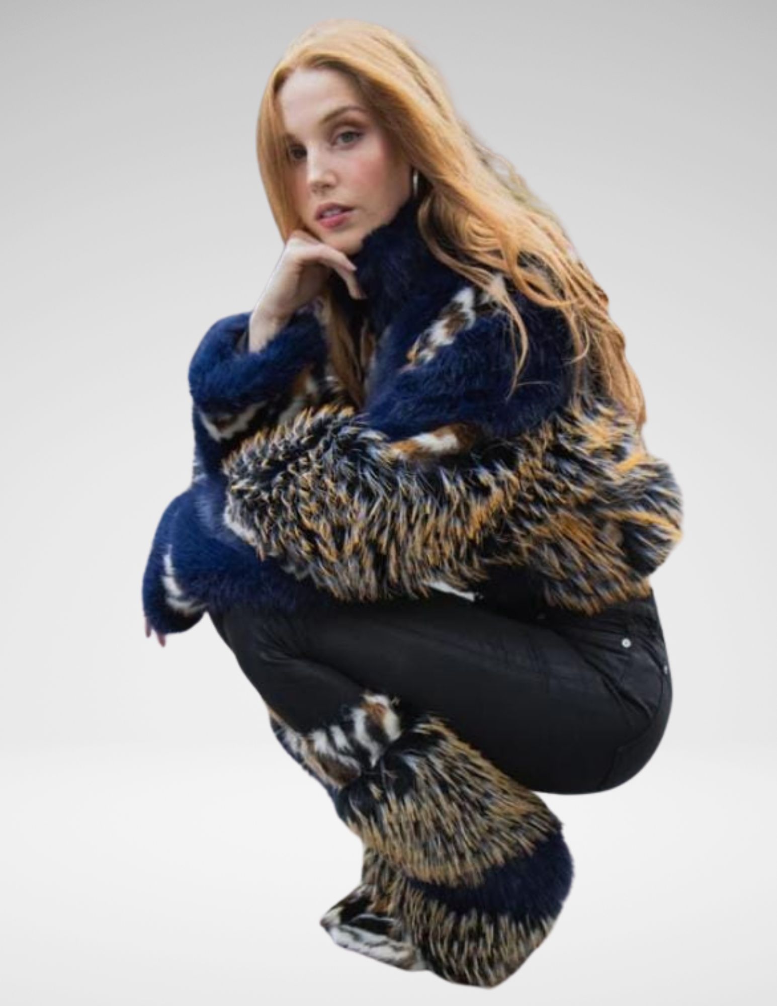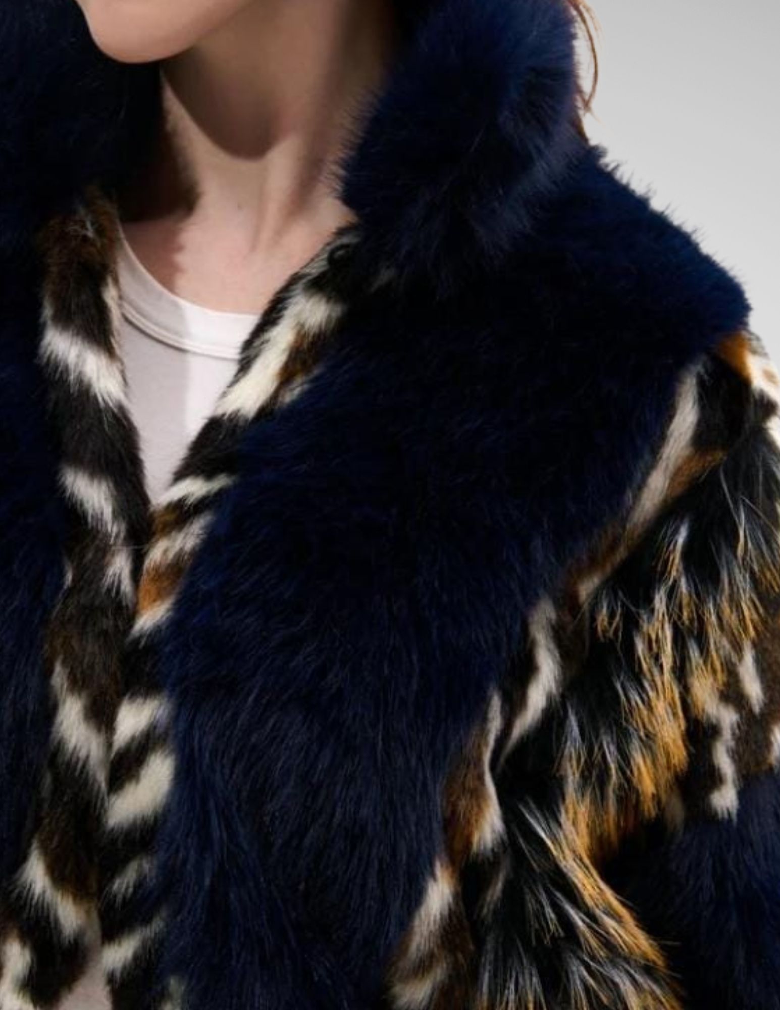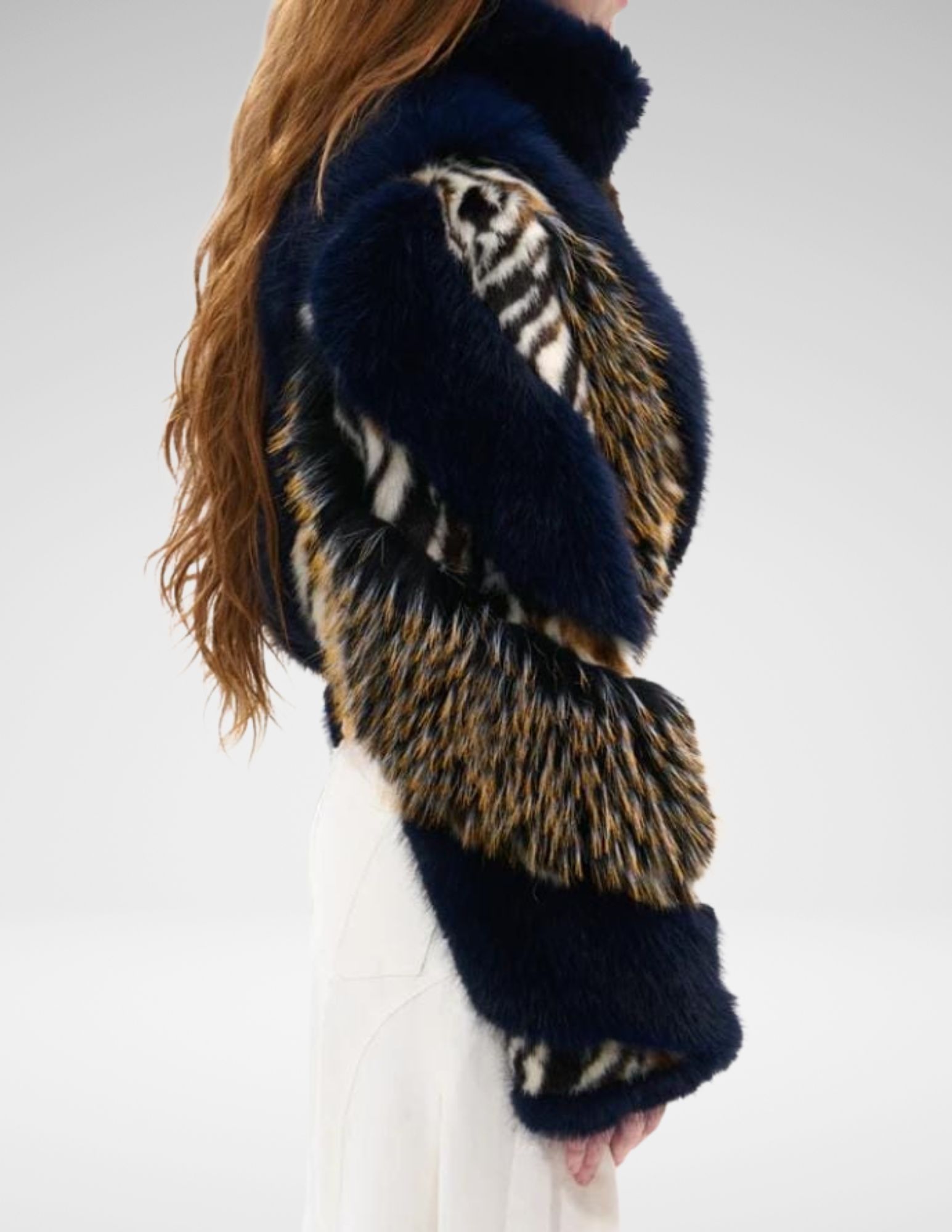 Capa corta de piel sintética con textura lujosa en tonos azules y detalles multicolores. Cuello tipo “stand”, corte abierto y diseño audaz — la prenda ideal para elevar cualquier conjunto invernal con actitud.
