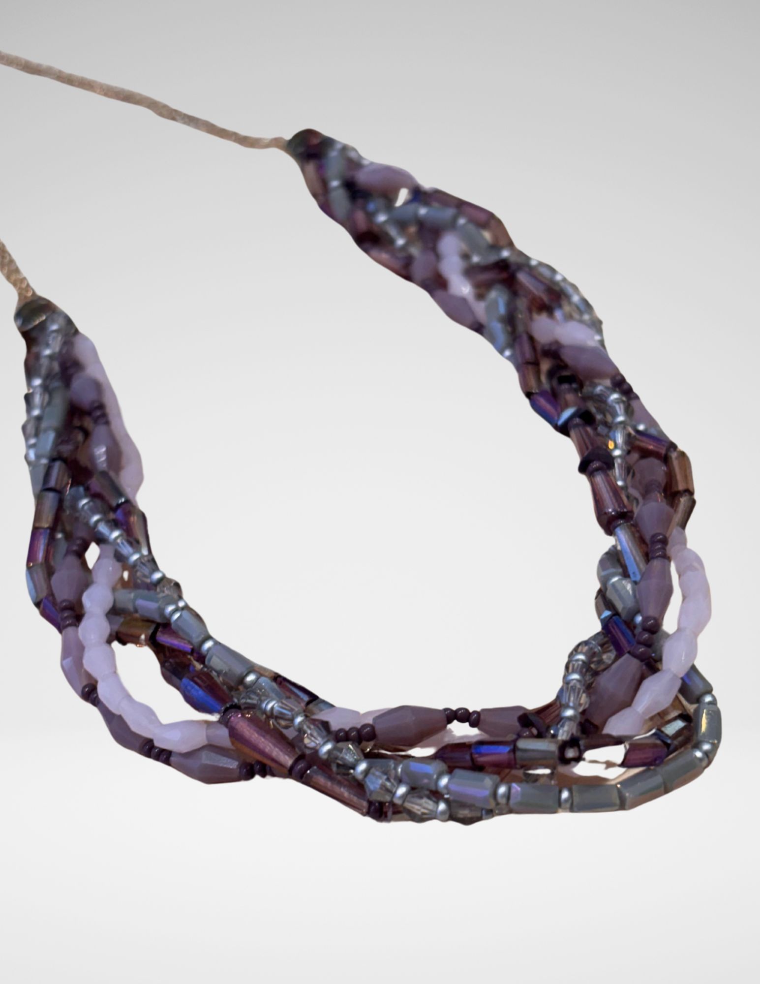 Este collar único presenta un diseño en espiral formado por cuentas en tonos púrpura, lavanda y detalles plateados que aportan un aire elegante y distintivo. Su estilo artesanal y su estructura envolvente lo convierten en una pieza llamativa, ideal para realzar cualquier atuendo con un toque creativo y sofisticado. Perfecto para quienes buscan accesorios con personalidad y encanto atemporal.