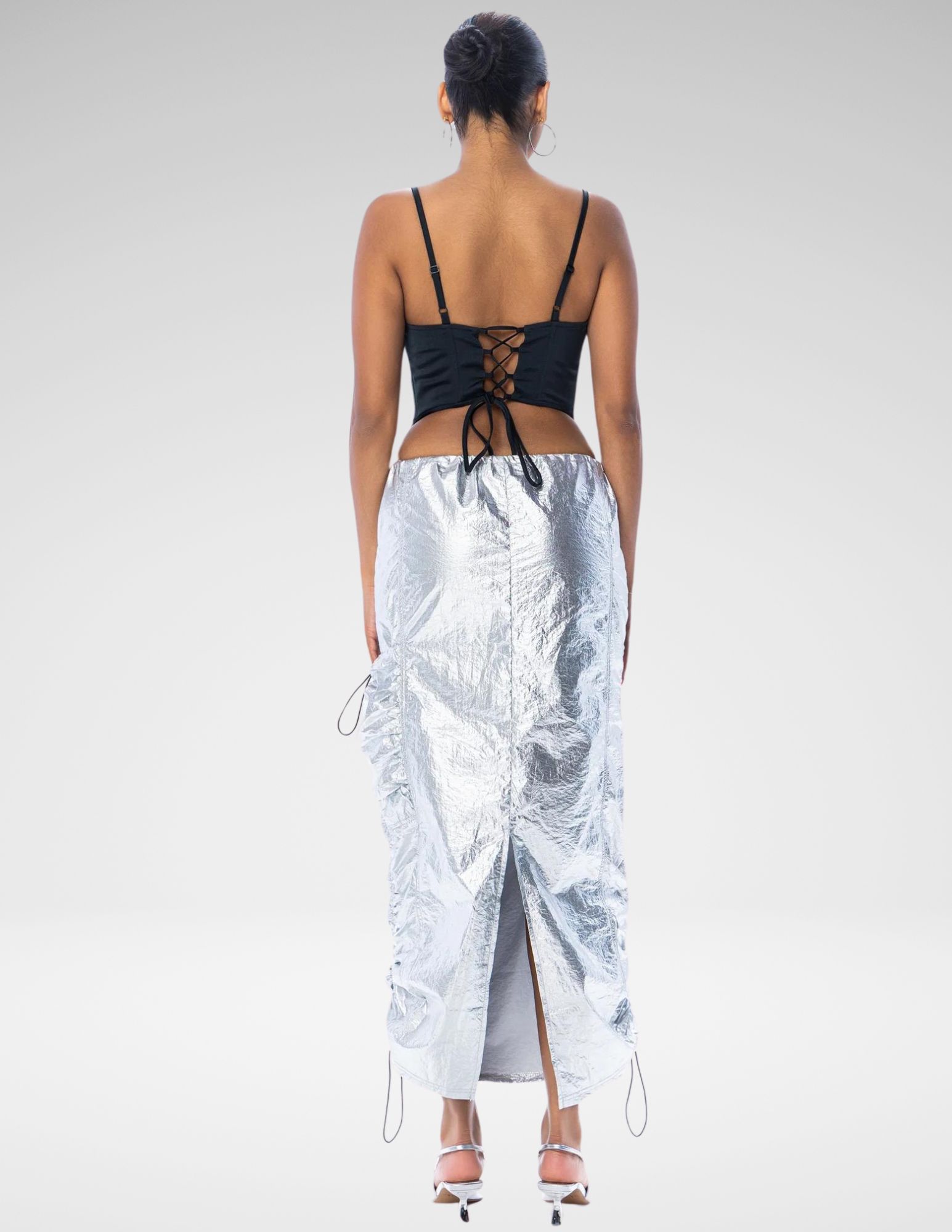 Una pieza audaz y moderna que eleva cualquier look. Con su textura arrugada y brillante, esta falda es perfecta para quienes buscan destacar. Ideal para combinar con una blusa sencilla o un top ajustado, ¡serás el centro de atención en cualquier ocasión!