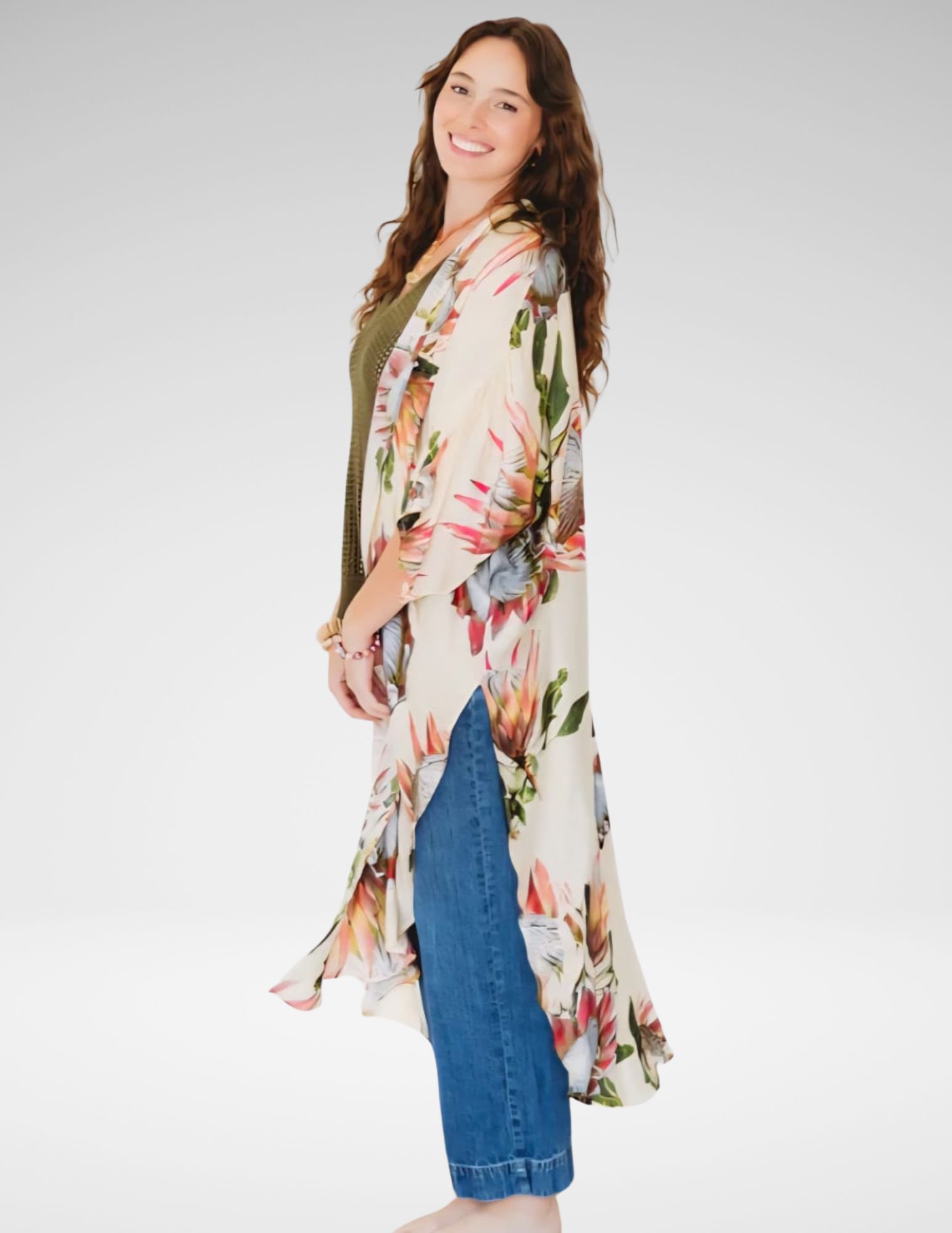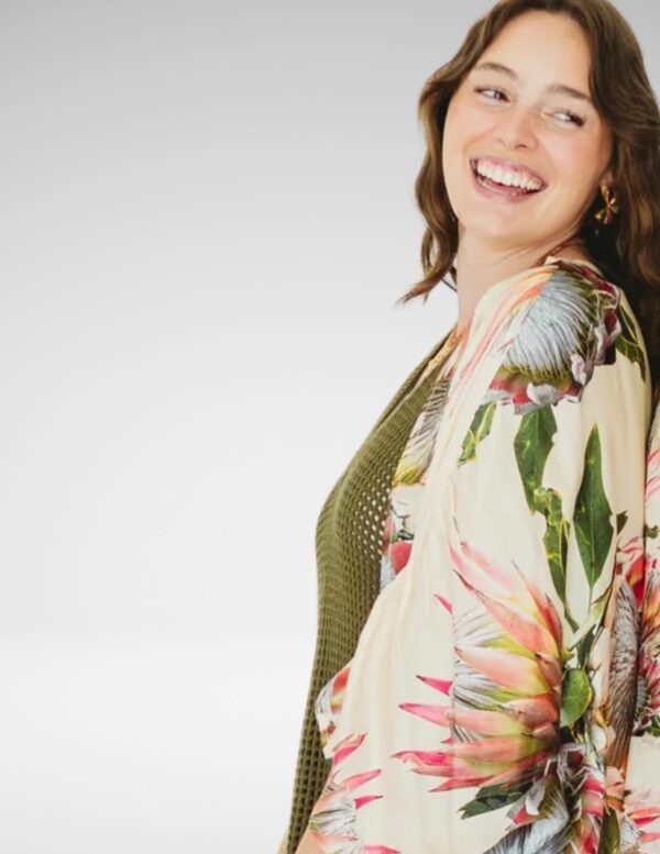 Este kimono largo presenta un diseño fluido con manga amplia que aporta movimiento y elegancia. Su estampado Protea en tonos vibrantes añade un toque de color y estilo a tu atuendo. La cintura ajustable permite un ajuste personalizado, realzando la figura de manera favorecedora. Ideal para complementar tus looks durante las temporadas de entretiempo o para ocasiones especiales.