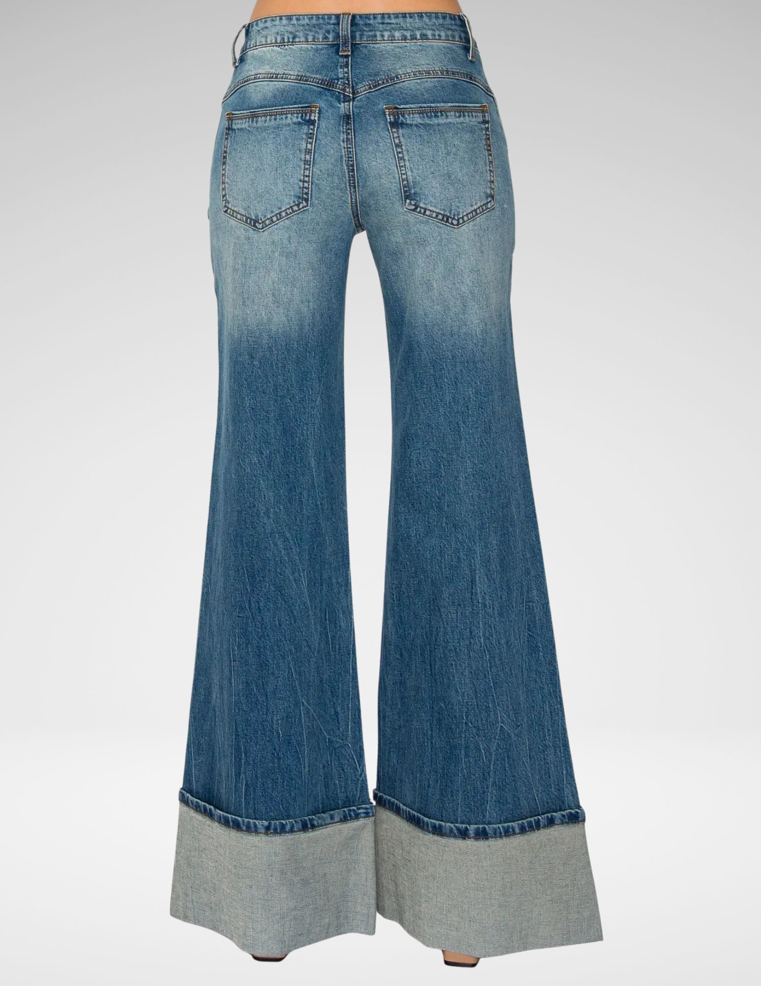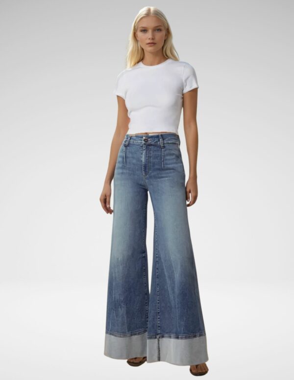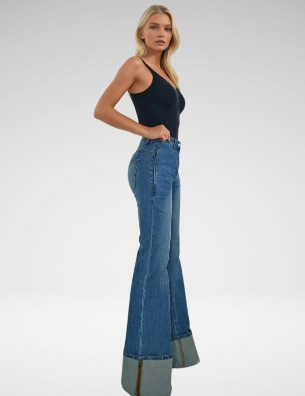 Pantalón de mezclilla clara, tiro alto y pierna acampanada que se abre desde la rodilla. Corte limpio sin adornos excesivos, ideal para combinar con tops ajustados o blusas sueltas. Un básico con onda vintage que alarga visualmente las piernas y aporta estilo retro moderno.