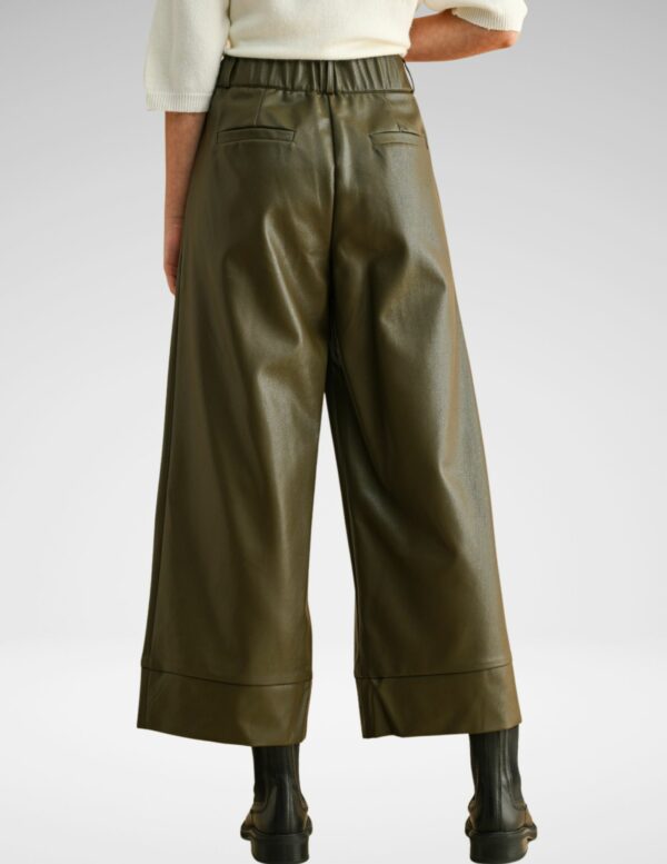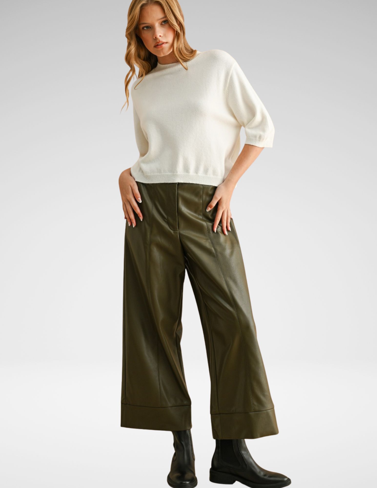 Con una silueta de talle alto que abraza y piernas amplias cortadas al tobillo, este pantalón vegano combina estilo moderno y comodidad. El acabado tipo piel le da un brillo sutil, perfecto para destacar con una camisa estructurada o equilibrarlo con una camiseta relajada. Te aporta ese toque de actitud sin perder elegancia.
