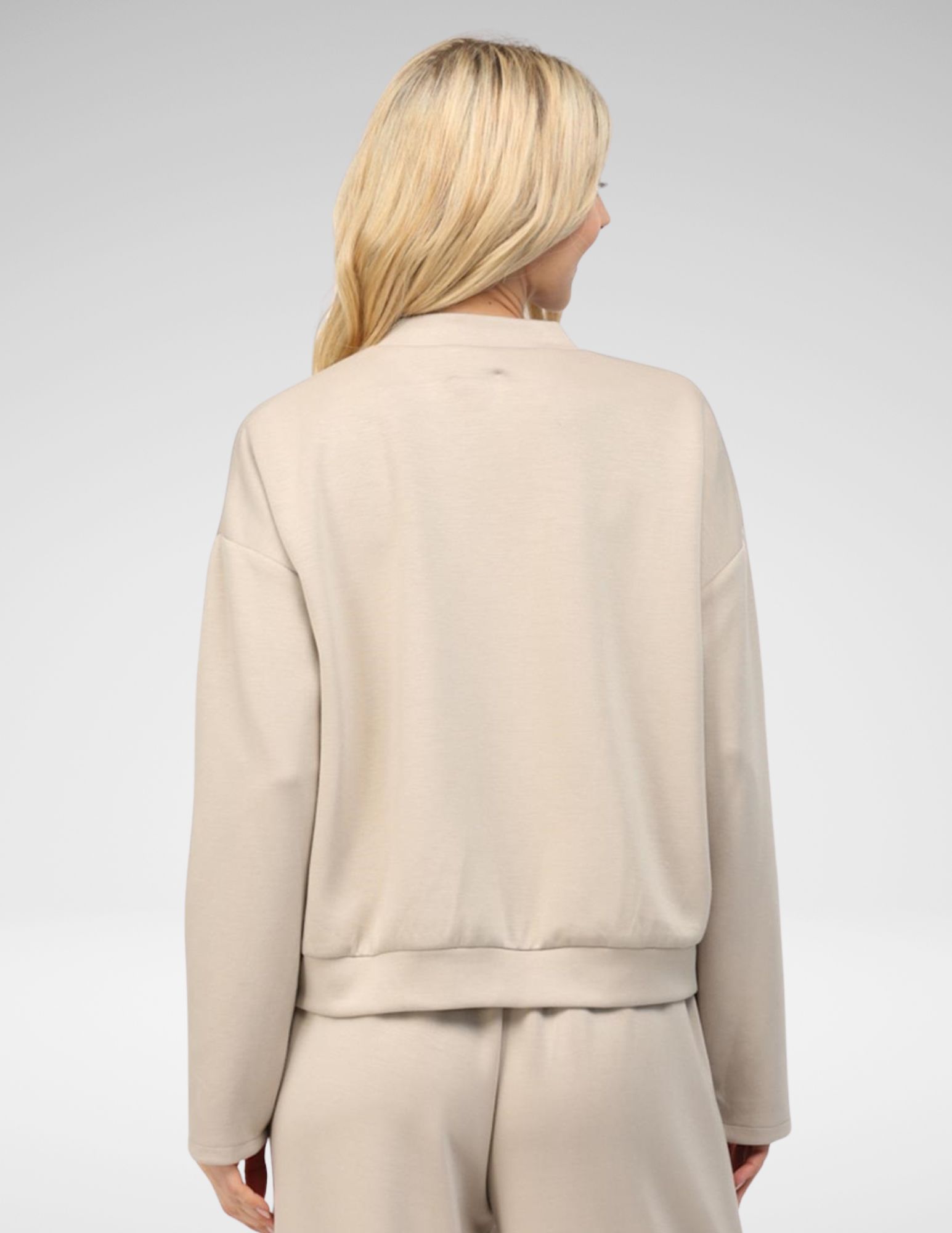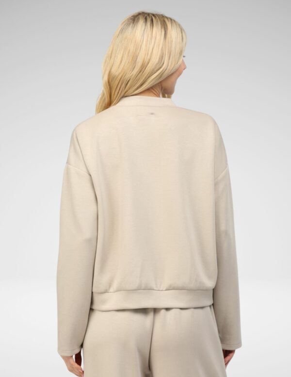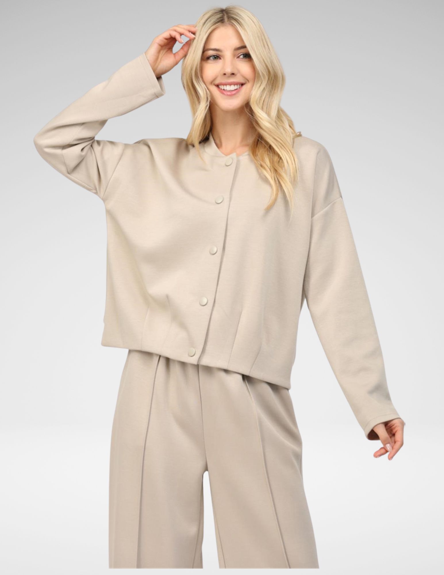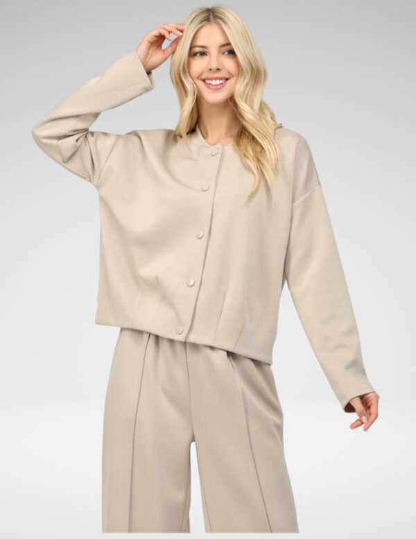 Este conjunto ofrece una combinación perfecta de estilo y comodidad. La chaqueta bomber presenta un corte recto y corto, con un cuello alzado y cierre de botones a presión, mientras que los pantalones a juego cuentan con un diseño de tiro alto y un ajuste favorecedor. Ambas piezas están confeccionadas con una mezcla suave de poliéster, viscosa y elastano, proporcionando elasticidad y confort. Ideal para quienes buscan un look coordinado y moderno para diversas ocasiones.