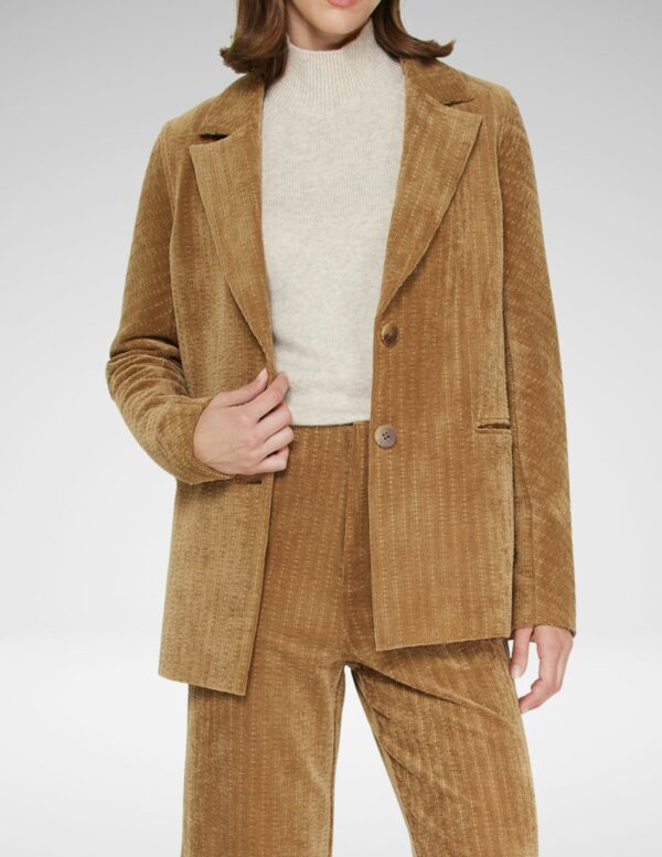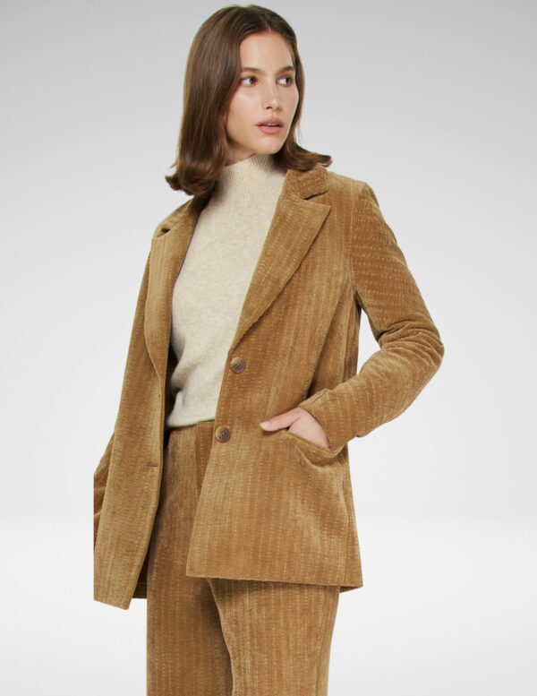 Textura rica y estructura refinada en este conjunto de blazer y pantalón en corduroy. La chaqueta aporta estilo con solapas limpias y bolsillos tipo welt, mientras que el pantalón armoniza con líneas elegantes que completan el look. Ideal para destacar con sofisticación en el trabajo, eventos sofisticados o días donde quieres ir “elevada” sin esfuerzo.