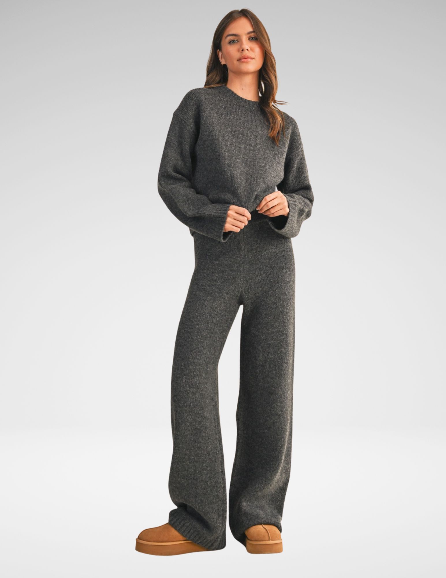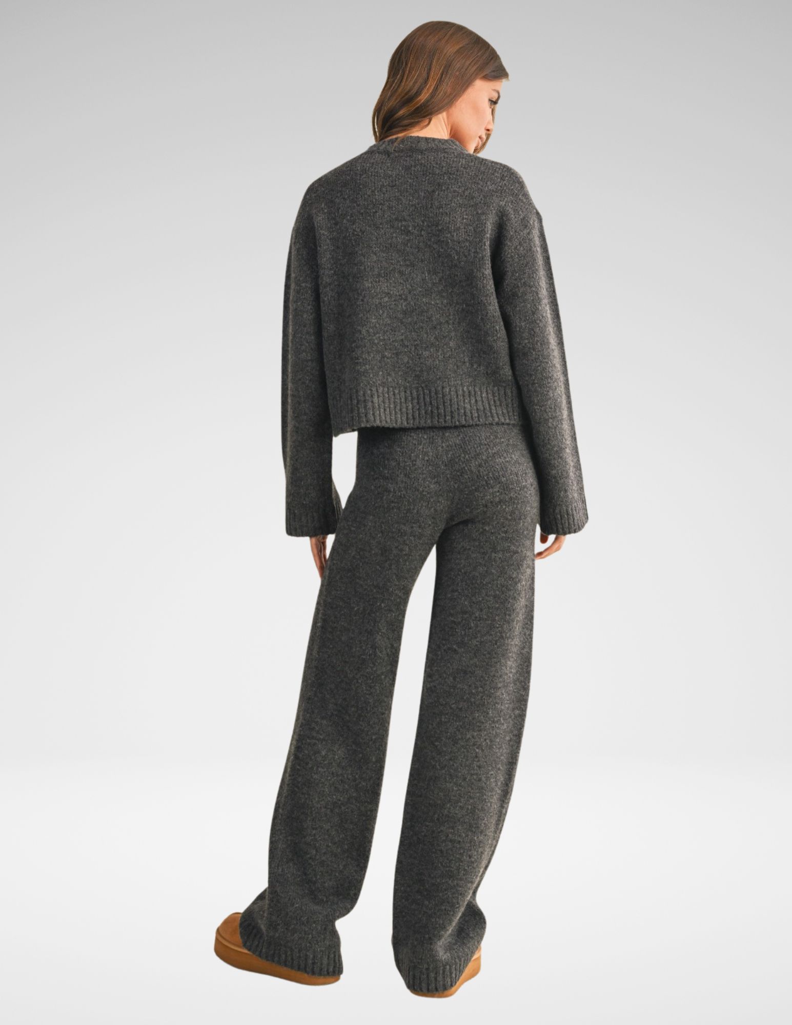 Conjunto melange que incluye top corto de punto y joggers de corte recto, ideal para esos días en que quieres comodidad sin sacrificar estilo. Perfecto para tus rutinas de descanso o para salir con un toque moderno.