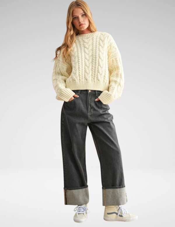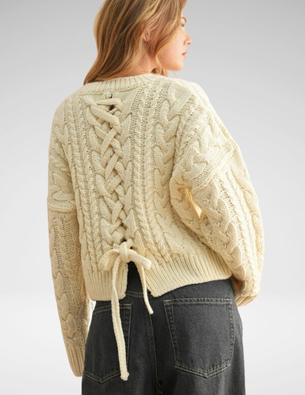 Suéter grueso de tejido cable knit con un twist: la espalda luce una trenza que rompe lo clásico. Cuello redondo, textura cozy, ideal para combinar con jeans o falda midi y lograr ese look comfy con estilo urbano.