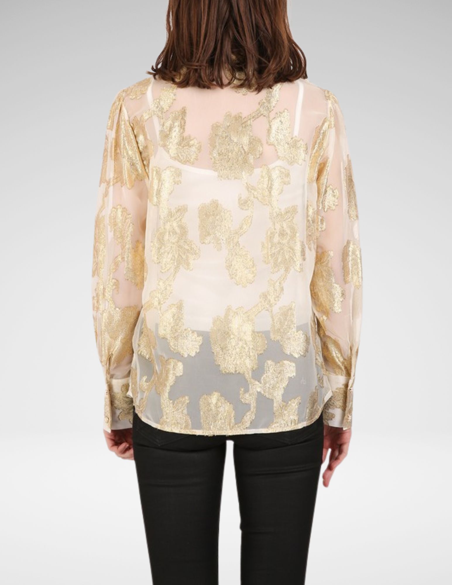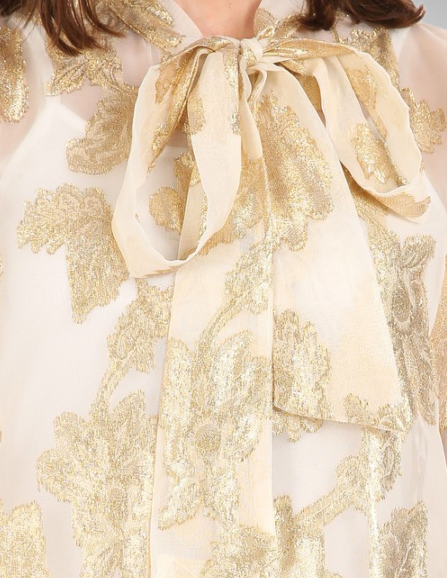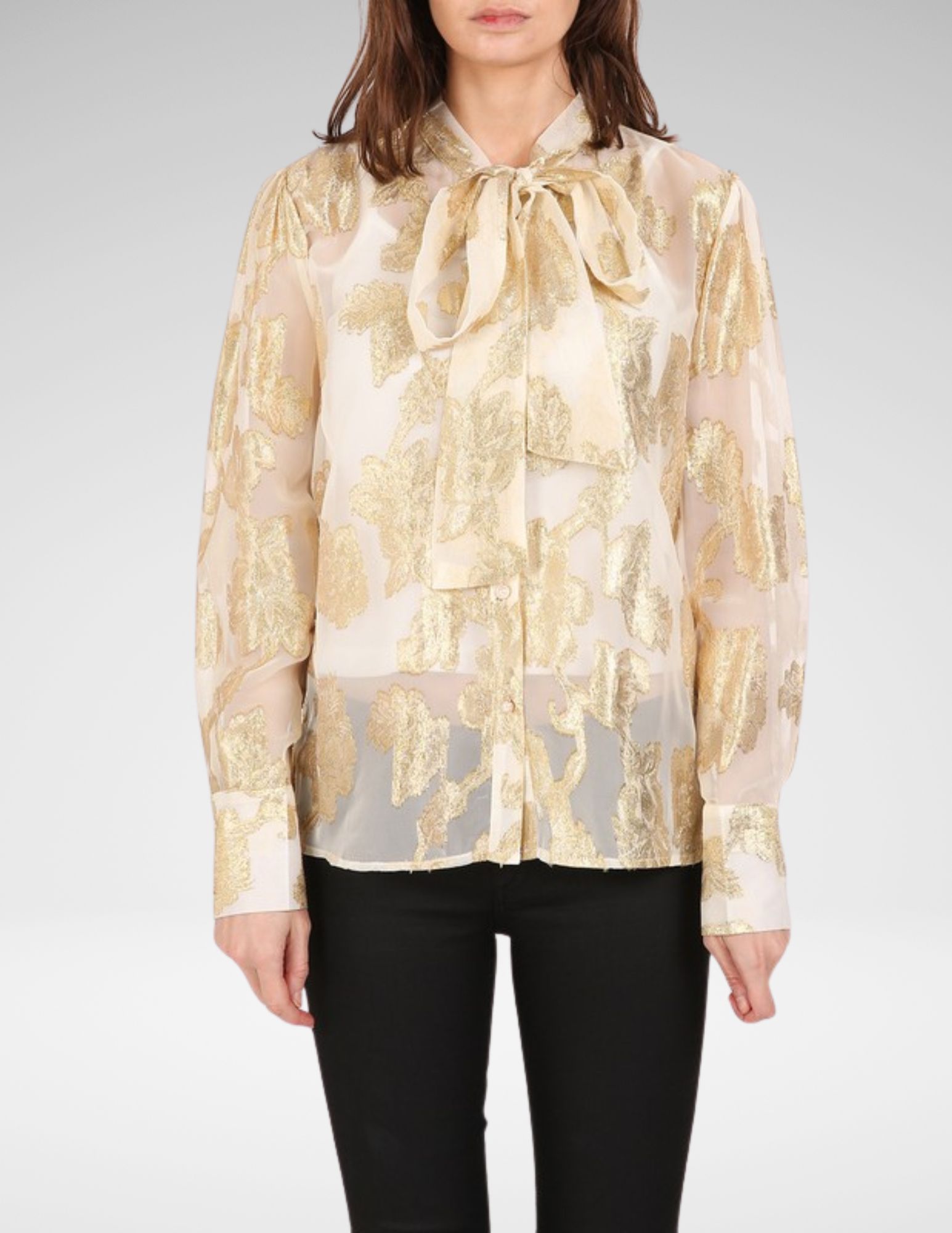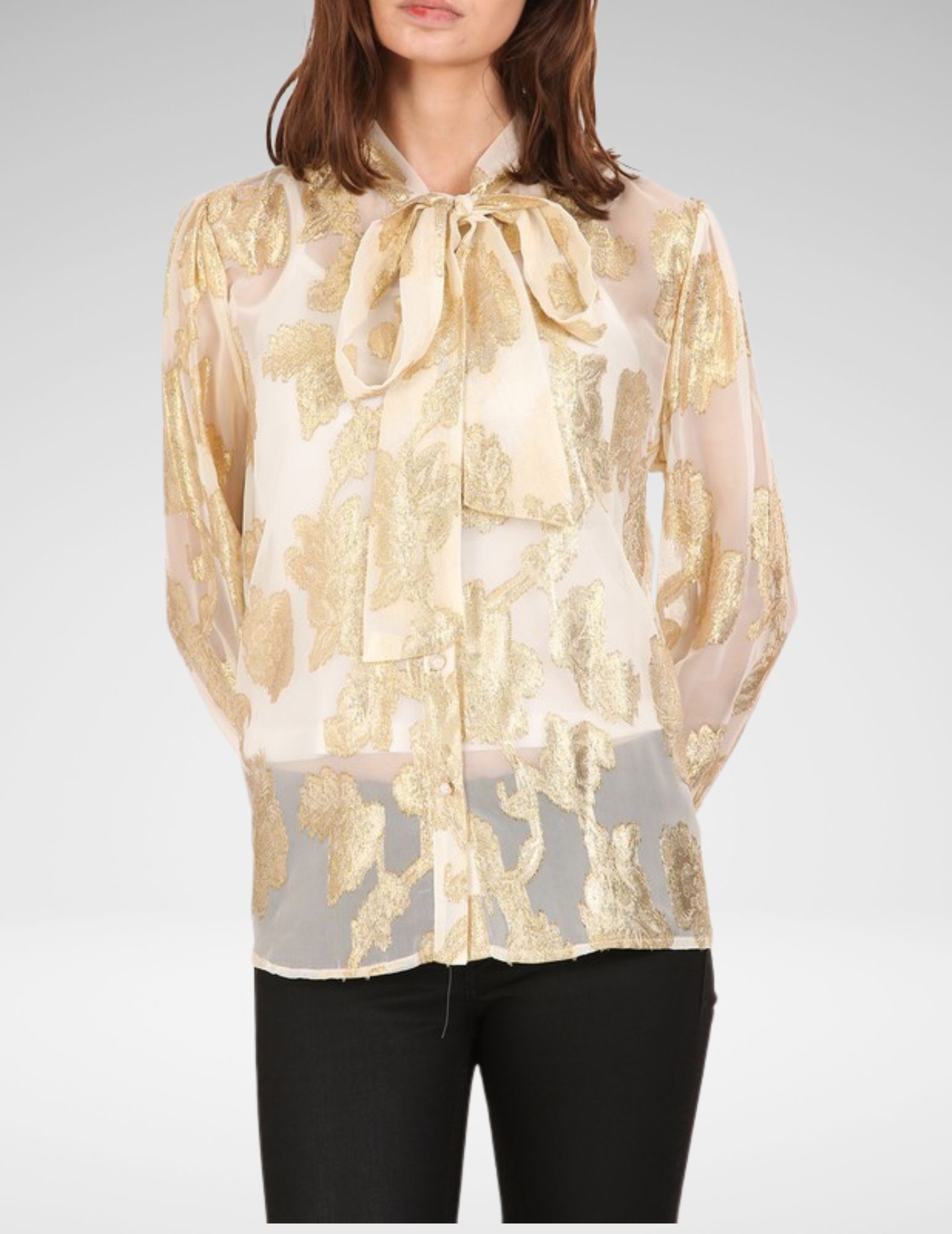 Top en tono marfil con acabado metalizado sutil y detalle de lazo al frente. Elegancia ligera que puedes combinar con falda negra para evento o jeans claros para un look creativo chic.