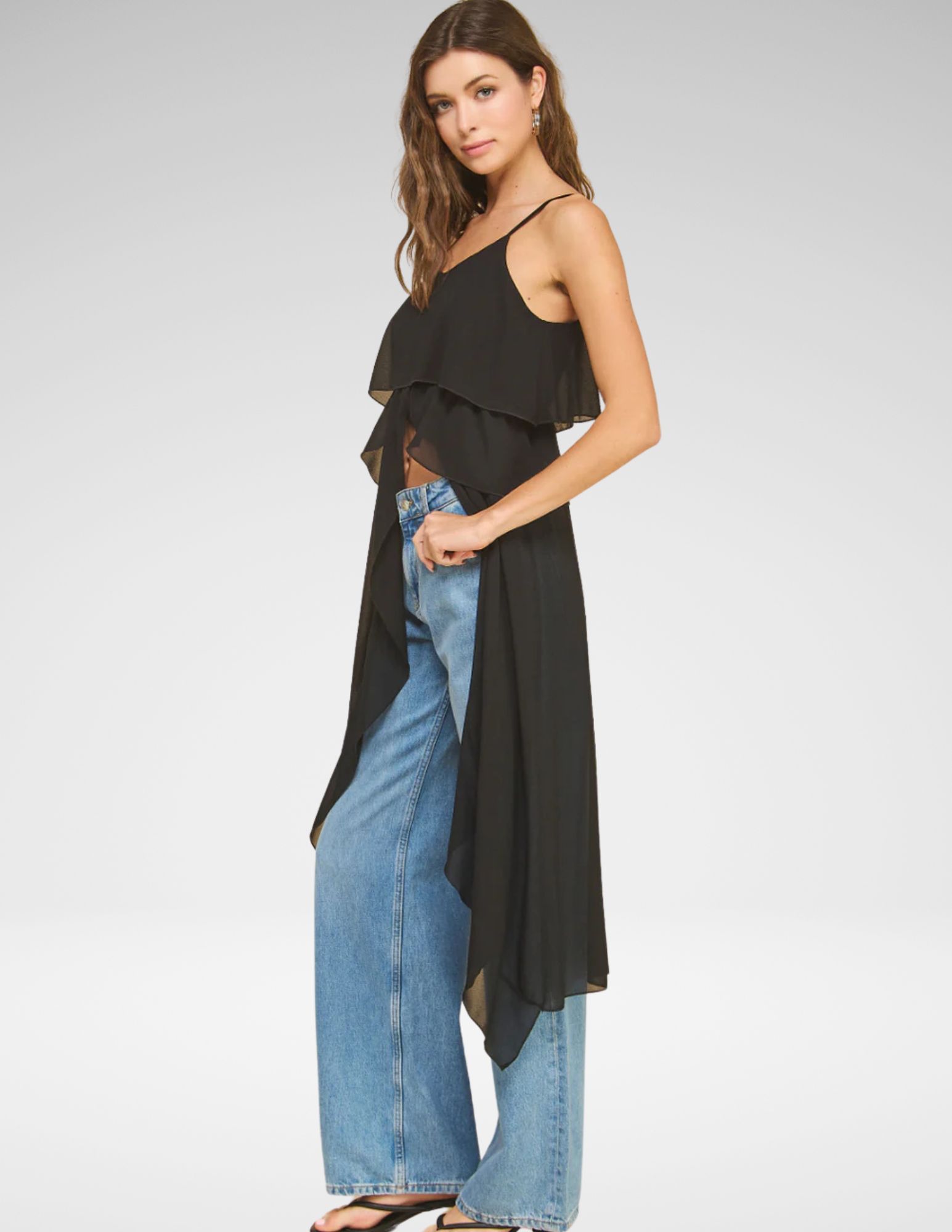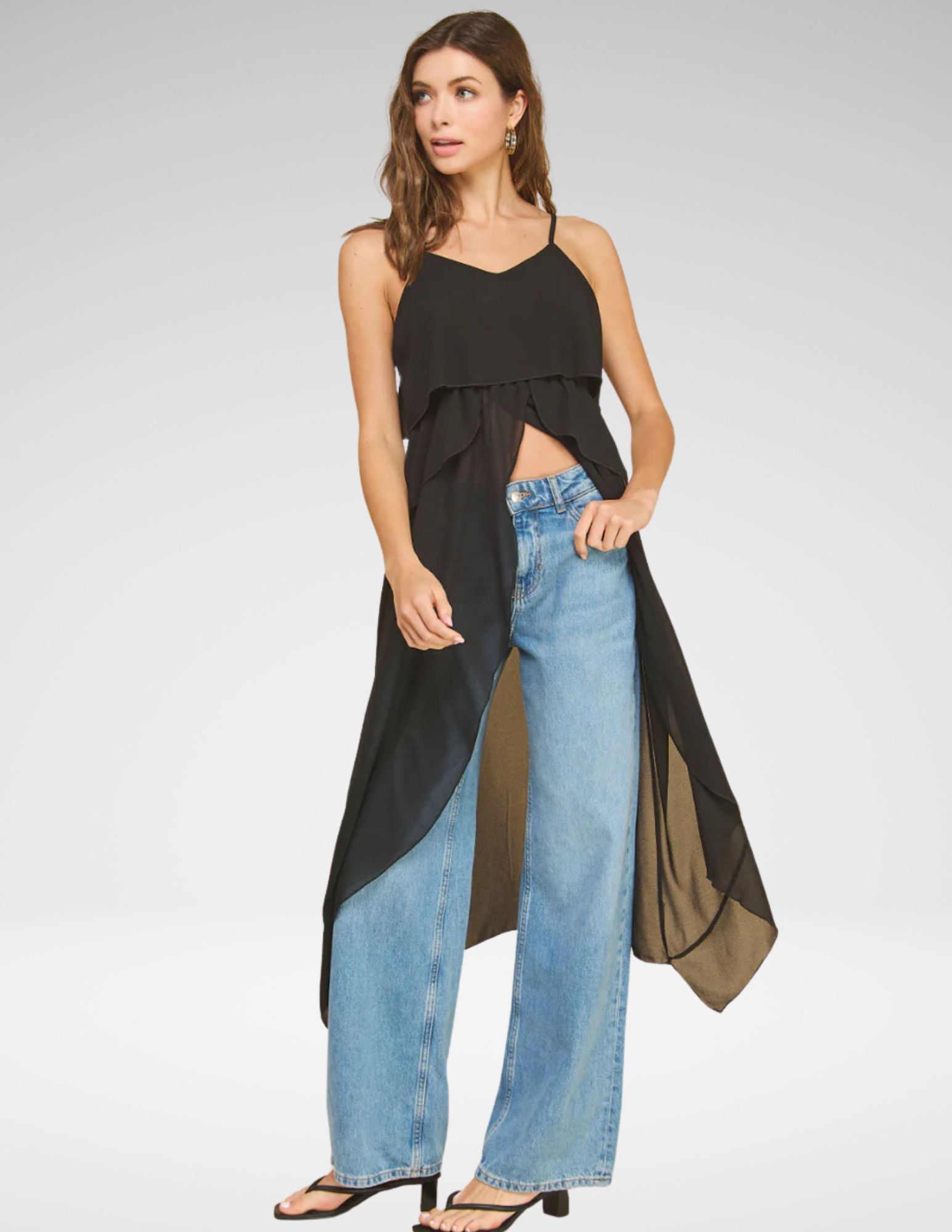 Ligero, fluido y lleno de movimiento, este top estilo túnica destaca por su diseño de tirantes delicados y una elegante abertura frontal que aporta un toque moderno y atrevido. Perfecto para llevar solo o en capas, su silueta versátil se adapta con facilidad tanto a looks casuales como más sofisticados. Una prenda pensada para fluir contigo en cualquier ocasión.