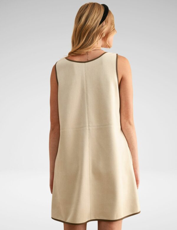 Este vestido de ante presenta un diseño de corte recto que ofrece comodidad y estilo. Su escote en V añade un toque de sofisticación, mientras que el tejido de ante proporciona una textura suave y elegante. Ideal para ocasiones especiales o para un look de oficina con estilo.