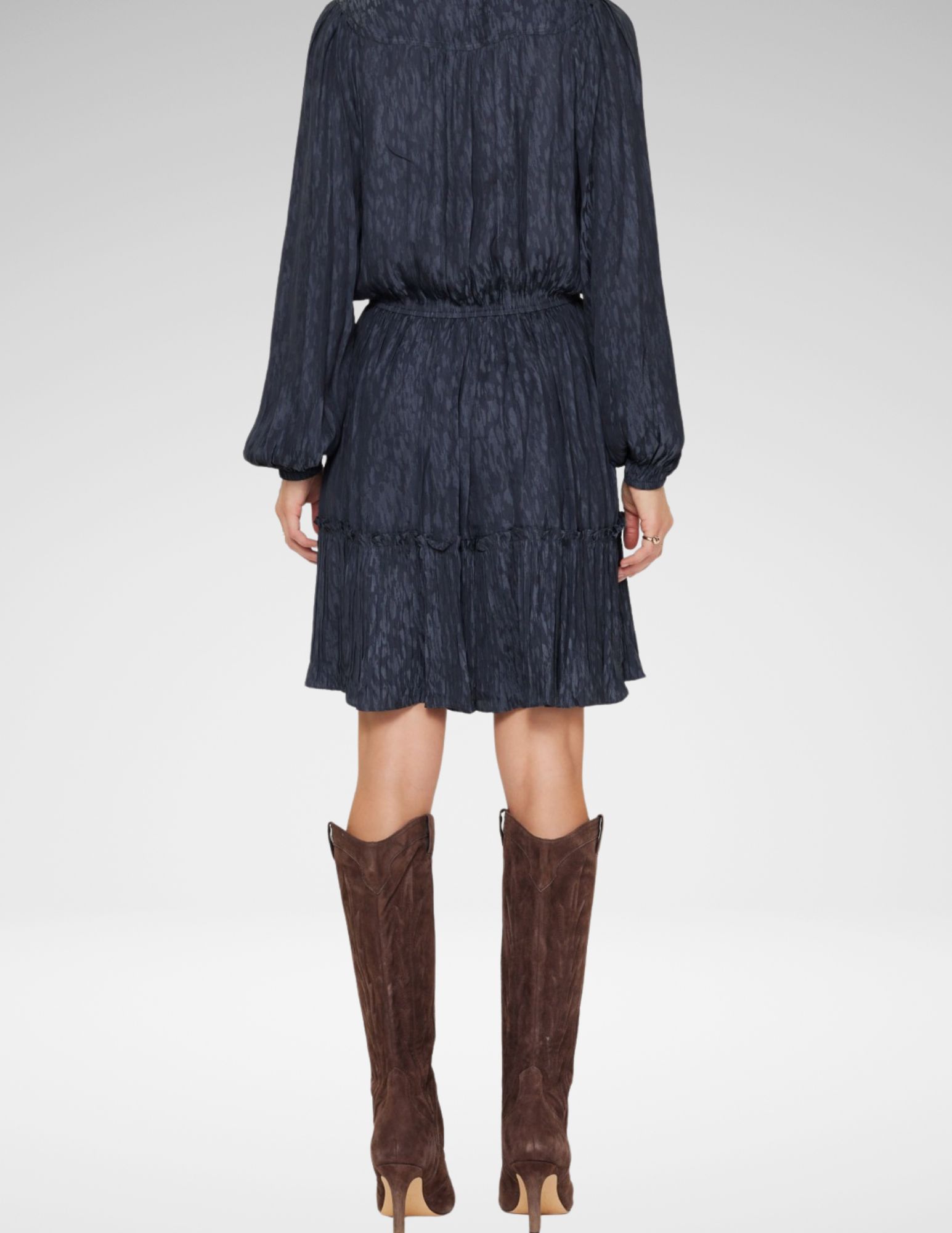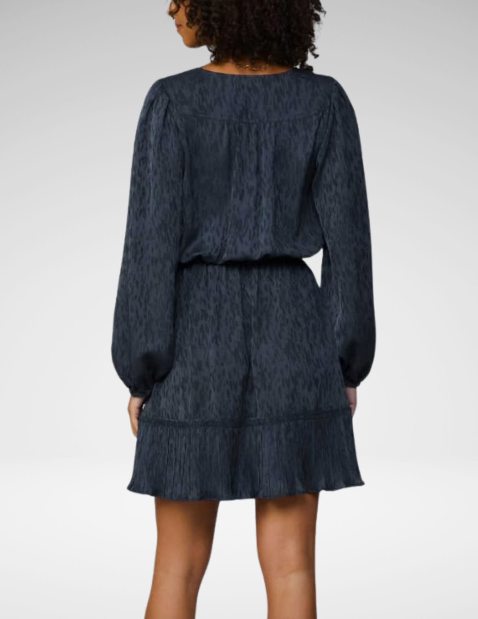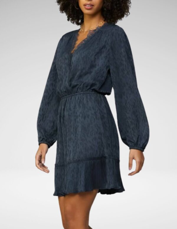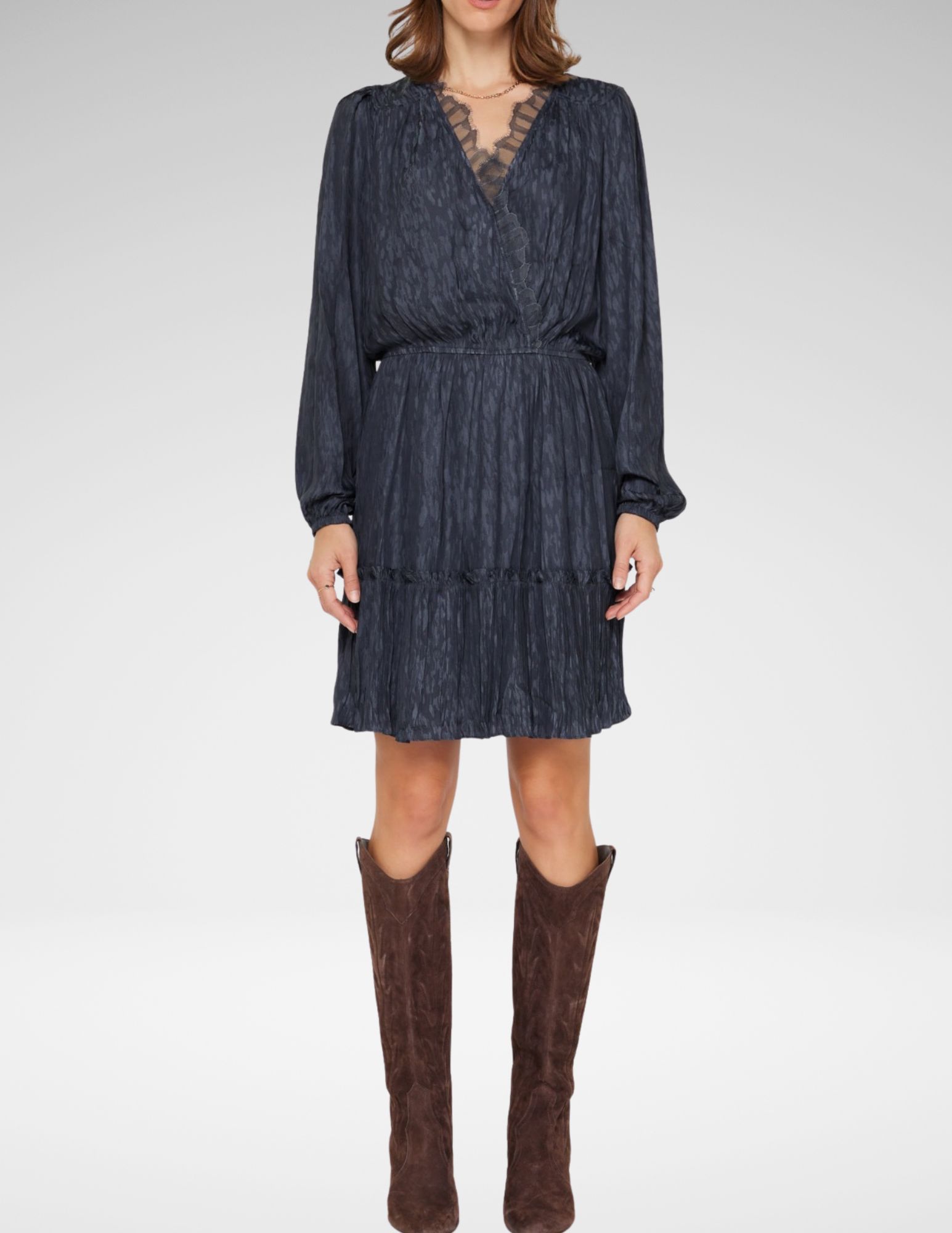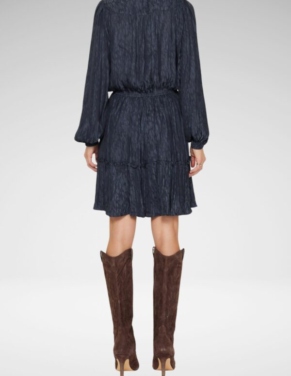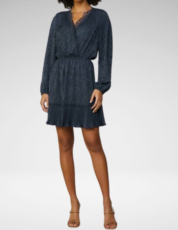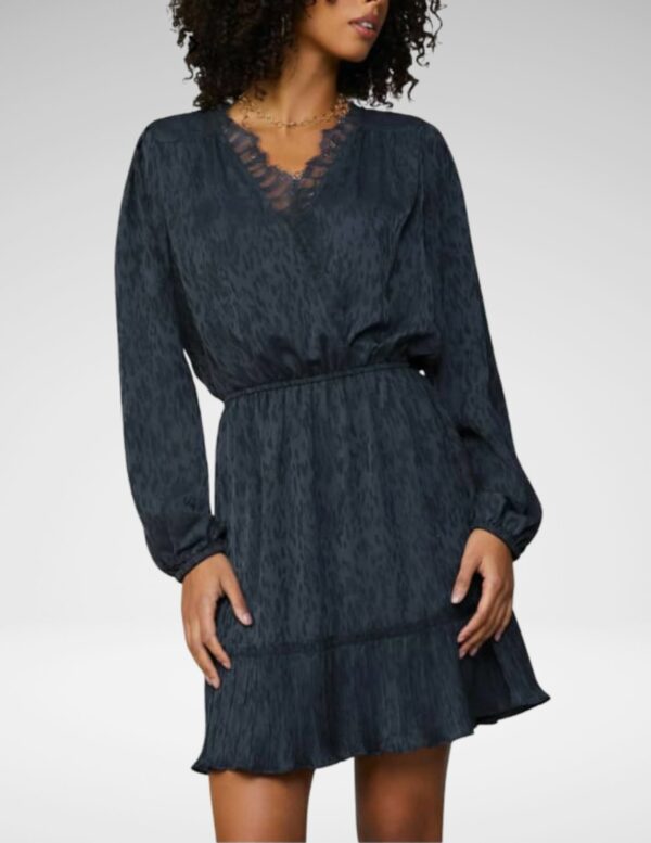 Textura jacquard elegante en tono navy realzada con delicados detalles de encaje, este vestido une sofisticación con un toque femenino. Corte estructurado pero fluido que se adapta a la figura, ideal para cenas, eventos especiales o cuando quieres destacar sin esfuerzo.