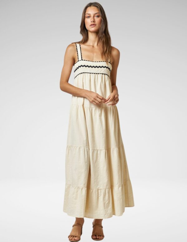 Este vestido largo en tono crema es la definición de frescura y elegancia effortless. Su diseño fluido con capas le da un movimiento encantador, mientras que su tejido de algodón lo hace ligero y cómodo. Perfecto para los días soleados o una salida relajada con un toque de sofisticación natural.