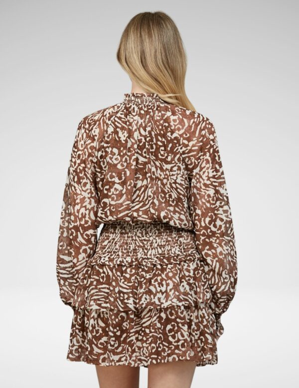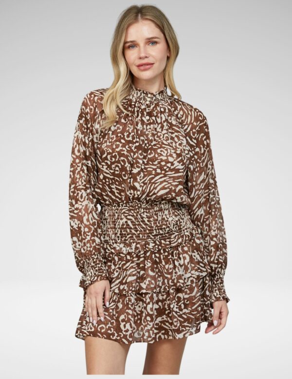 Este vestido mini presenta un diseño con estampado animal que aporta un toque salvaje y moderno. Su confección en chifón ligero y fluido garantiza comodidad y movimiento. La cintura fruncida resalta la figura, mientras que las mangas largas con puños elásticos añaden un detalle elegante. Ideal para ocasiones especiales o para un look casual con estilo.